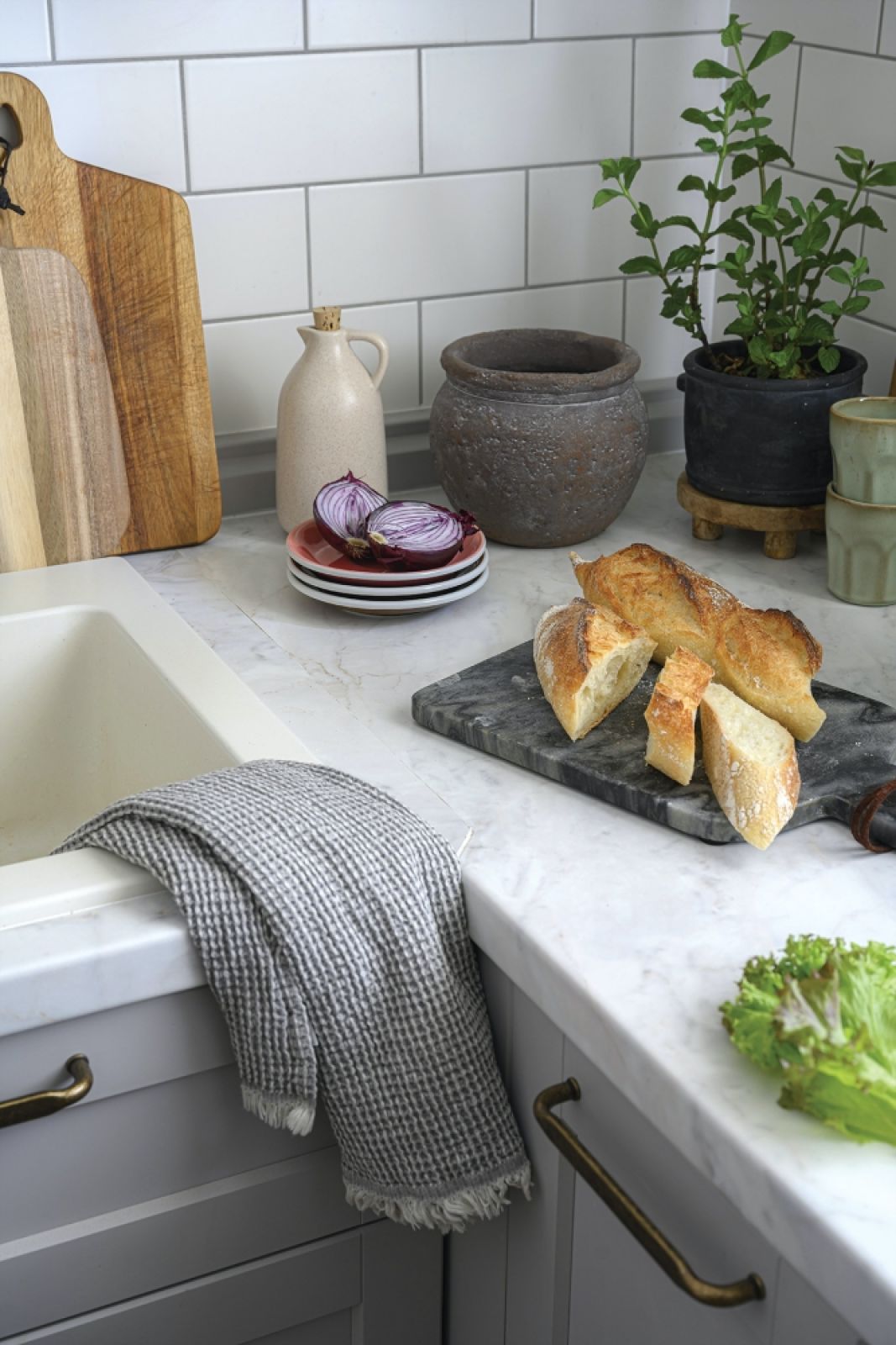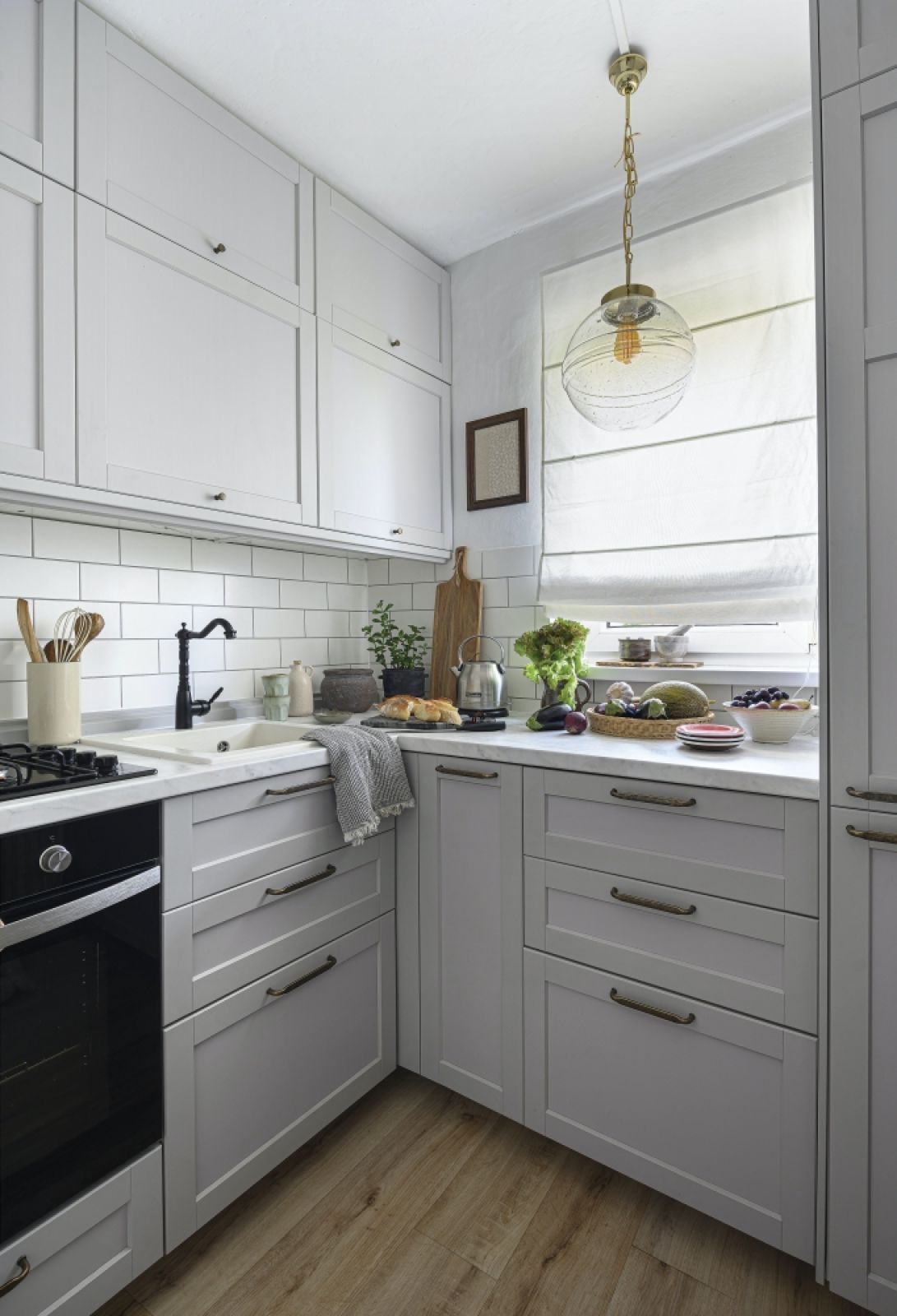 Szafki w małej kuchni (te pod oknem są płytsze niż pod ścianą) pochodzą z Ikei. Są pociągnięte do samego sufitu, dzięki czemu jest w nich sporo miejsca do przechowywania. Zarówno na ścianie w kuchni, jak i na obudowie spłuczki w łazience zastosowano białe płytki ceramiczne ułożone w cegiełkę. To jeden z detali, który sprawia, że mieszkanie zyskuje spójny charakter. Blaty w kuchni wykonano z laminatu naśladującego marmur.
