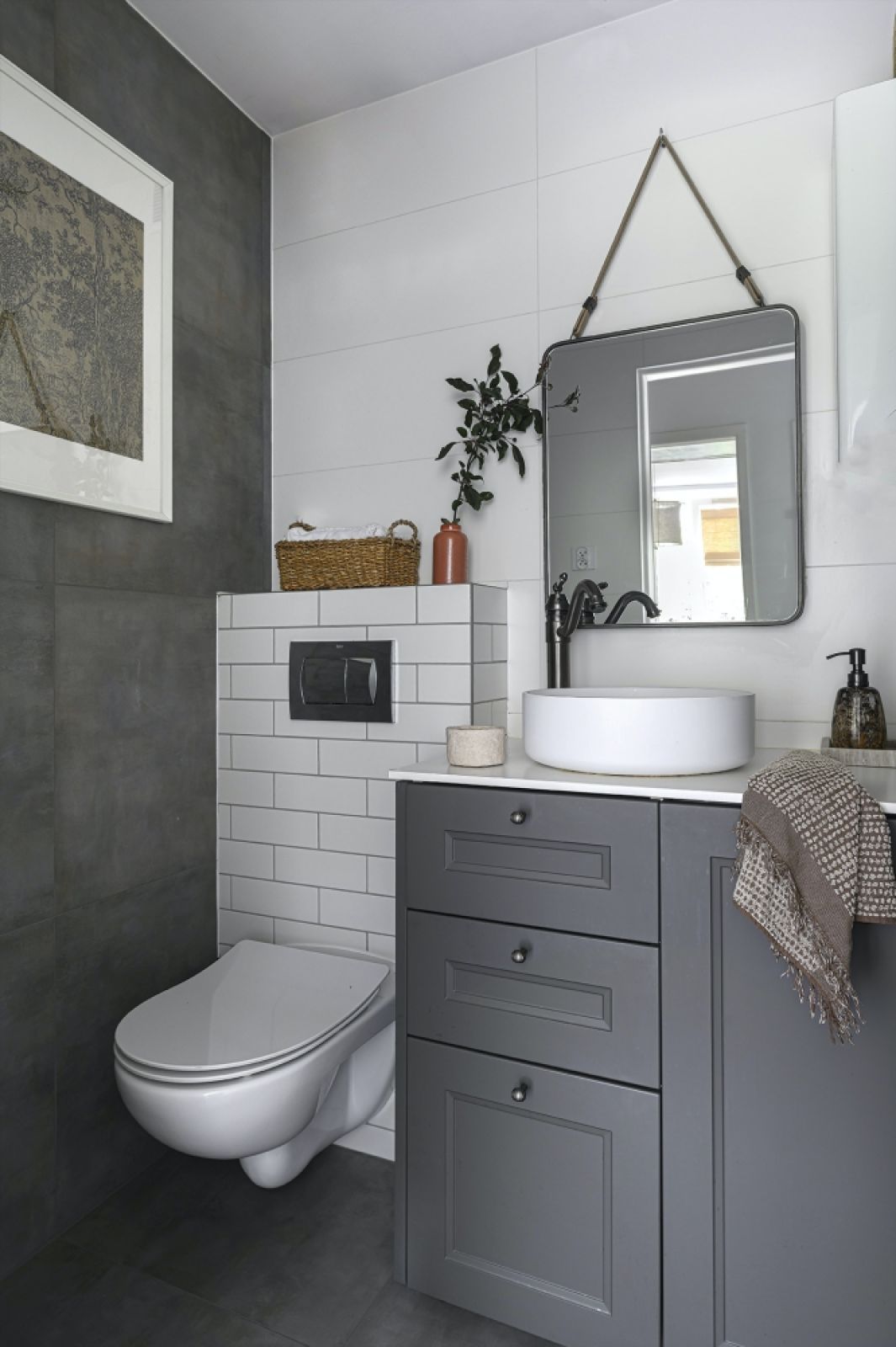 Meble wielofunkcyjne są niezbędne w małych mieszkaniach – obudowa pralki to jednocześnie pojemna szafka podumywalkowa. Powstała z kuchennych frontów i szafek z Ikei. Kolorystyczna dyscyplina wprowadza spokój – antracytowe płytki na podłodze i na jednej ze ścian nawiązują kolorem do szafki.