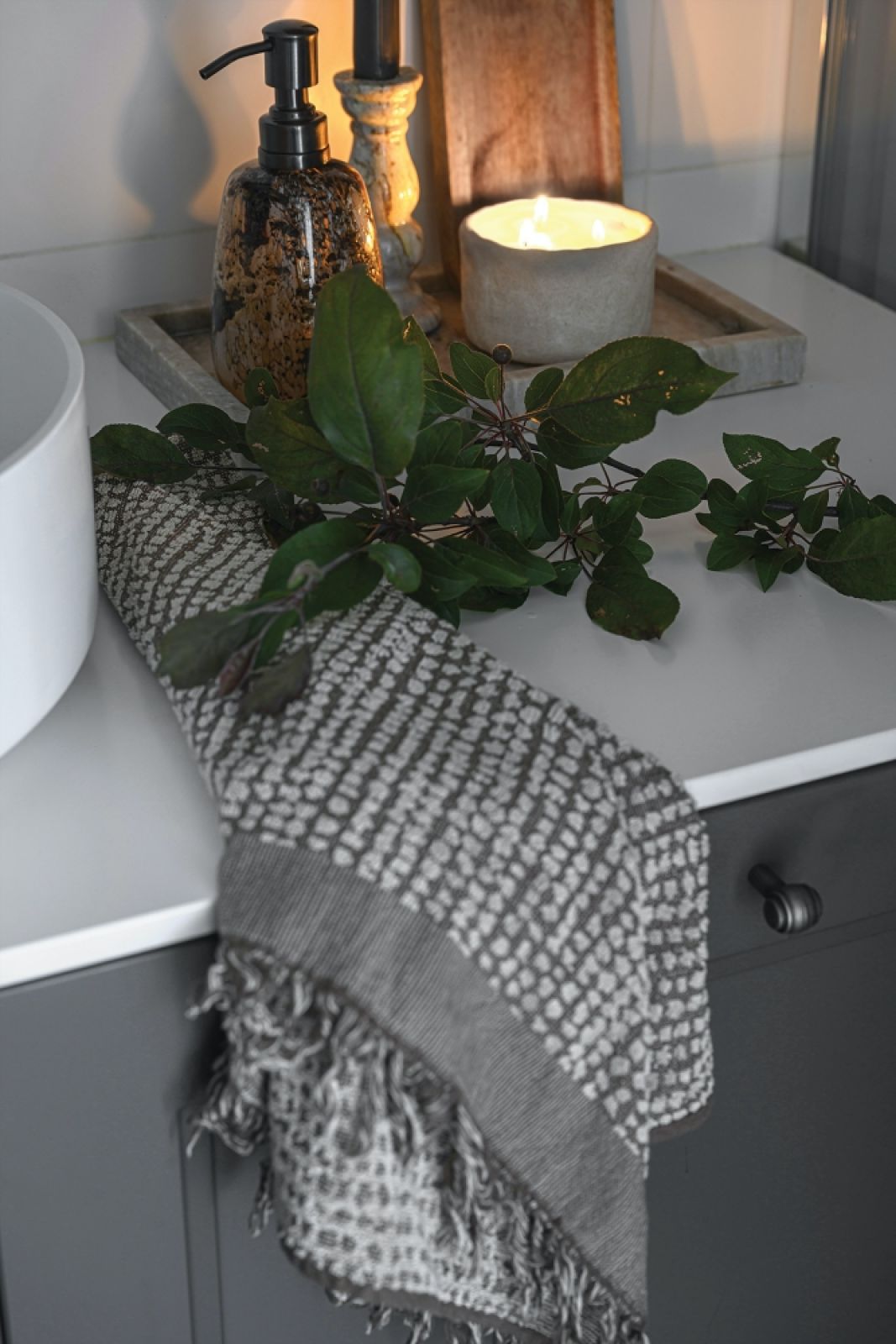 4. Łazienka z wielofunkcyjnym meblem pod umywalkę, w którym zmieściła się pralka i pojemna szafka