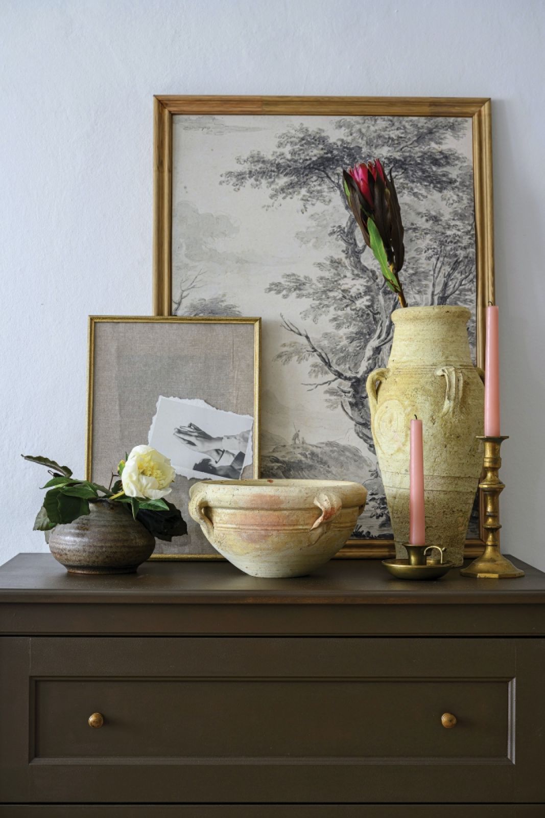 W niedużym holu znalazło się miejsce na szafę (niewidoczną na zdjęciu), wąską szafkę na buty oraz wieszak na drewnianym, zwieńczonym gzymsem panelu. Właścicielka lubi biele, beże, szarości – bo są dobrym tłem dla rozmaitych wariacji kreowanych za pomocą dodatków. Nad szafką grafika autorstwa Laury Zubel-Stoły ze sklepu muural.pl.