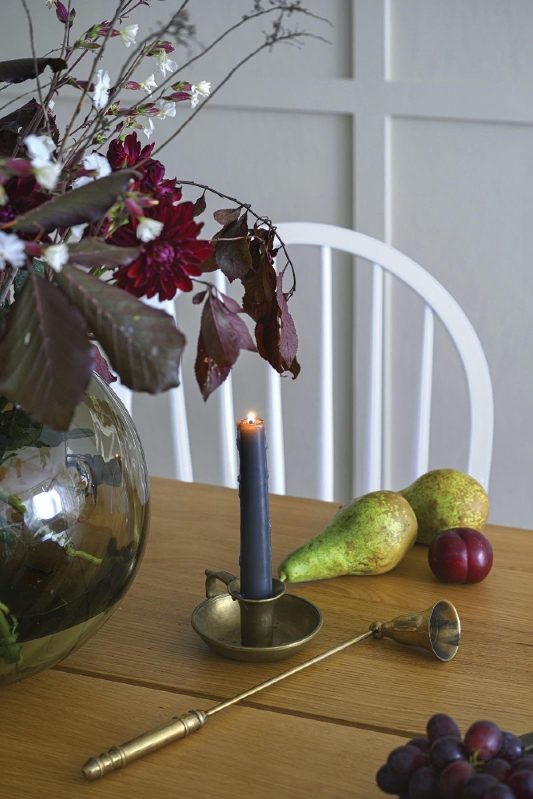 W salonie z jadalnią elementy stylu modern farmhouse (regał, stół, krzesła) mieszają się z akcentami polskiego vintage, jak fotel z lat 60. Regał, którego kolor trudno określić – niczym kameleon zmienia się w zależności od oświetlenia – umownie wydziela w salonie kącik jadalny.