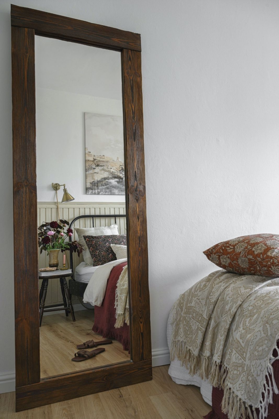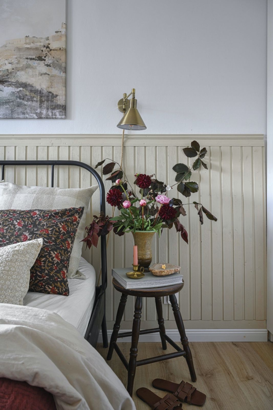 Na ścianie inspirowana amerykańskim stylem farmhouse drewniana boazeria. Nawiązuje kolorystycznie do regału w jadalni i ociepla wnętrze. Zamiast klasycznych szafek nocnych – PRL-owskie taborety z Jasienicy. Grafika nad łóżkiem Laury Zubel-Stoły ze sklepu muural.pl.