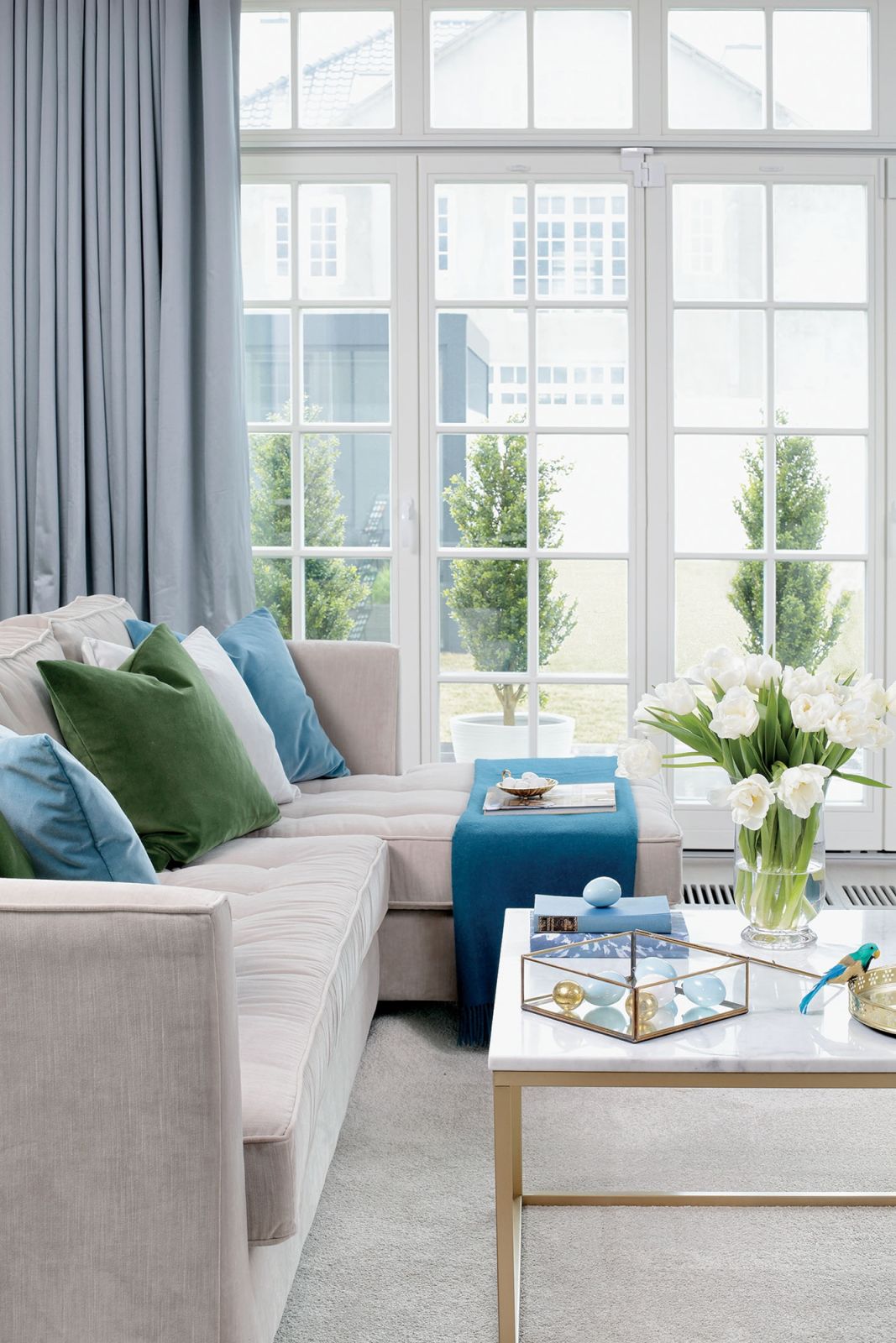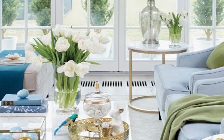 Wyposażenie AGD w kuchni to SMEG, ceramika i baterie łazienkowe – Duravit oraz dizajnerski Axor. Wielkanocnej stylizacji – na życzenie pana domu – podjęły się nasze współpracowniczki: stylistka Agnieszka Głowacka z Lawenda.co w Kazimierzu nad Wisłą i fotografka Aneta Tryczyńska. – Nasz pomysł na dom w wiosennym wydaniu to zestawienie modnych w tym sezonie złota, zieleni oraz błękitu, zarówno na tkaninach, porcelanowych ozdobach, jak i w dekoracjach. Zależało nam na ożywieniu kolorem monochromatycznego wnętrza, nadaniu mu lekkości i świątecznej przytulności – dodają.