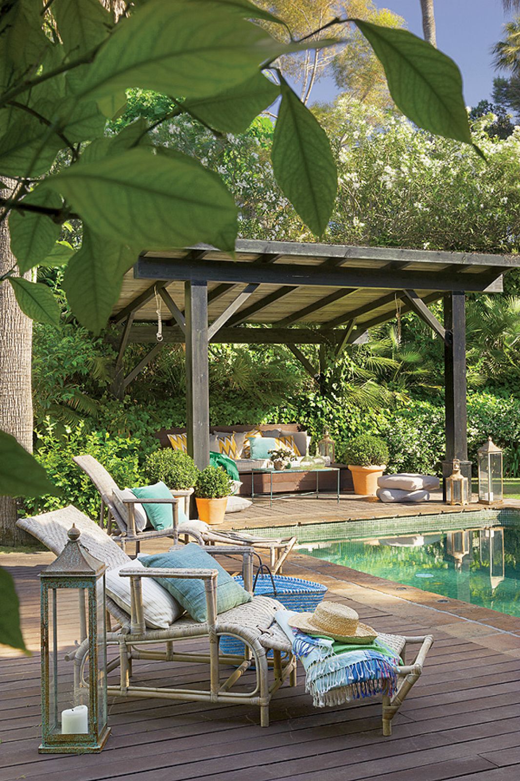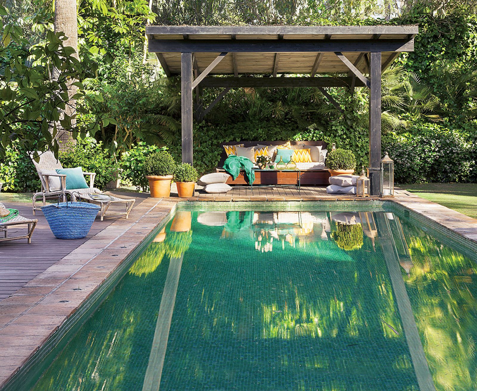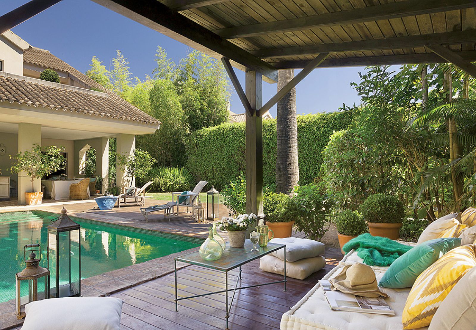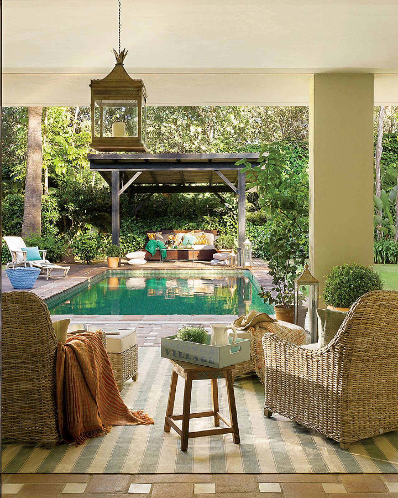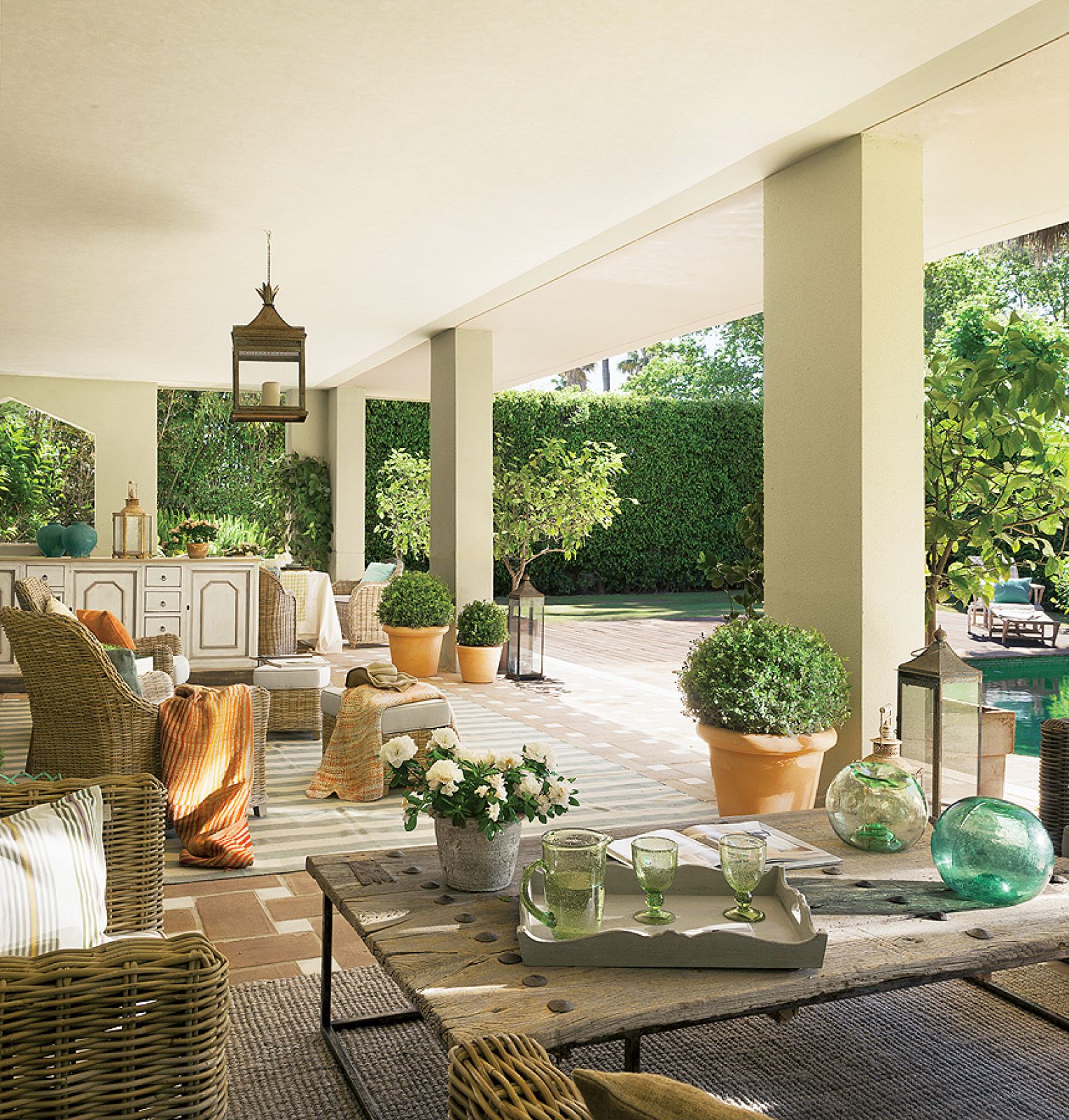 Owa oaza to kilkaset metrów ogrodu z równo przystrzyżonym trawnikiem, figowcami, winoroślą i basenem. Ale co najważniejsze, widoki mieli zagwarantowane przez okrągły rok, bo wszystkie okna (ogromne, rozsuwane) wychodzą właśnie na patio.