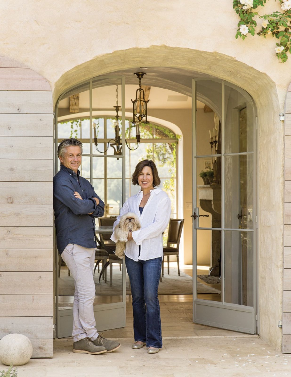 Brooke i Steve Giannetti znają się na rzeczy, bo od lat prowadzą pracownię projektową. On jest architektem, ona zajmuje się wystrojem wnętrz. Dodatkowo mają własną linię mebli. – Patina Style to miłość do naturalnych materiałów, które pięknie się starzeją i zmieniają z czasem – wyjaśnia Brooke. – W przypadku antyków każda niedoskonałość coś o nich mówi, tworzy historię – dodaje Steve. Gdy zdecydowali się zbudować nowy dom, wiedzieli, że będzie właśnie taki: pełen kamienia i drewna, trochę kalifornijski i trochę francuski. Przede wszystkim wygodny.