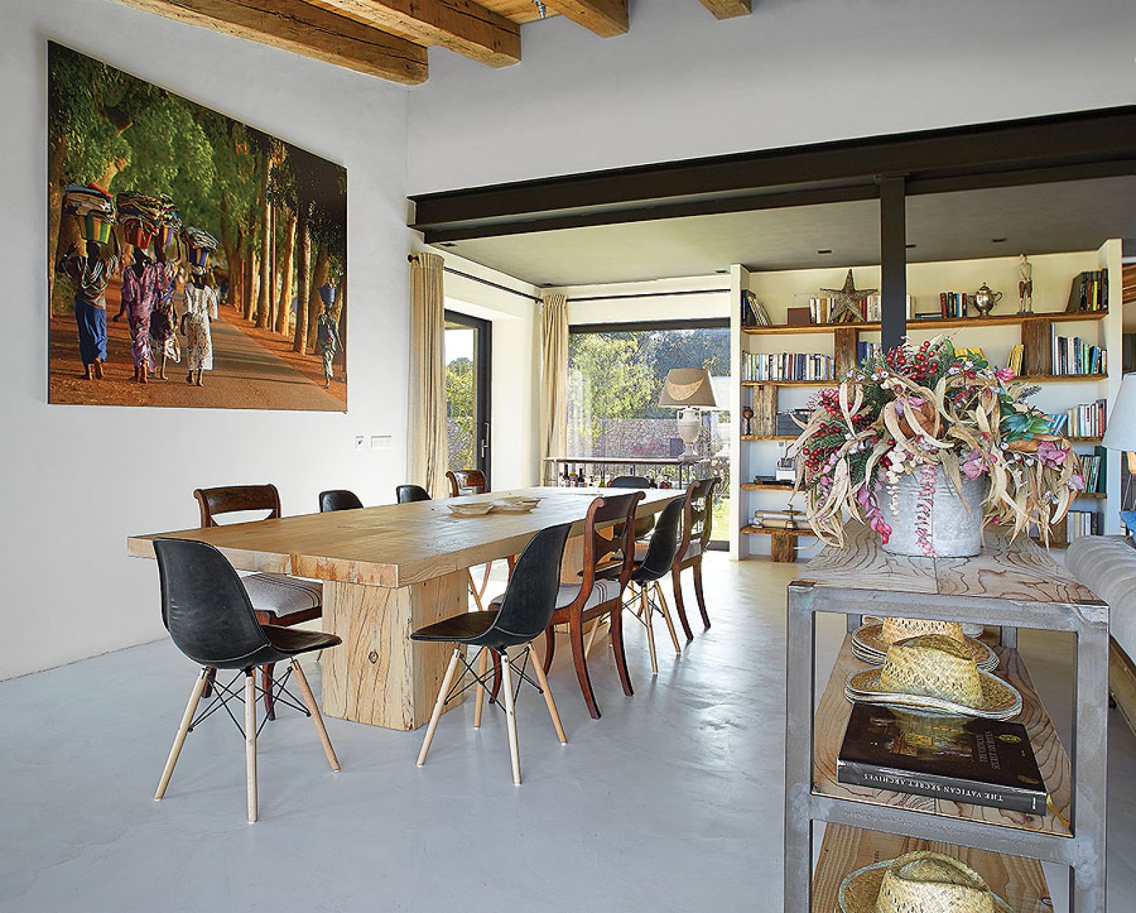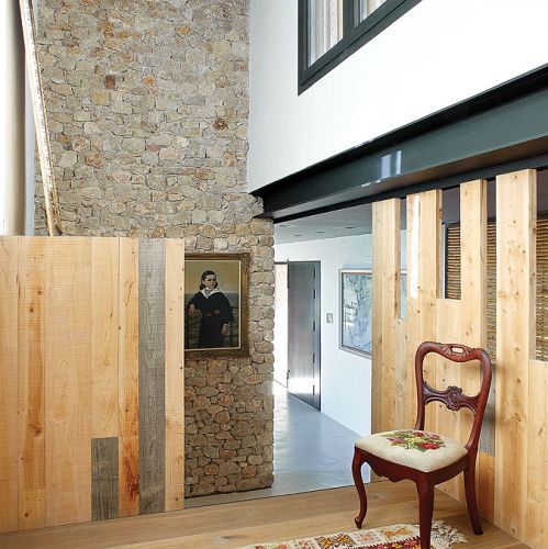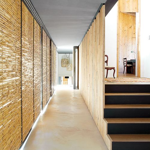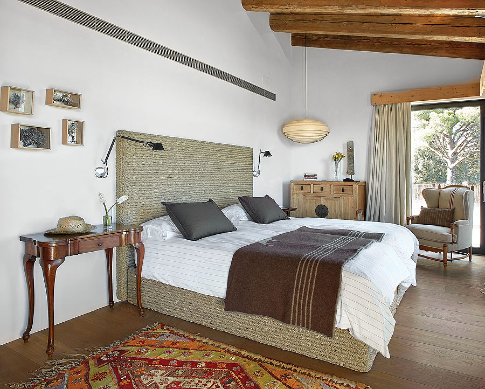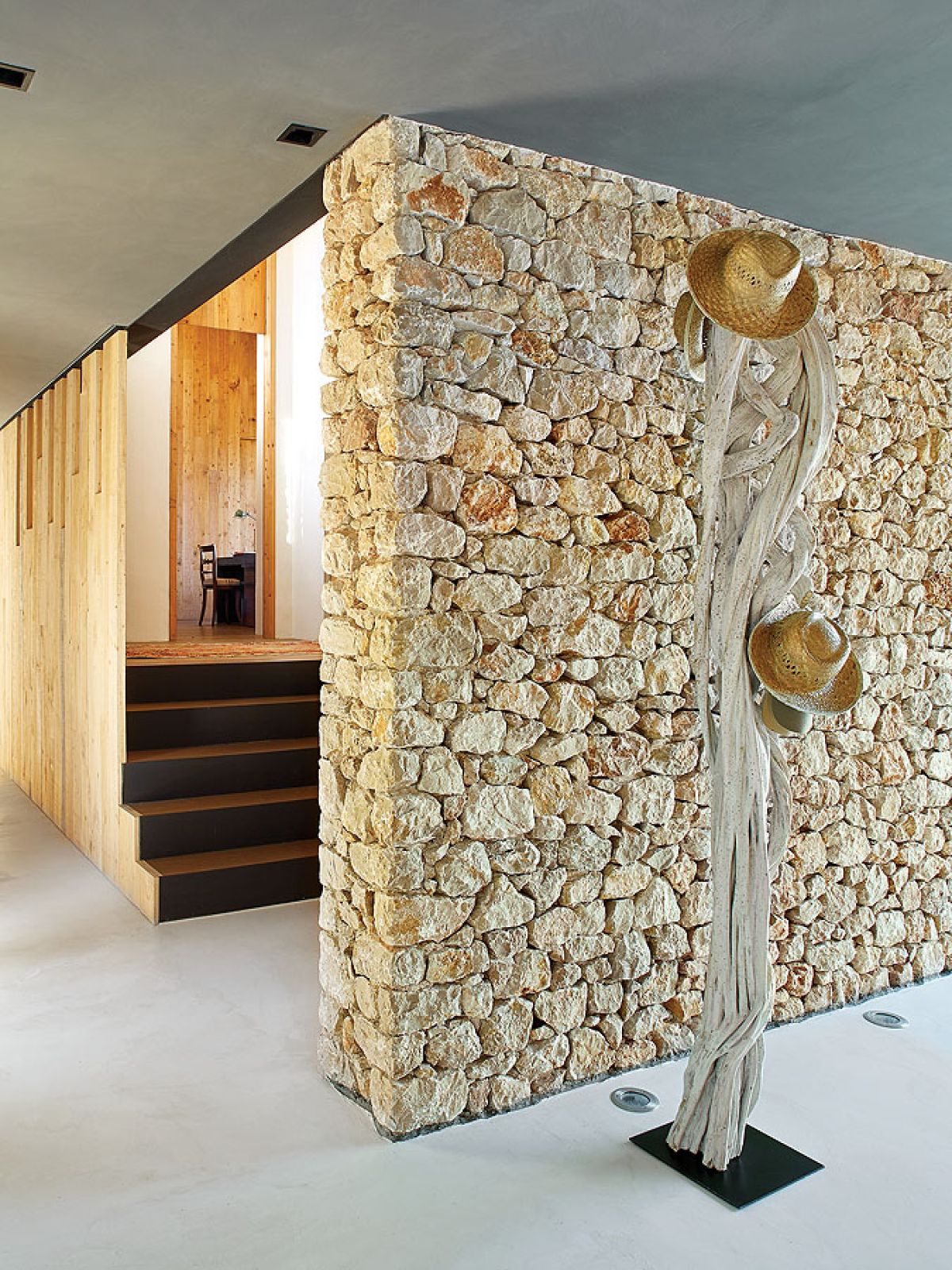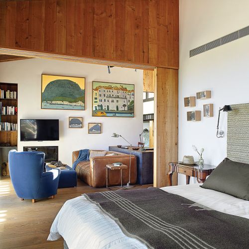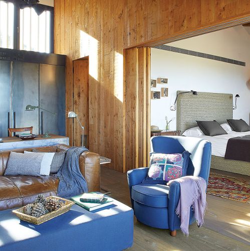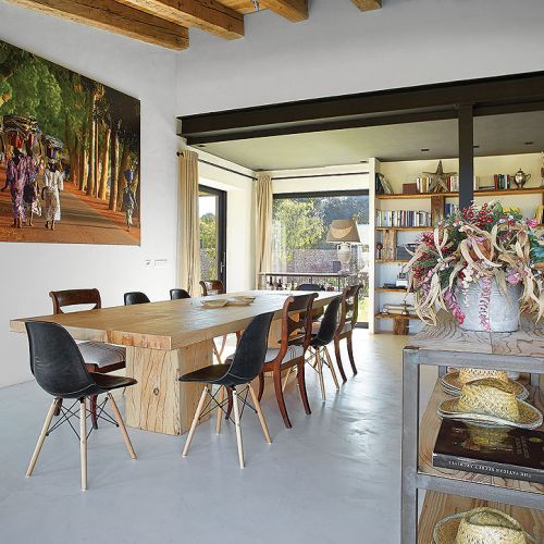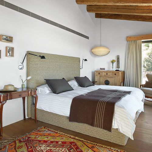 Takich odzyskanych materiałów jest w katalońskim domu więcej. Na przykład stare, wysłużone belki w zadaszeniu tarasowym czy boazerie w dużej sypialni, gdzie posiwiałe deski zestawiono z nowymi. Albo wieszak na kapelusze z pokręconych konarów, które wyrzuciło morze – pojaśniałe od morskiej soli i wiatru wyglądają jak nowoczesna rzeźba.