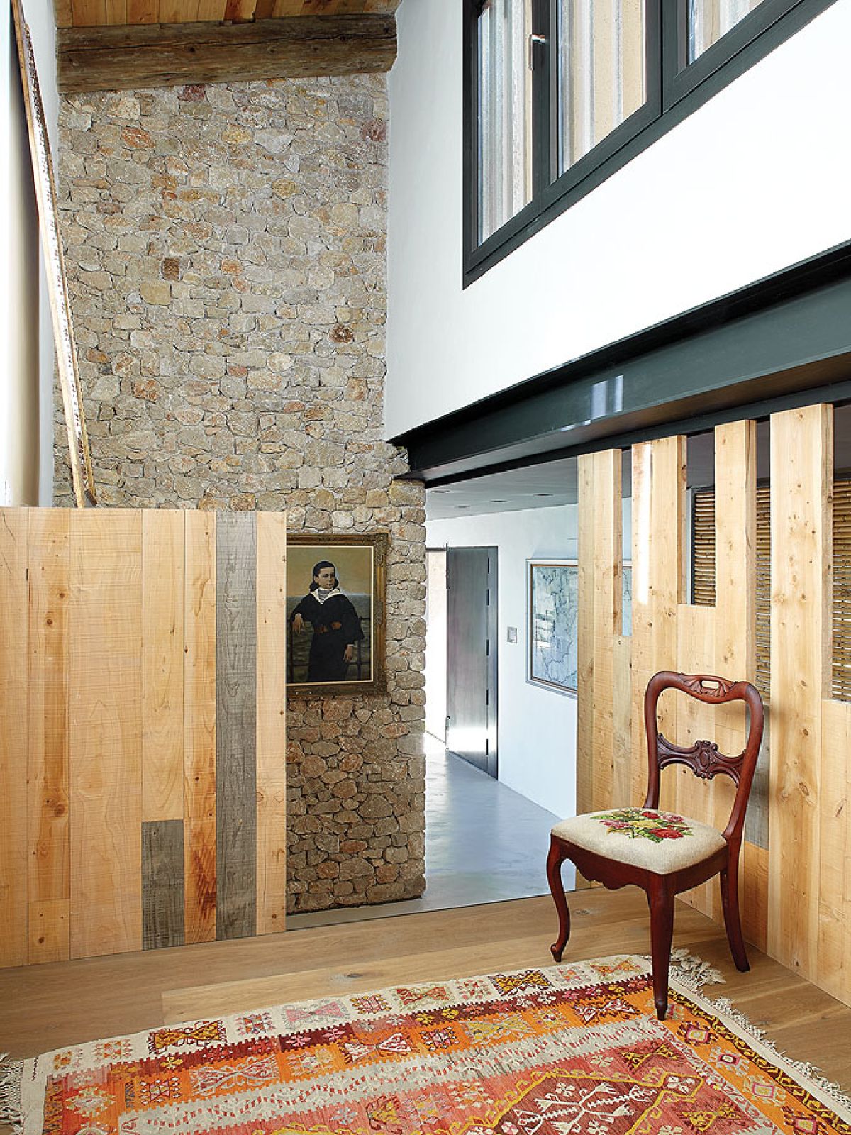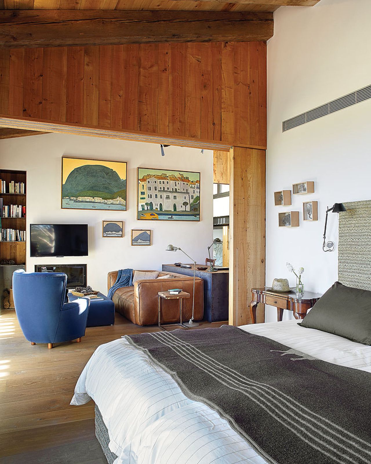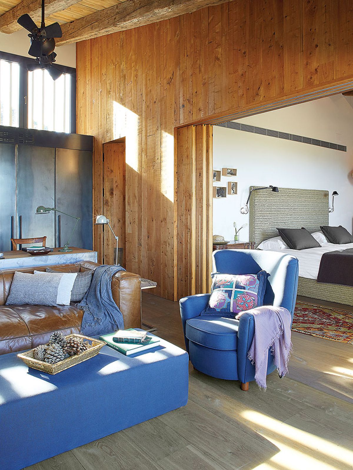 Takich odzyskanych materiałów jest w katalońskim domu więcej. Na przykład stare, wysłużone belki w zadaszeniu tarasowym czy boazerie w dużej sypialni, gdzie posiwiałe deski zestawiono z nowymi. Albo wieszak na kapelusze z pokręconych konarów, które wyrzuciło morze – pojaśniałe od morskiej soli i wiatru wyglądają jak nowoczesna rzeźba.