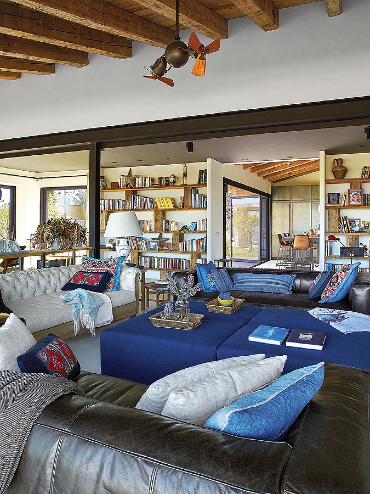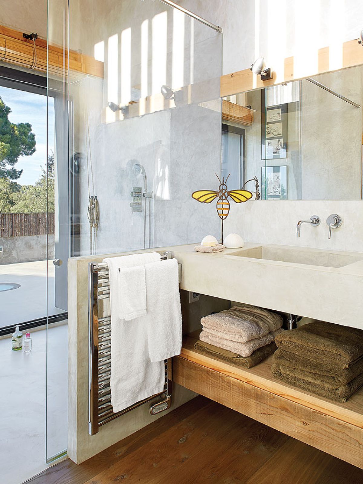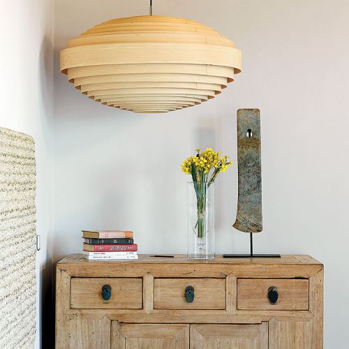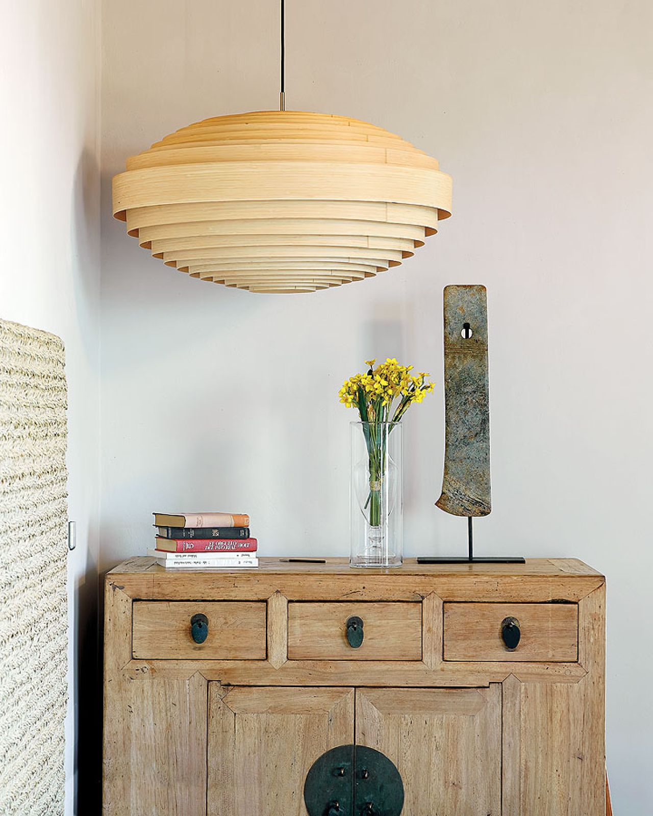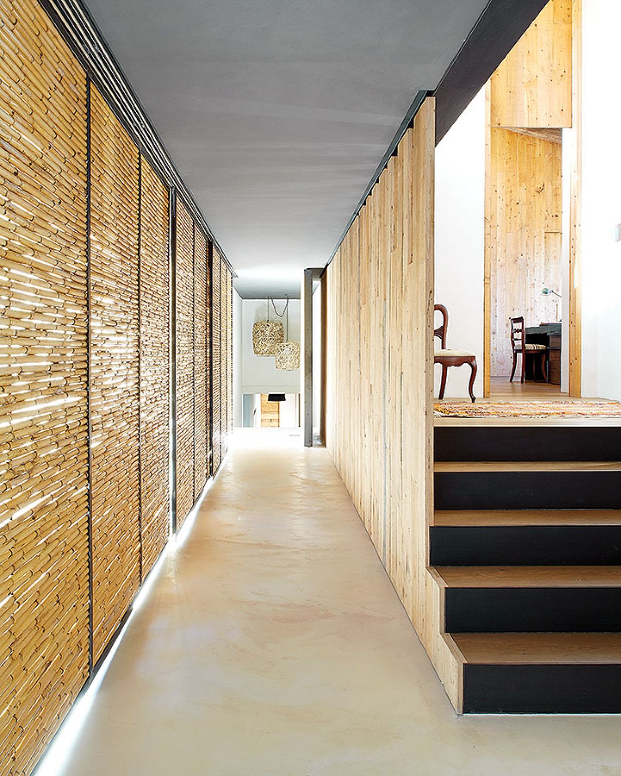 Takich odzyskanych materiałów jest w katalońskim domu więcej. Na przykład stare, wysłużone belki w zadaszeniu tarasowym czy boazerie w dużej sypialni, gdzie posiwiałe deski zestawiono z nowymi. Albo wieszak na kapelusze z pokręconych konarów, które wyrzuciło morze – pojaśniałe od morskiej soli i wiatru wyglądają jak nowoczesna rzeźba.