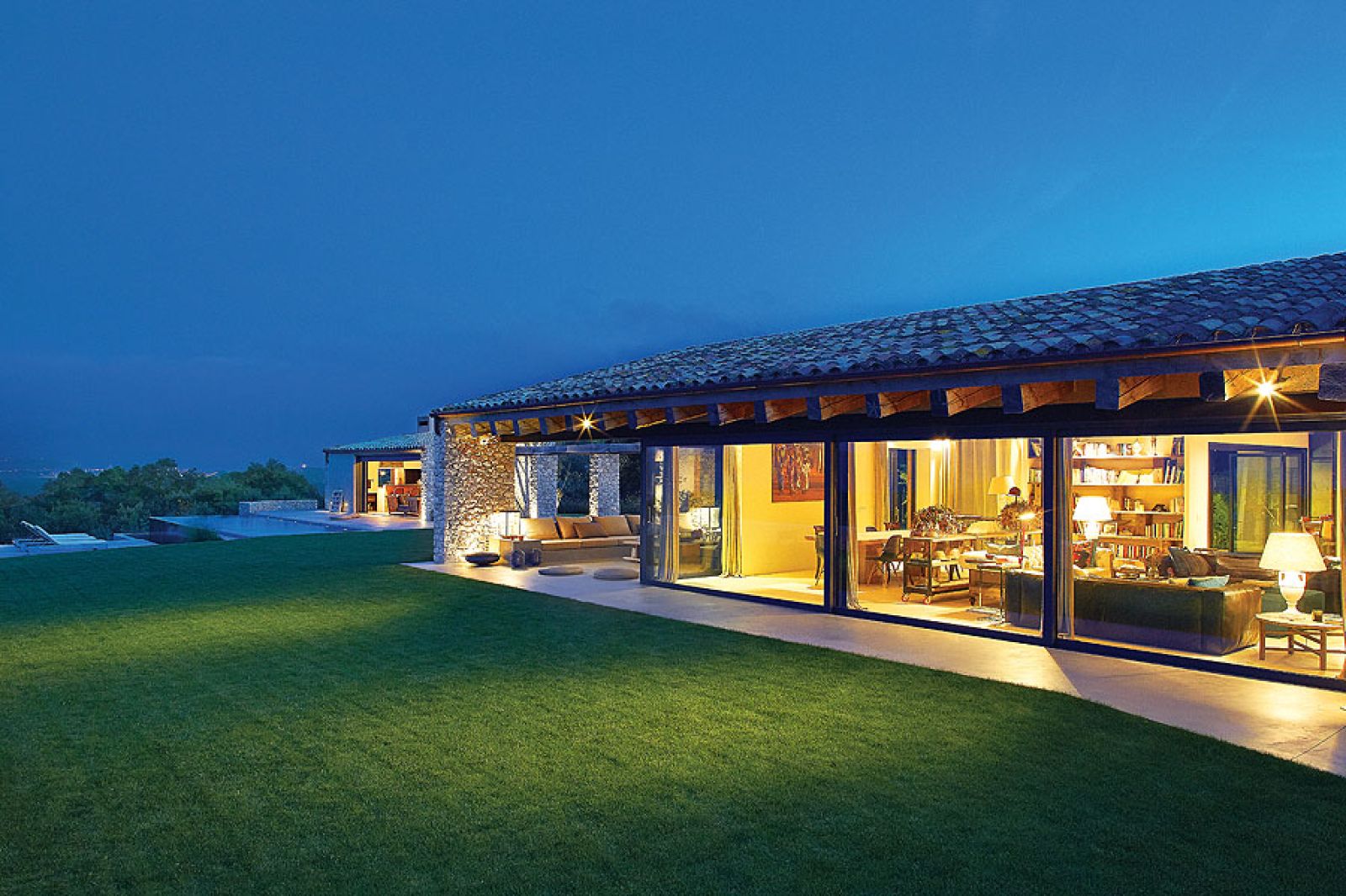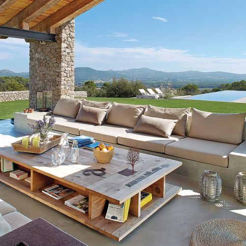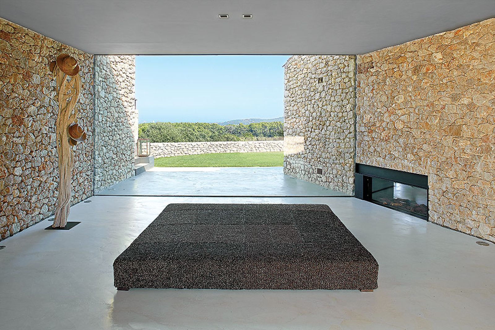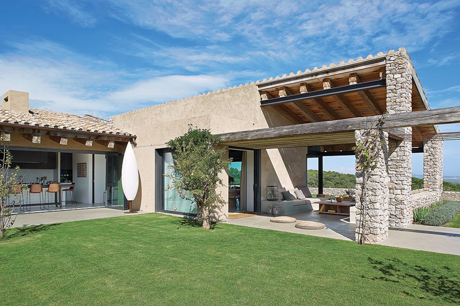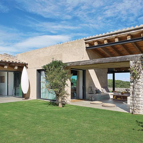 Brak drzew dookoła domu w pierwszej chwili zastanawia. Jak tu musi latem przypiekać… Jednak wszystko jest przemyślane. Poza jednym owocującym granatem niewiele tu rośnie, żeby nic nie zasłaniało nieziemskiej, 360-stopniowej panoramy sięgającej dziesiątki kilometrów w głąb lądu i morza – z okien widać nawet wyspy Medes. Tylko z jednej strony, skąd najczęściej wieją wiatry, to orle gniazdo osłonięte jest gajem oliwnym. Cienia szuka się więc na tarasach i pod zadaszonymi łącznikami między główną częścią domu a tą najbardziej letnią – przewiewną, pozbawioną ścian, wspartą na malowniczych kamiennych kolumnach.