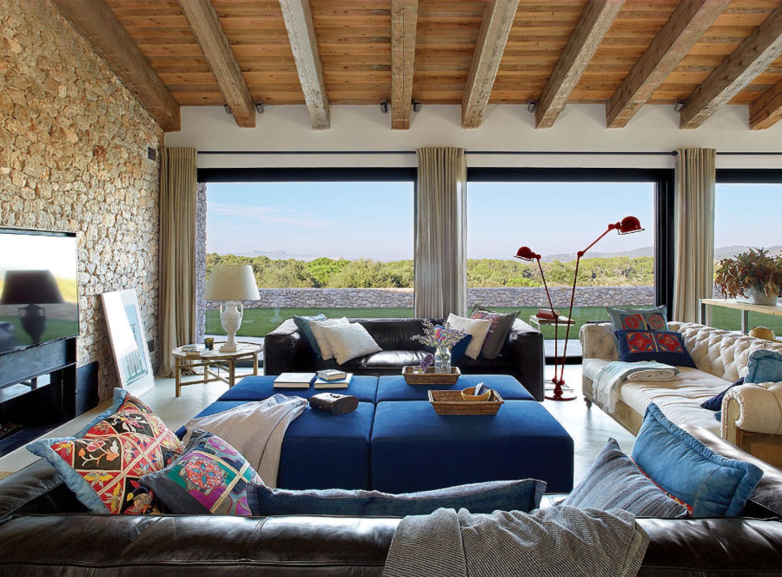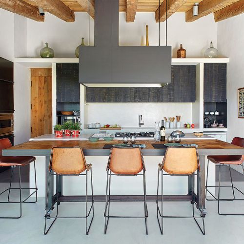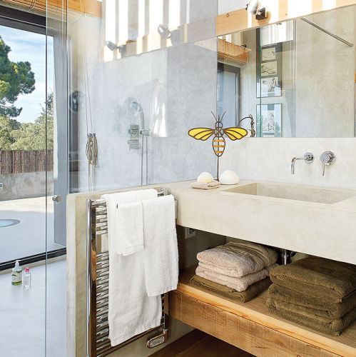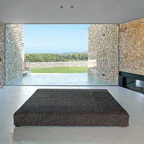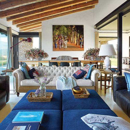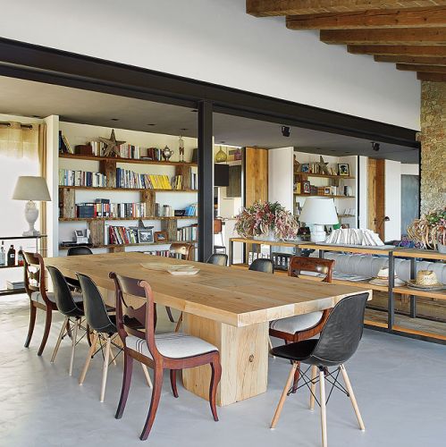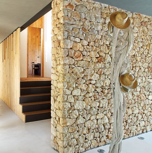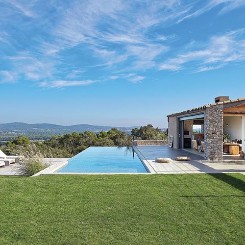 Biznesmen Paco i prawniczka Montserrat zakochali się w pejzażach Empordy i marzyli, żeby mieć tutaj letni dom. Ale nie jakiś gotowiec. Szukali działki, gdzie mogłoby stanąć letnisko szyte absolutnie na ich miarę. I rzeczywiście: wspólne dzieło architekta Damiána Ribasa i projektantki wnętrz Nurii Pérez-Sali na każdym kroku zdradza krawieckie niemal dopasowanie do potrzeb rodziny. Od basenu przelewowego, który wygląda jak laserowo wycięty kawałek nieba, przez superwygodny salon z wielkimi pufami (na każdego domownika przypada jedna), po tak smakowite detale, jak stół w jadalni, którego blat tworzy mozaika deszczułek wyjętych ze skrzynek na wina z wypalonymi symbolami winnic. Od razu widać, jakimi trunkami raczą się małżonkowie.