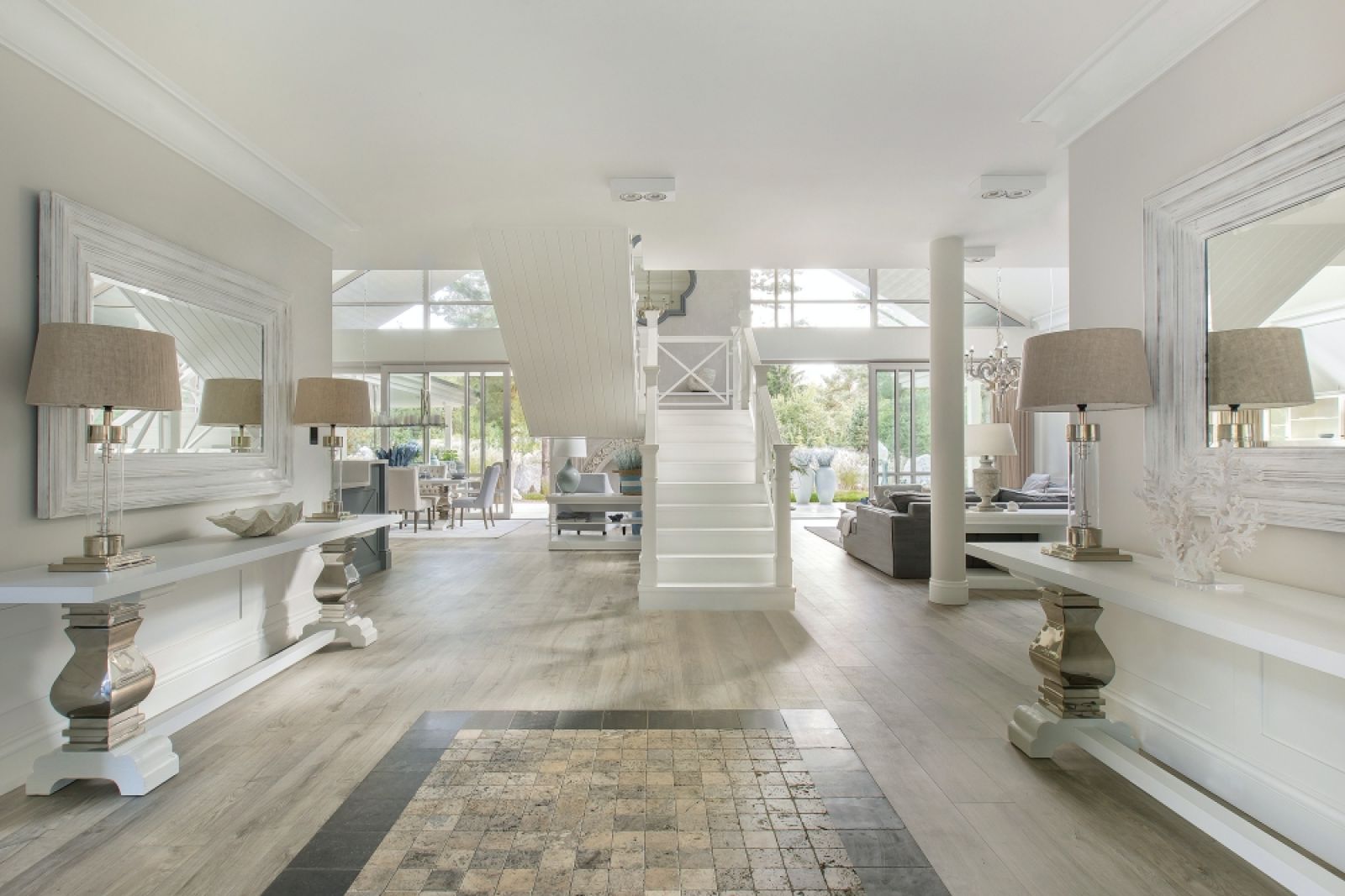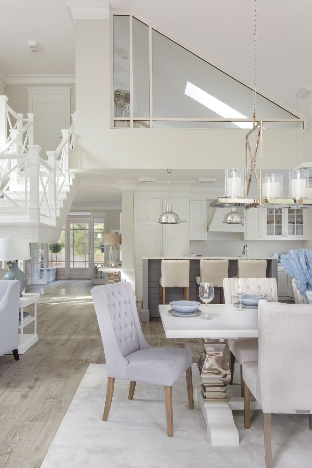 Iwona Jaworska zaprojektowała spektakularne schody, które prowadzą do pokoi gościnnych wprost z wielkiego salonu połączonego z jadalnią i kuchnią. Także wszystkie zabudowy, drzwi i charakterystyczne wysokie listwy są jej projektu. Większość mebli i drobiazgów, holenderskie klasyki stylu, wyszukała natomiast Katarzyna, właścicielka domu. Są drewniane i bielone, dodają przytulności. Nutkę glamour wniosły chromowane detale: regały na kolekcję muszli i bibelotów przywiezionych z podróży, masywne nogi stołu jadalnego czy żyrandol nad nim.