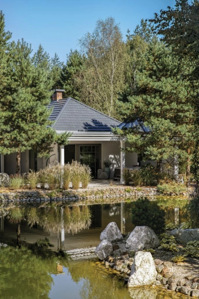 Jesteśmy tu tylko my, zające, wiewiórki i sarny – mówią Katarzyna i Jacek. – Poza tym cisza i spokój, bo mieszkamy na obrzeżach małej wioski. Do najbliższego sąsiada mamy kilkaset metrów. A do morza 40 minut samochodem. Gdy kupili tu działkę, była prawie cała zalesiona, tylko fragment zajmowała łąka. To ona podsunęła właścicielowi pomysł, by w tym miejscu, tuż przy domu zrobić staw. Ma 1000 m², widać go z każdego pokoju i pływa w nim kilkadziesiąt pięknych czerwonych karpi koi, które Japończycy uznają za ryby przynoszące szczęście. Niektóre mają już po 70 centymetrów – cieszy się właściciel. – Chyba im tu dobrze.