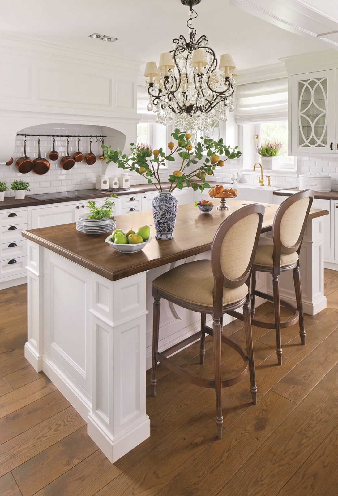 Zabudowę kuchenną, pieczołowicie zaprojektowaną przez Ewelinę, tworzą białe meble z dekoracyjnie profilowanymi frontami i filarami plus dębowe blaty. Szeroki okap nawiązuje stylem do dawnych kuchni. Pod nim wisi cały rządek miedzianych naczyń. Niektórzy ludzie wieszają sobie takie tylko dla ozdoby, a sami gotują na indukcji. To nie ten przypadek. Ewelina w kuchni czuje się jak ryba w wodzie. Wybrała szeroki piekarnik, żeby swobodnie mieściła się w nim pieczona gęś. – To moja kulinarna wizytówka – mówi. – Czy to nie dziwne, że w Polsce, gdzie hoduje się najwięcej gęsi, jest to tak mało popularne danie? U nas gąska jest dwa razy w tygodniu. Swoją pasją zaraziła też męża. – Jeszcze parę lat temu nawet wody nie potrafił zagotować. Dziś jest specem od mięs. W lecie nie odstępuje od grilla, a w kuchni robi steki na dwie patelnie.