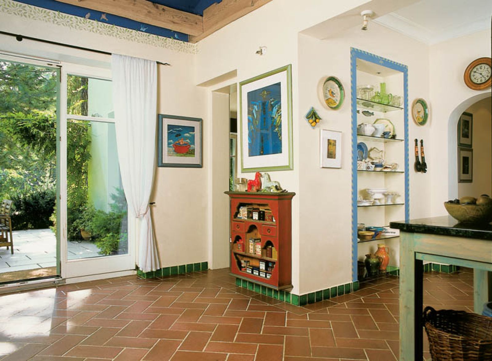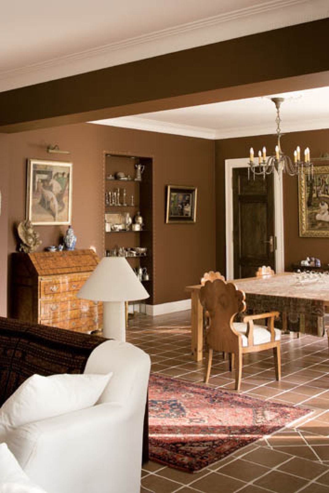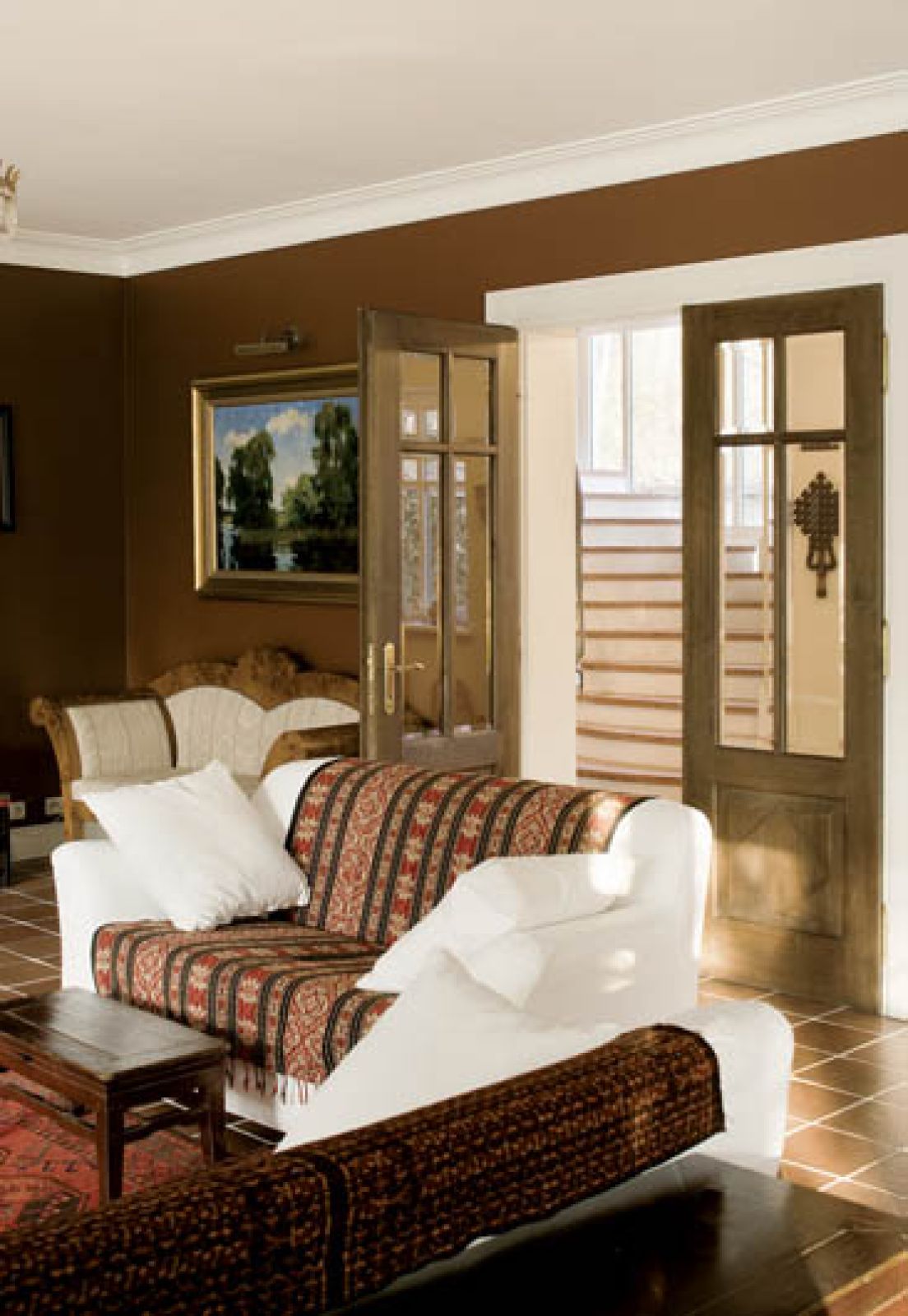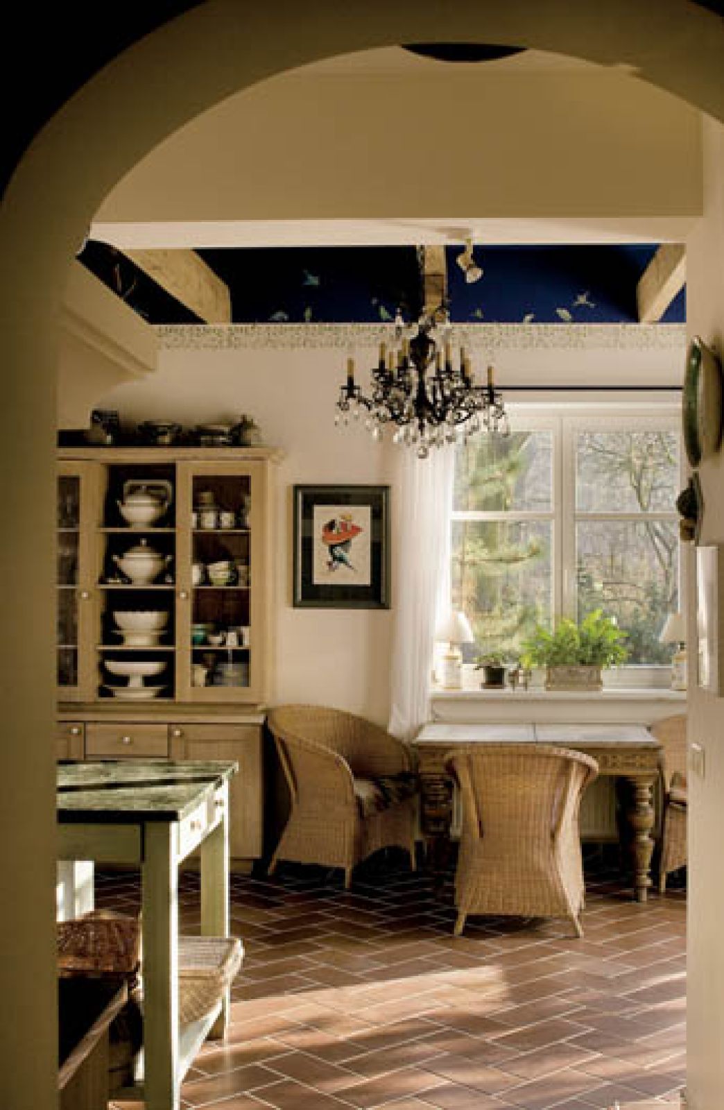 Na parterze, w dobudowanej części, mamy dużą kuchnię z solidnym, wielkim piecem, stołem i blatem wyłożonym zielonym trawertynem, na którym można pracować, gadając z domownikami w fotelach przy oknie. Kiedyś miałam anginę i musiałam zostać w domu na parę dni – wzięłam więc pędzle i wymalowałam w kuchni rzucik i ptaszki fruwające po niebieskim suficie. Dawną kuchnię i jadalnię połączyliśmy w wielki salon pomalowany na czekoladowy kolor. Zmniejsza to optycznie wnętrze, ale też ogromnie je ociepla. Podłoga na parterze wyłożona jest płytkami udającymi terakotę. Mamy mnóstwo zwierząt, latem dom jest całkiem otwarty na ogród i żadne deski długo by tutaj nie wytrzymały.