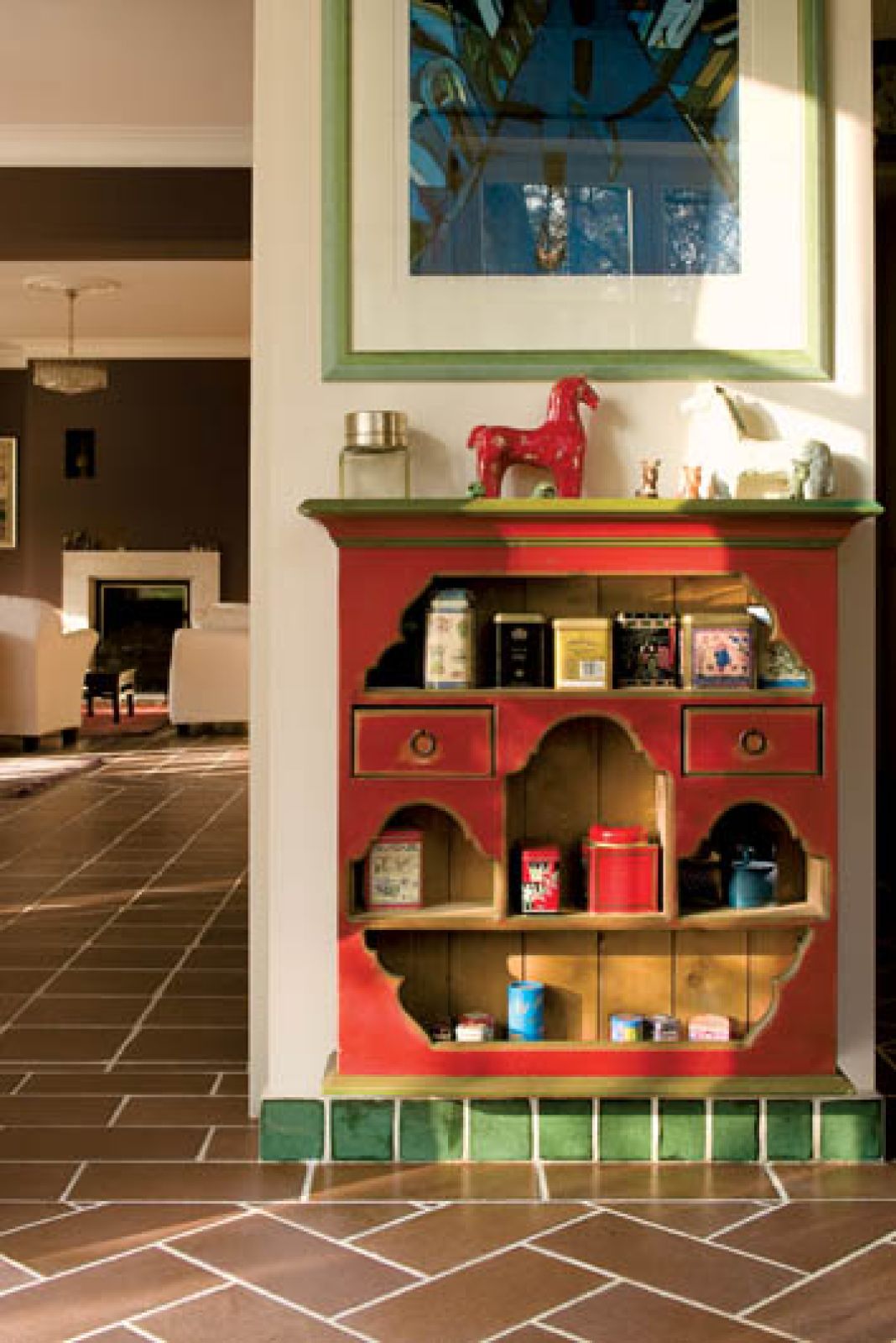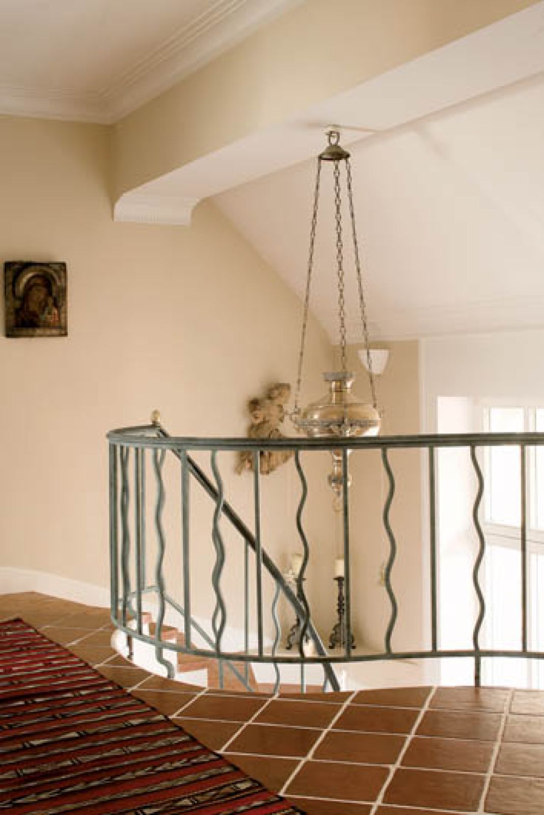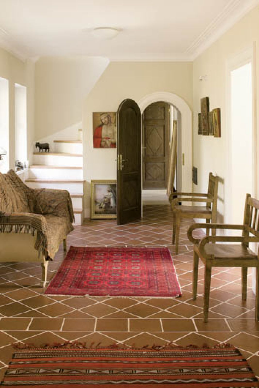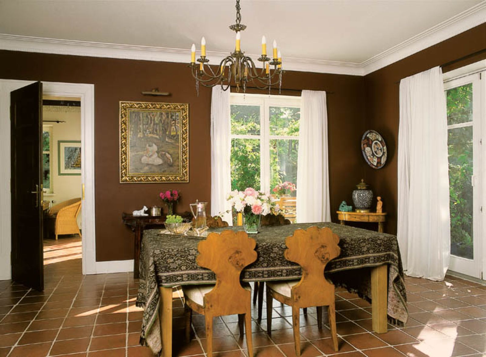 Na parterze, w dobudowanej części, mamy dużą kuchnię z solidnym, wielkim piecem, stołem i blatem wyłożonym zielonym trawertynem, na którym można pracować, gadając z domownikami w fotelach przy oknie. Kiedyś miałam anginę i musiałam zostać w domu na parę dni – wzięłam więc pędzle i wymalowałam w kuchni rzucik i ptaszki fruwające po niebieskim suficie. Dawną kuchnię i jadalnię połączyliśmy w wielki salon pomalowany na czekoladowy kolor. Zmniejsza to optycznie wnętrze, ale też ogromnie je ociepla. Podłoga na parterze wyłożona jest płytkami udającymi terakotę. Mamy mnóstwo zwierząt, latem dom jest całkiem otwarty na ogród i żadne deski długo by tutaj nie wytrzymały.