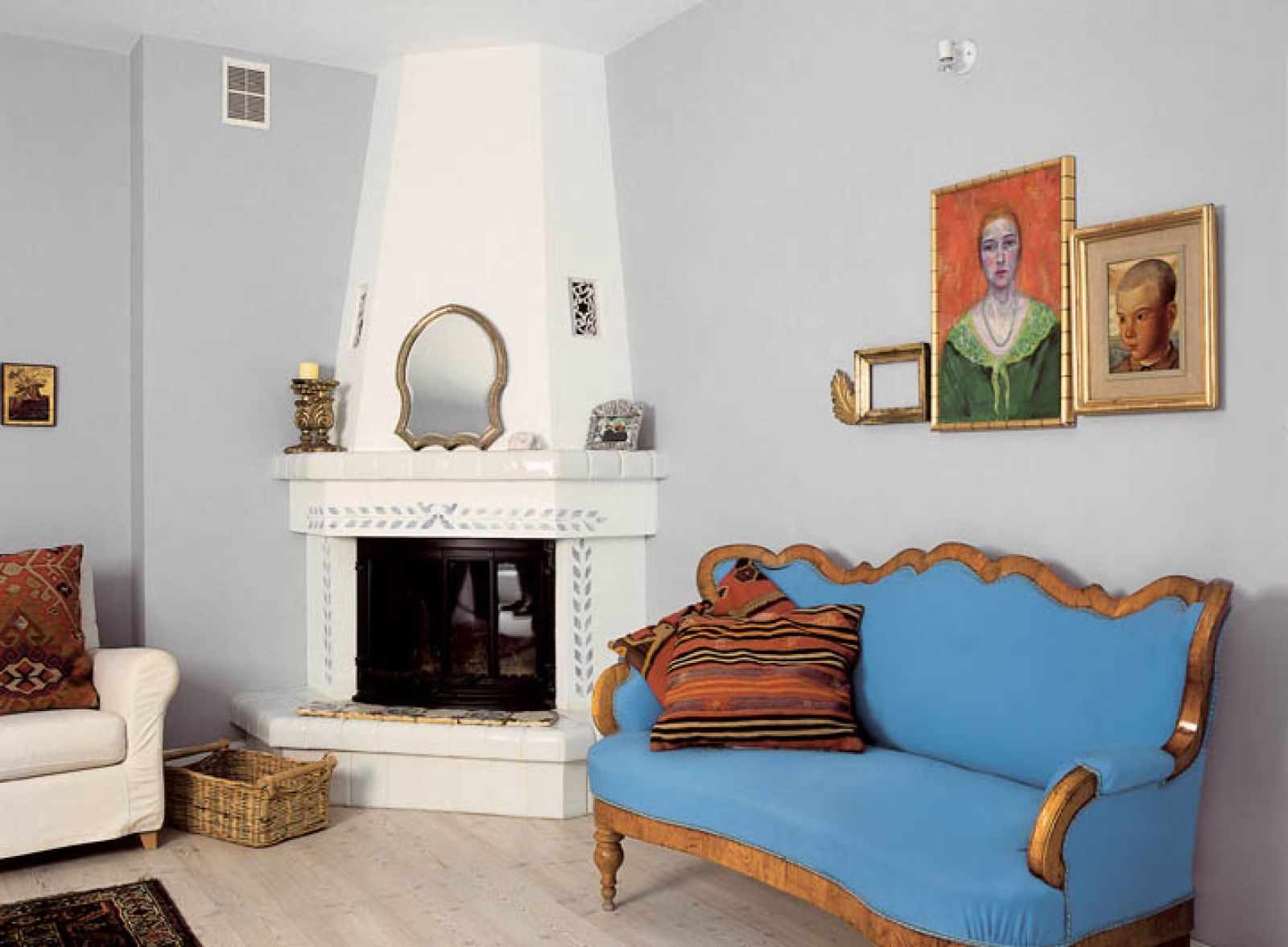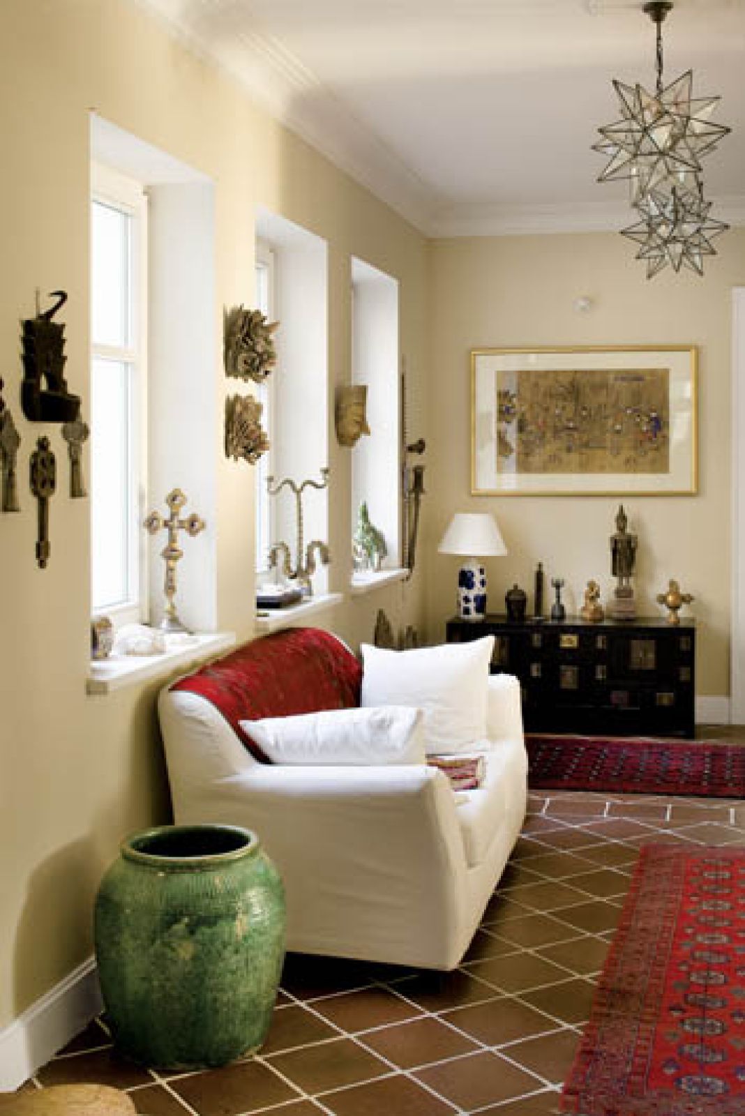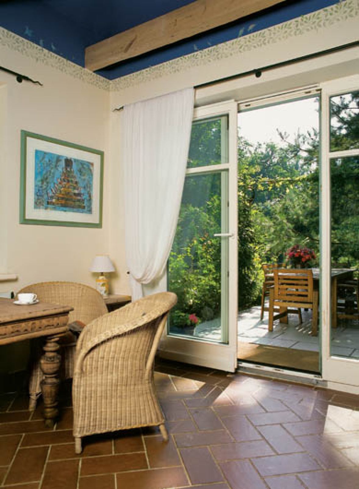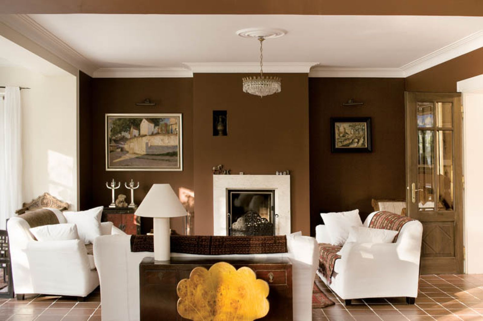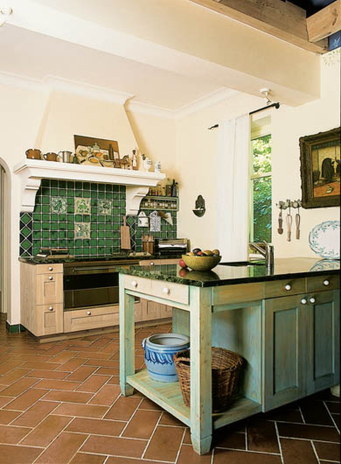 Na parterze, w dobudowanej części, mamy dużą kuchnię z solidnym, wielkim piecem, stołem i blatem wyłożonym zielonym trawertynem, na którym można pracować, gadając z domownikami w fotelach przy oknie. Kiedyś miałam anginę i musiałam zostać w domu na parę dni – wzięłam więc pędzle i wymalowałam w kuchni rzucik i ptaszki fruwające po niebieskim suficie. Dawną kuchnię i jadalnię połączyliśmy w wielki salon pomalowany na czekoladowy kolor. Zmniejsza to optycznie wnętrze, ale też ogromnie je ociepla. Podłoga na parterze wyłożona jest płytkami udającymi terakotę. Mamy mnóstwo zwierząt, latem dom jest całkiem otwarty na ogród i żadne deski długo by tutaj nie wytrzymały.