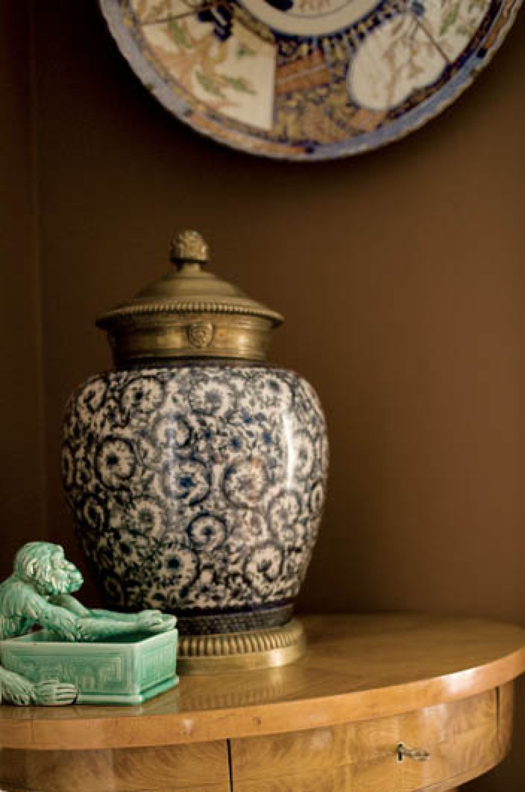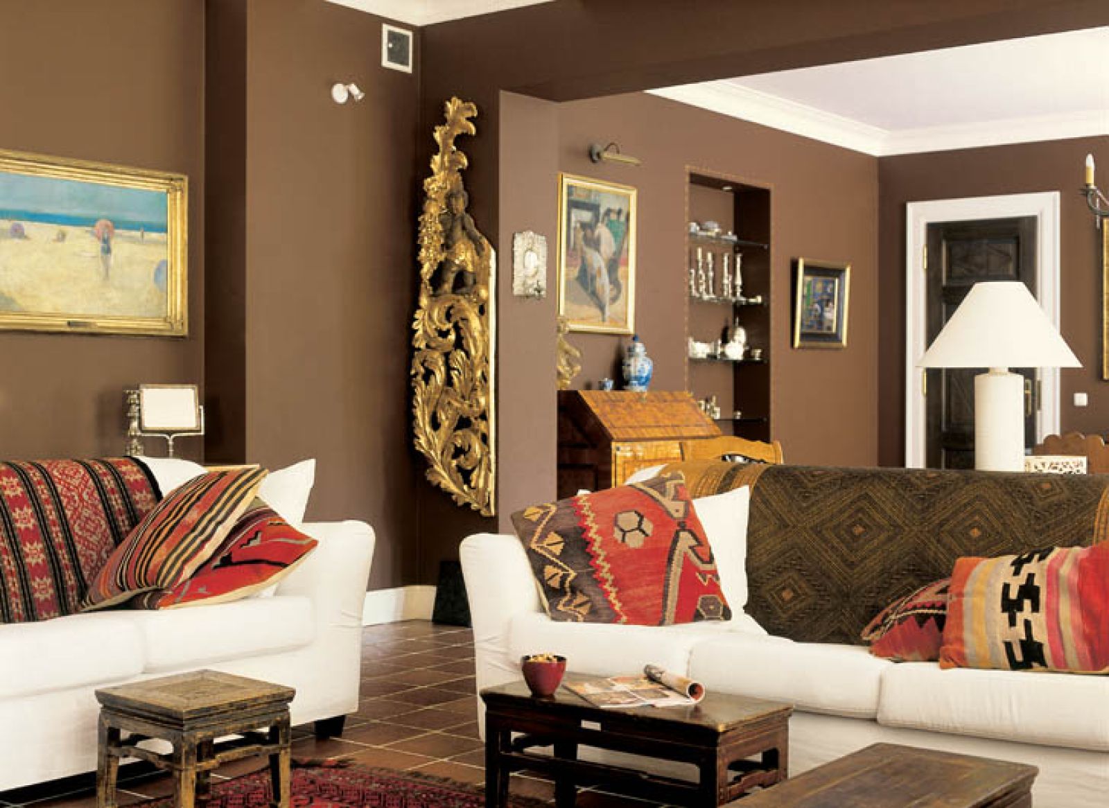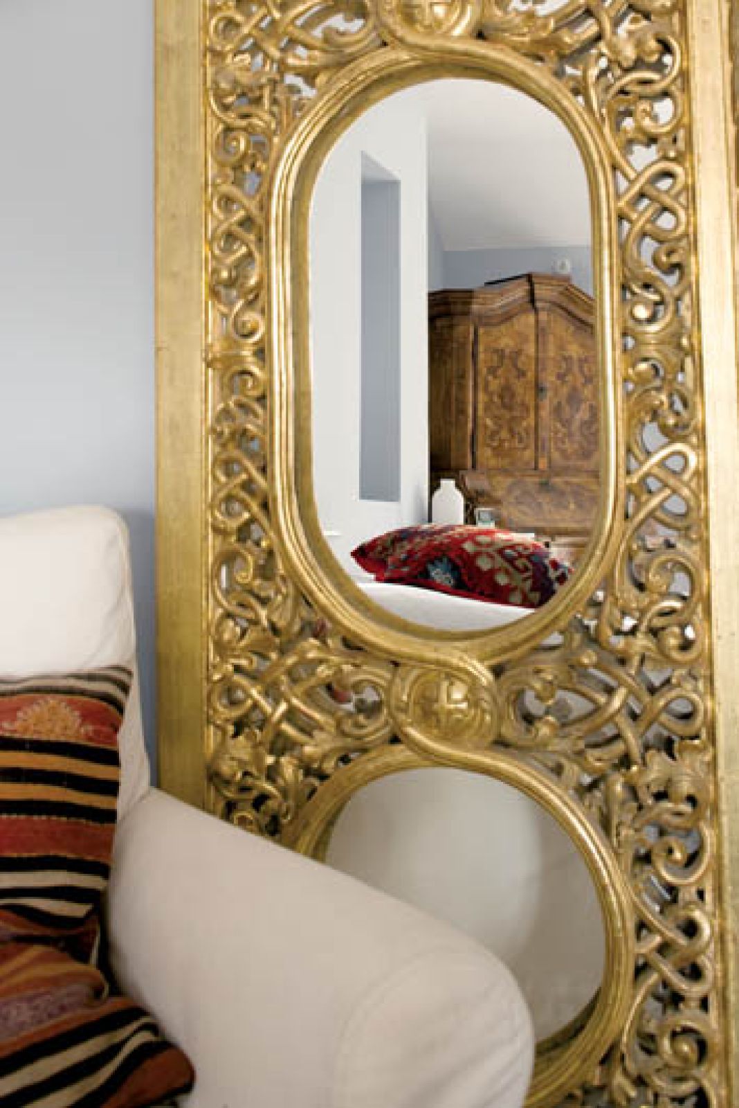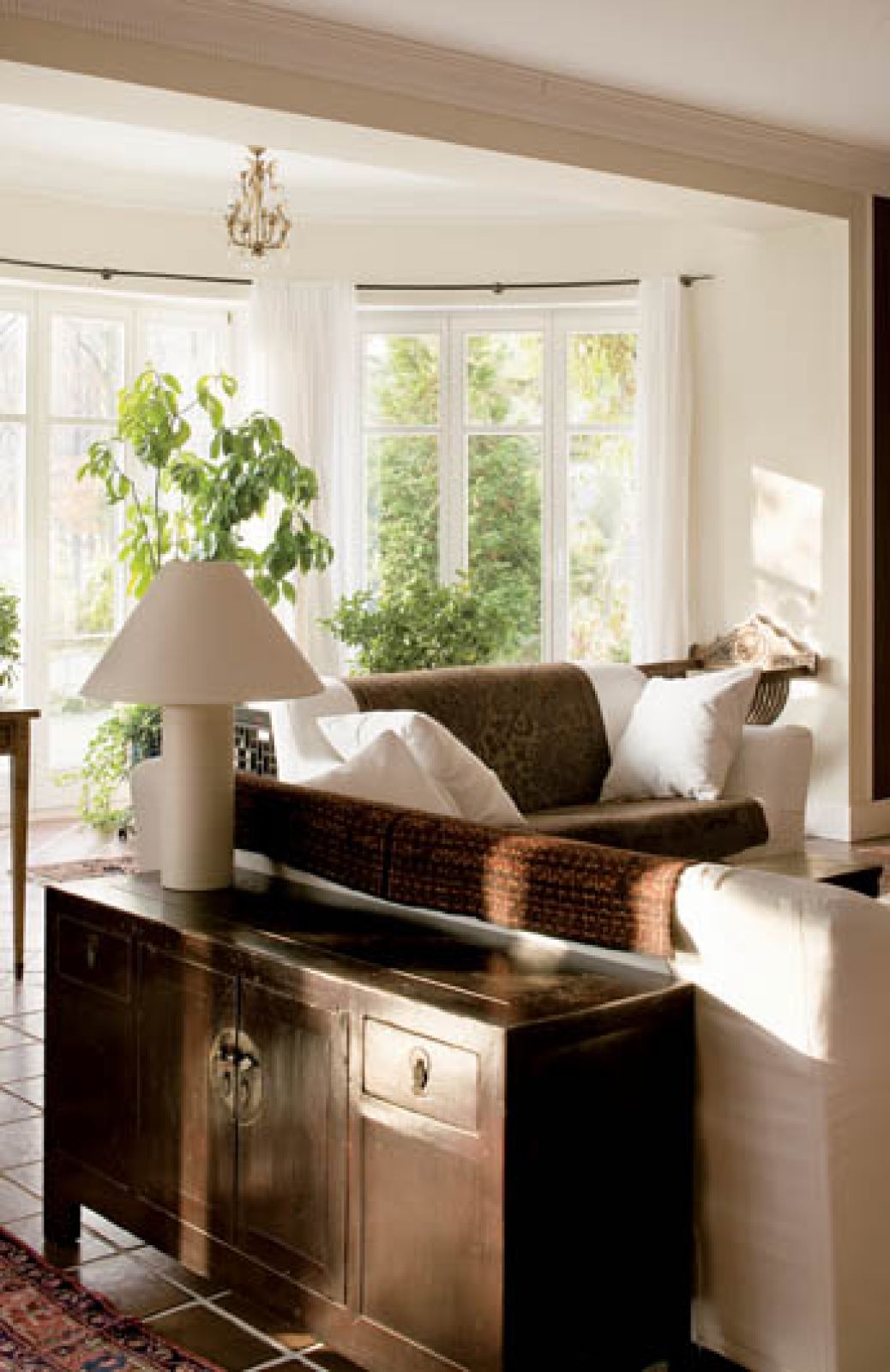 Na parterze, w dobudowanej części, mamy dużą kuchnię z solidnym, wielkim piecem, stołem i blatem wyłożonym zielonym trawertynem, na którym można pracować, gadając z domownikami w fotelach przy oknie. Kiedyś miałam anginę i musiałam zostać w domu na parę dni – wzięłam więc pędzle i wymalowałam w kuchni rzucik i ptaszki fruwające po niebieskim suficie. Dawną kuchnię i jadalnię połączyliśmy w wielki salon pomalowany na czekoladowy kolor. Zmniejsza to optycznie wnętrze, ale też ogromnie je ociepla. Podłoga na parterze wyłożona jest płytkami udającymi terakotę. Mamy mnóstwo zwierząt, latem dom jest całkiem otwarty na ogród i żadne deski długo by tutaj nie wytrzymały.
