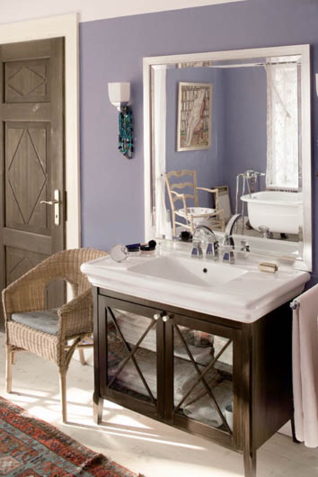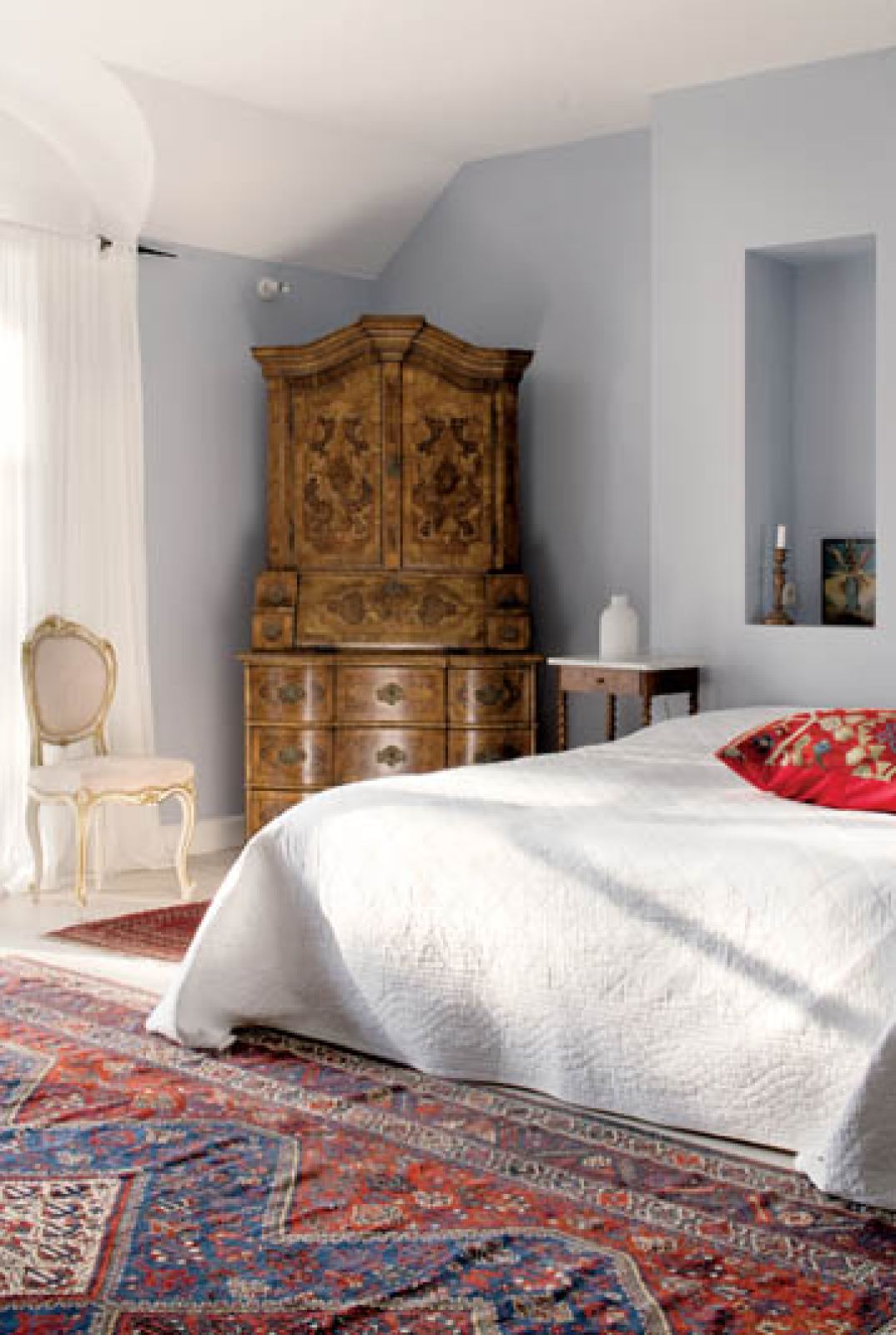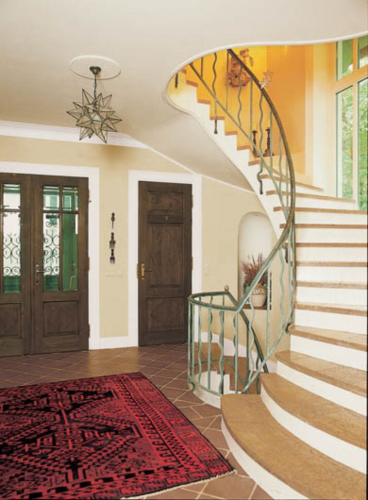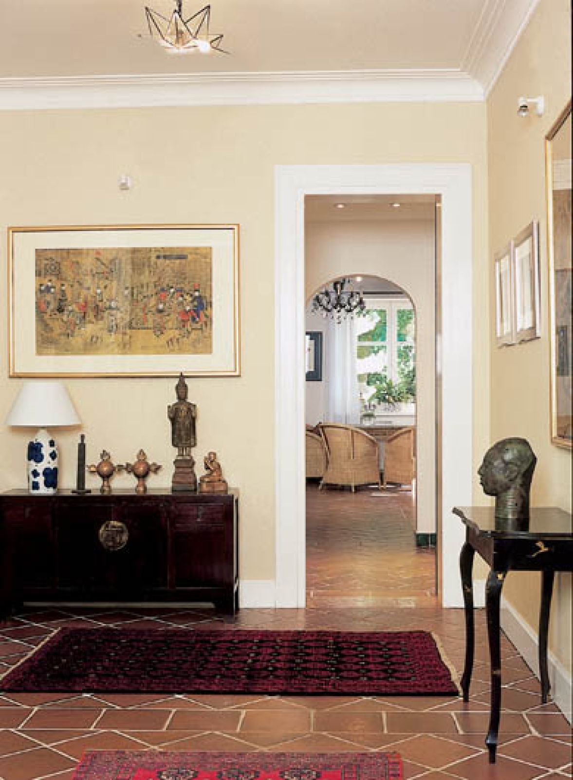 Na parterze, w dobudowanej części, mamy dużą kuchnię z solidnym, wielkim piecem, stołem i blatem wyłożonym zielonym trawertynem, na którym można pracować, gadając z domownikami w fotelach przy oknie. Kiedyś miałam anginę i musiałam zostać w domu na parę dni – wzięłam więc pędzle i wymalowałam w kuchni rzucik i ptaszki fruwające po niebieskim suficie. Dawną kuchnię i jadalnię połączyliśmy w wielki salon pomalowany na czekoladowy kolor. Zmniejsza to optycznie wnętrze, ale też ogromnie je ociepla. Podłoga na parterze wyłożona jest płytkami udającymi terakotę. Mamy mnóstwo zwierząt, latem dom jest całkiem otwarty na ogród i żadne deski długo by tutaj nie wytrzymały.
