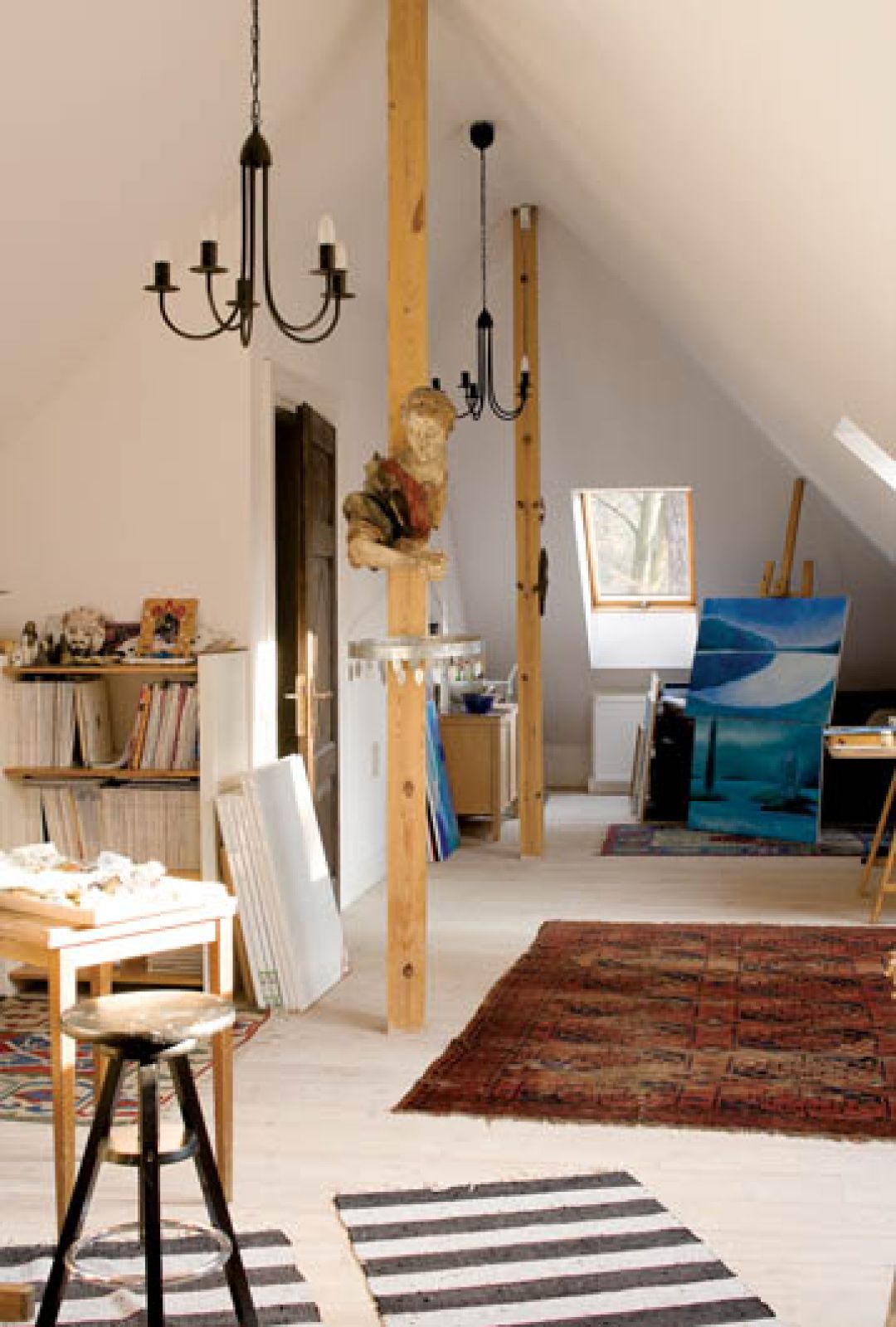 Część od północy – gdzie kiedyś mieściły się ponure pokoje gospodarcze i służbówka – otworzyliśmy i mamy tam teraz „galerię” ze zbieraniną pamiątek przywiezionych z podróży, a także rzeczy sentymentalnych. Panowie, którzy budowali nasz dom, z powodu licznych nisz i zakamarków nazwali go „kapliczką”. I rzeczywiście, coś w tym jest. Ale takie „dziurki”, łuczki i nisze są niezwykle nastrojowe i tworzą magiczną atmosferę. Piękne, lekkie schody na piętro wymyślił brat męża, architekt z wielką wyobraźnią. Na piętrze na podłogach mamy szerokie modrzewiowe dechy. Zaolejowane na biało wyglądają rewelacyjnie i są przyjemnie ciepłe. Na poddaszu jest mój bałagan – uwielbiam to miejsce. Kilka połaciowych okien pokazuje niebo ze wszystkich stron i drzewa pochylające się nad domem. Nie byłoby tu może aż tak cudownie, gdyby nie stary las, który nas otacza. Mamy w nim osiem pomników przyrody i dbamy, by trzymały się jak najlepiej. Trawnik założyliśmy tylko przy domu, reszta jest dzika. Czasem wycinamy samosiejki i zbyt natarczywe chwasty. Wiosną mamy tu całe morze zawilców, fiołków leśnych i konwalii. Gniazda zakładają kosy i mazurki. Ptaki więc budzą nas o świcie. Lubimy wtedy siadać na tarasie i pić poranną kawę, słuchając ciszy.