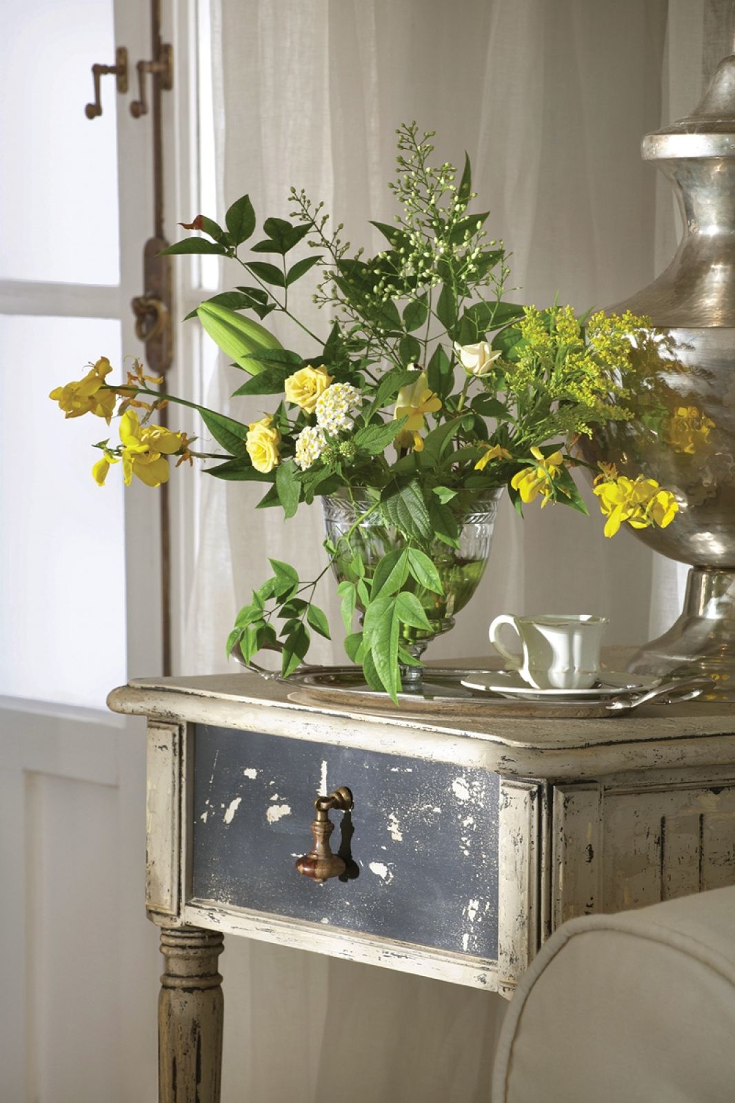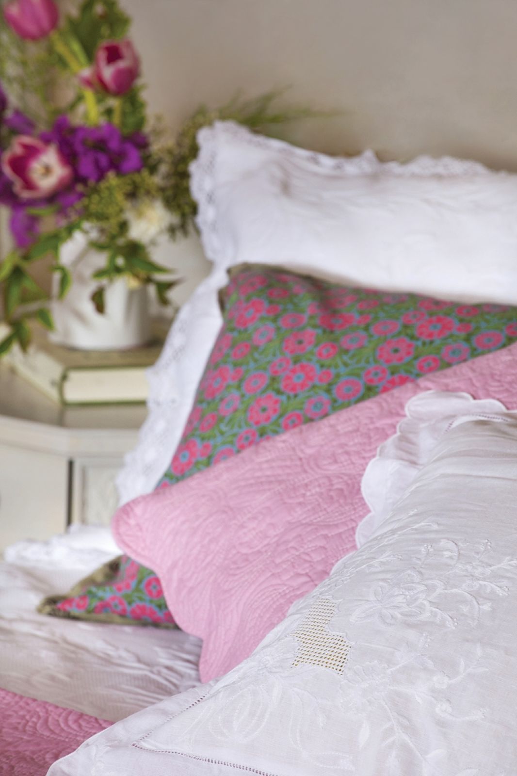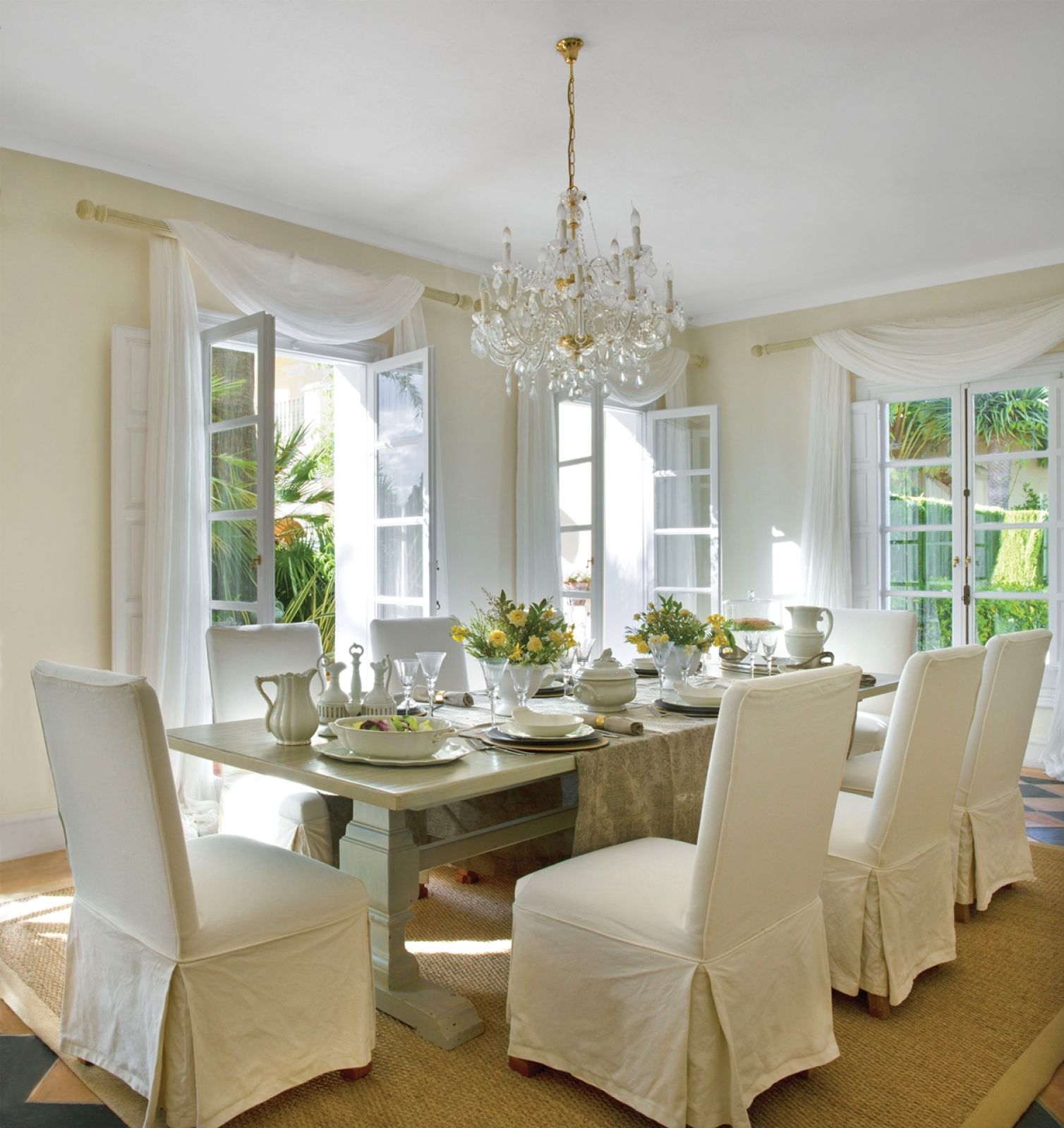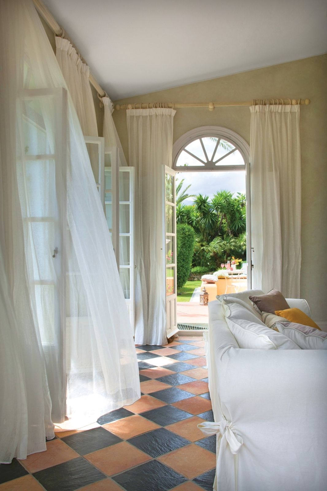 – Wyobrażałam sobie te białe muślinowe firanki, które wydymają się przy każdym podmuchu jak żagle – mówi Francine. – Niby nic, po prostu lekka tkanina bez żadnych ozdobników, a wyszła z nich tak wspaniała dekoracja okna. Cudownie prześwieca przez materiał słońce, które igra w kryształowych żyrandolach czy lustrze nad kominkiem. Specjalnie zostały upięte w taki sposób, żeby nie przeszkadzały w otwieraniu okien. Było to ważne, bo to przez okna z każdego pokoju można wyjść do ogrodu i gospodarze korzystają z nich częściej niż z drzwi.