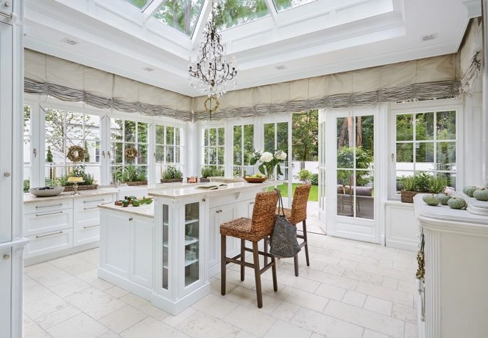 Najbardziej spektakularnym w domu rozwiązaniem jest zadaszenie białej kuchni przypominające angielską oranżerię. Wykonania jej (podobnie jak salonowych trzymetrowych okien i wielu innych detali) podjęła się firma z Rawicza – Bracia Kowalscy. Przez spadzisty szklany dach i wstęgę okien dookoła w kuchni wpada całe morze światła.