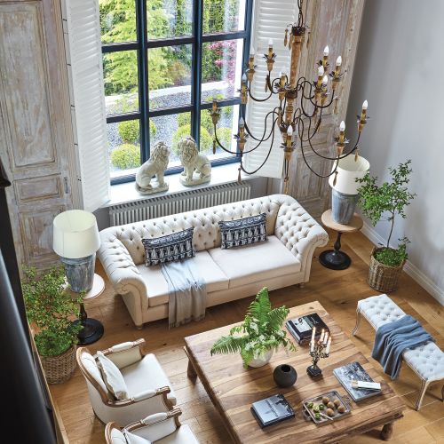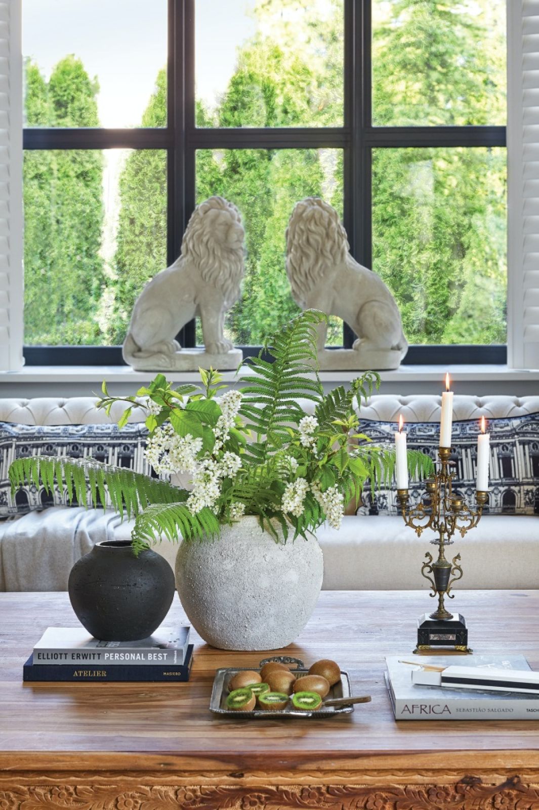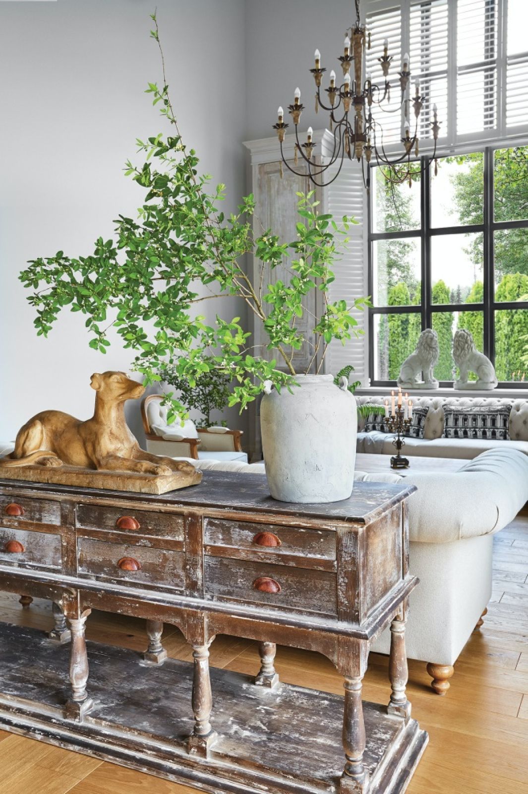 Wygodny i stworzony do towarzyskich spotkań jest też salon. Przy ogromnym stoliku kawowym, na dwóch sofach w stylu chesterfield, dwóch fotelach i tapicerowanej ławce mieści się nawet tuzin gości. Uwagę przykuwa tu ogromne okno ze szprosami flankowane przez wysokie na ponad trzy metry… stare, zabytkowe drzwi. Są dumą projektantki i właściciela. – Znalazłam je w jednym z francuskich antykwariatów i od razu oszalałam na ich punkcie.