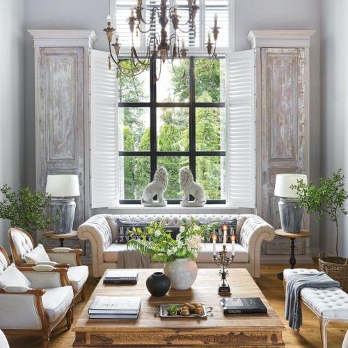 Wyglądały jak z dawnego „chateau”. Początkowo miały zdobić jedną ze ścian, ale kiedy przyjechały, stwierdziliśmy, że warto je inaczej wykorzystać. Poprosiłam stolarza, by zrobił szafy do salonu. Stanęły po obu stronach okna i aż się prosiły o piękne skrzydła, które ukryją pokaźny księgozbiór gospodarza. Drzwi świetnie się do tego nadawały. Co prawda, gdy stolarz je zobaczył, stwierdził, że woli zrobić nowe, niż je odnawiać, ale uparliśmy się. I dobrze, bo robią wrażenie na każdym, kto tu wchodzi.