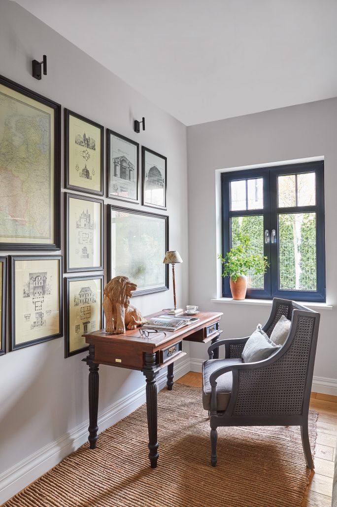Ze starych balustrad znalezionych przez architektkę na antykach stolarz zrobił dwie konsole do salonu, dorobił im tylko blaty. Ciekawie ułożone są też deski na podłodze – gdzieniegdzie w poprzek, trochę jak na pokładzie statku, trochę jak we francuskim dworku. To zabieg dekoracyjny, ale też sposób, by symbolicznie oddzielić od siebie pomieszczenia – na przykład jadalnię od kuchni. Swoje miejsce znalazły też pamiątki z podróży – trafiły do stylowego gabinetu, ukrytego za loftowymi, metalowymi drzwiami. Maski, rękodzieło i stare mapy zdobią teraz jego ściany. Na górze z kolei znajdują się trzy pokoje: sypialnia gospodarzy w lekkim stylu hamptons, pokój gościnny oraz… wymarzona siłownia.