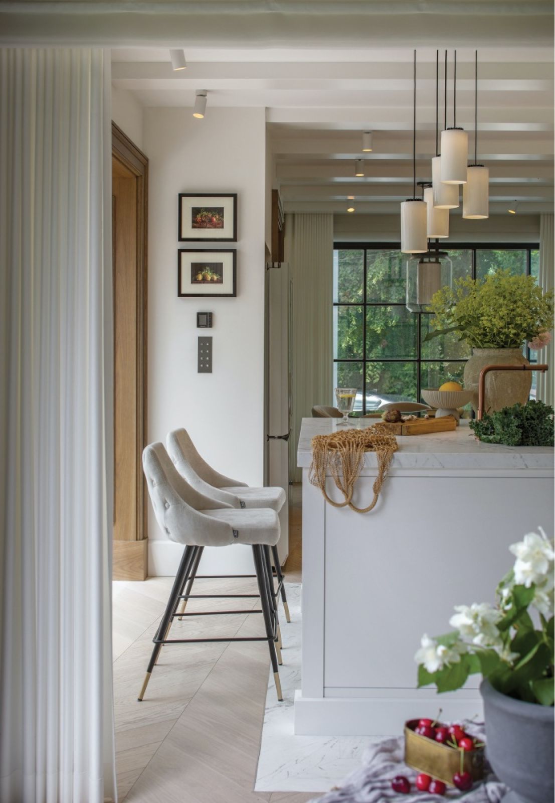 Smakowitym detalem są we wnętrzach lampy światowych marek pochodzące z salonu Goemi: elegancki żyrandol Eicholtz w holu głównym, kinkiety Davidts Lighting na klatce schodowej, żyrandol Ralph Lauren nad stołem w jadalni, lampa Santa&Cole nad wyspą w kuchni, kinkiety Visual Comfort w salonie i w oranżerii oraz efektowne kinkiety Eicholtz w łazience na poddaszu.