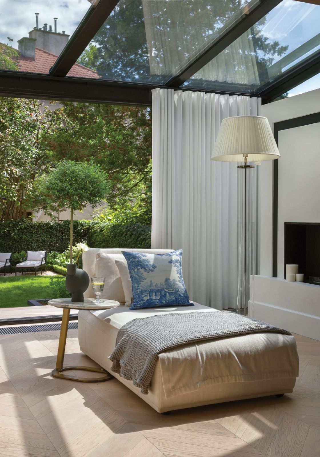 Wrażenie dużej otwartej przestrzeni na stosunkowo niedużej przecież powierzchni parteru Paulina osiągnęła dzięki otwarciu widoku na ogród od samego wejścia – między holem a głównym salonem zaprojektowała szerokie, dwuskrzydłowe szklane drzwi. Na końcu tej perspektywy jest zieleń ogrodu, a wcześniej coś, do czego zainspirowała ją właścicielka – całkowicie przeszklona oranżeria. Konstrukcja, która stanęła na tarasie, stała się integralną częścią zarówno salonu, jak i ogrodu. Wnętrze oranżerii urządzono nietypowo – bez wypełniania go roślinnością, ale jako dodatkowy pokój do relaksu. Jest tam biokominek oraz szezlong z praktycznym stolikiem-pomocnikiem. Kurtyna, którą w każdej chwili można zaciągnąć, dodaje pomieszczeniu intymności.