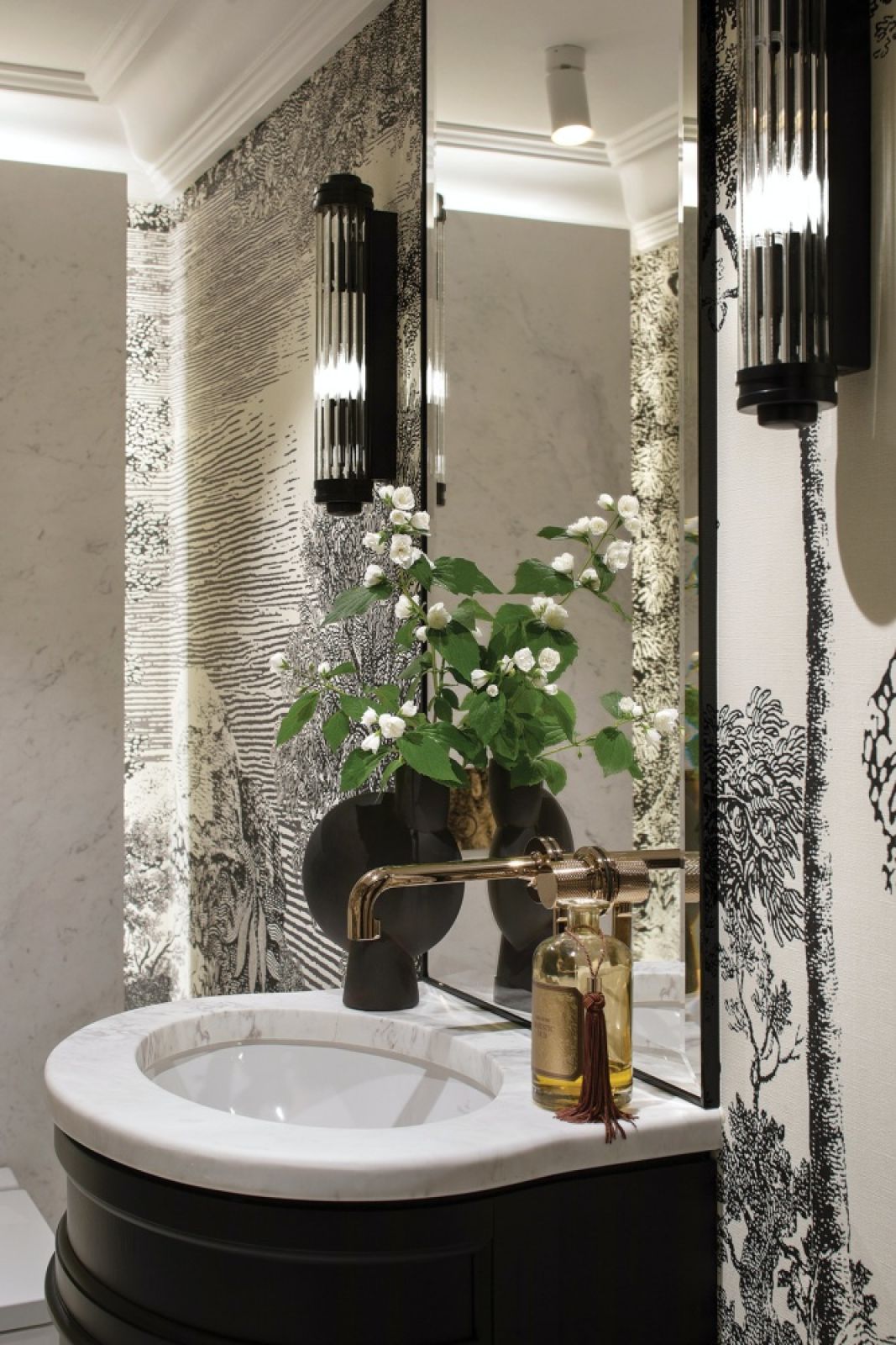 Najbardziej ekstrawaganckim pomieszczeniem domu stała się łazienka dla gości. Jej ściany oplata tapeta, która przypomina stare ryciny. Agnieszka w pierwszym momencie nie chciała tak mocnych graficznych wzorów. Ale projektantka przekonywała: „Spróbuj, pomieszkaj z tą tapetą, a zobaczysz…”. I tak się stało – wszelkie wątpliwości rozwiały się, kiedy łazienkę ukończono. Dziś budzi zachwyt nie tylko gości, ale i samej właścicielki. Czy ona sama znów za jakiś czas będzie chciała urządzać kolejny dom, sprostać nowym wyzwaniom? – Chyba zostanę tutaj na dłużej – mówi z uśmiechem…
