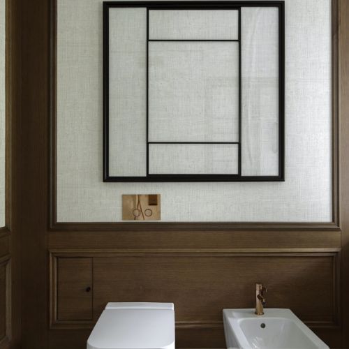Wielkim atutem domu na Sadybie jest stolarka – drzwi, okna i meble fornirowane tytoniowym w kolorze dębem. Forniry krążą po wszystkich piętrach – w wykończeniach mebli łazienkowych, salonie głównym oraz w sypialniach.