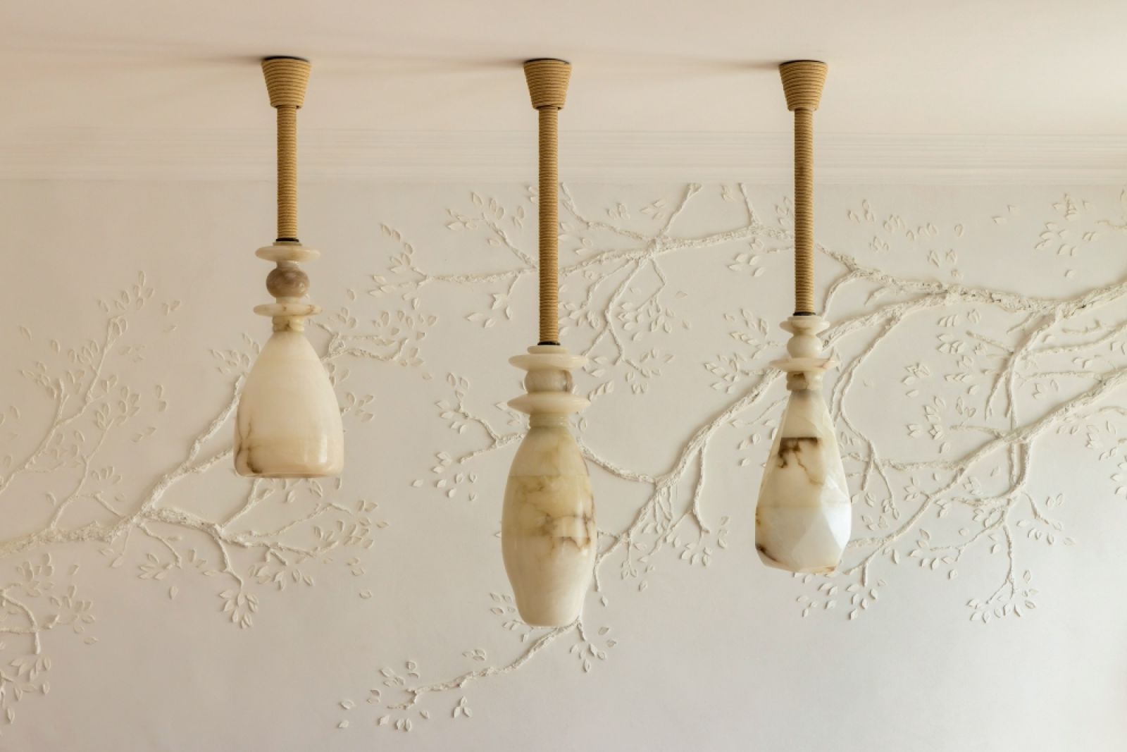 W jadalni w stylu haussmannowskim, zaprojektowanej na wzór ogrodu zimowego, układ skupia się wokół dwóch efektownych mebli. Robiony na zamówienie, oczywiście według projektu Stéphanie Coutas, stół Mayan, łączy drewno tekowe, linę i marmur. Stoi pod niezwykle efektownym alabastrowym żyrandolem Voyageur, który cudownie doświetla przestrzeń.