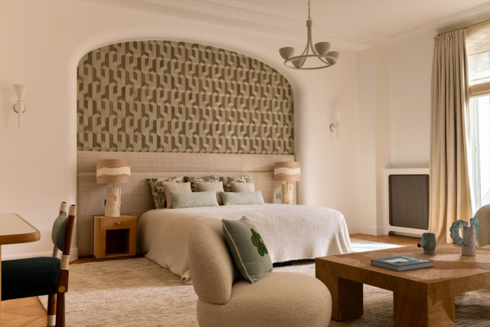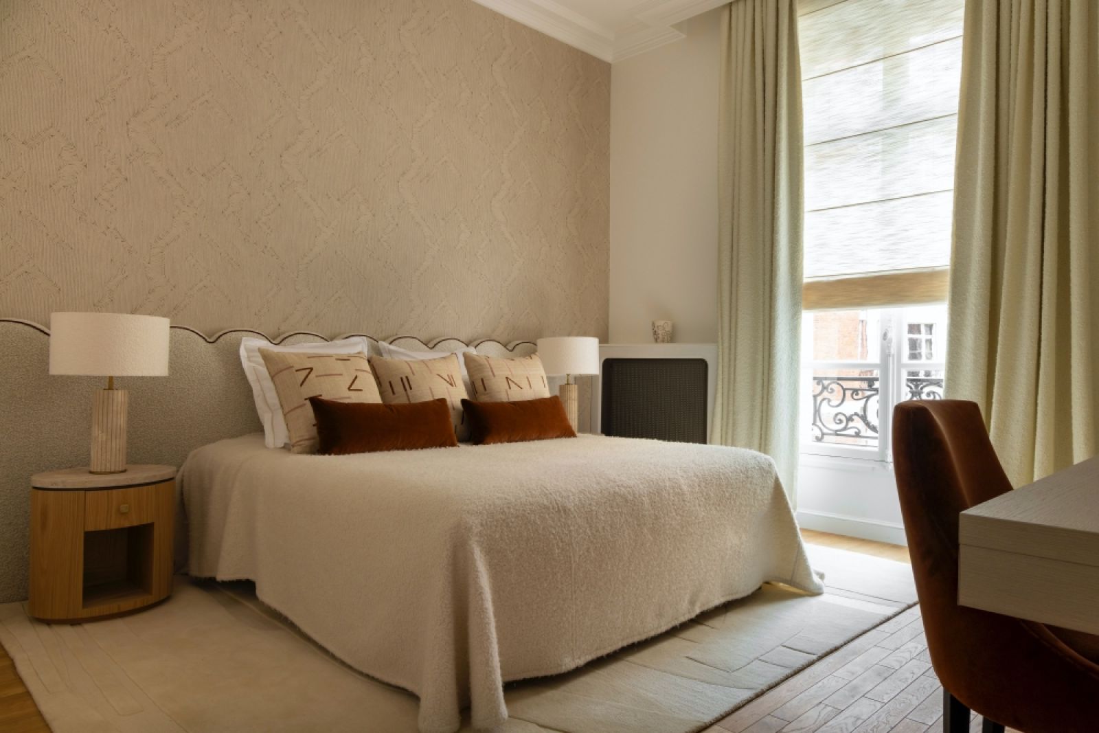 Na zamówienie powstało także łóżko do jednej z prezentowanych w tym apartamencie sypialni. Stéphanie zaprojektowała specjalną niszę zwieńczoną łukiem, w której zostało ustawione. Takie rozwiązanie zapewnia jeszcze więcej intymności i przytulności. Prosty, ale komfortowy mebel w stylu kontynentalnym, został starannie nakryty wysokiej jakości tkaninami oraz warstwami poduch w dekoracyjnych poszewkach. Wysoki zagłówek, tapicerowany szlachetnym materiałem o grubym splocie, wypełnia wnękę na całej jej szerokości.