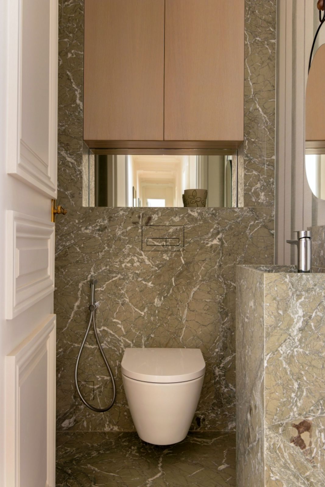 Naturalne kamienie nadają wszystkim łazienkom w apartamencie wyjątkowego sznytu. W mniejszej gościnnej toalecie, zachwyca zjawiskowy marmur o nietypowym wybarwieniu w oliwkowej zieleni i siatką biało-szarych żyłek. Dużą rolę gra we wszystkich łazienkach światło, które pięknie podkreśla strukturę kamiennych okładzin i blask szczotkowanego mosiądzu.