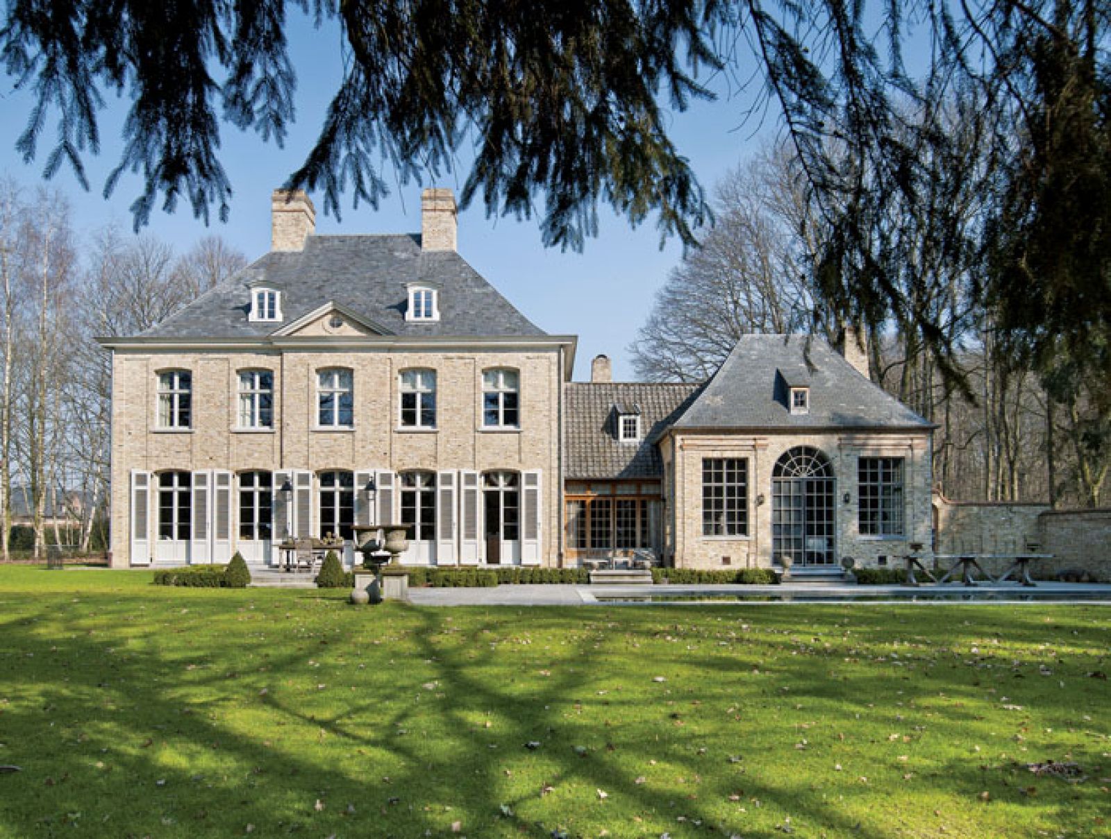 Dom powstał w szczerym polu. Architekt Peter Bovijn postawił na belgijską klasykę, z charakterystycznymi wysokimi dachami, jakby ciut przymałymi w stosunku do całości. Aby dodać dziełu wiarygodności, elewację kazał obłożyć cegłą z odzysku, a na dachu znalazły się łupkowe dachówki, też zresztą nie najmłodsze. Zaplanował również drewniane okna z pięknie dzielonymi szybami, w budynku niższym zaś – stalowe, żeby zabić monotonię. Tyle z zewnątrz.