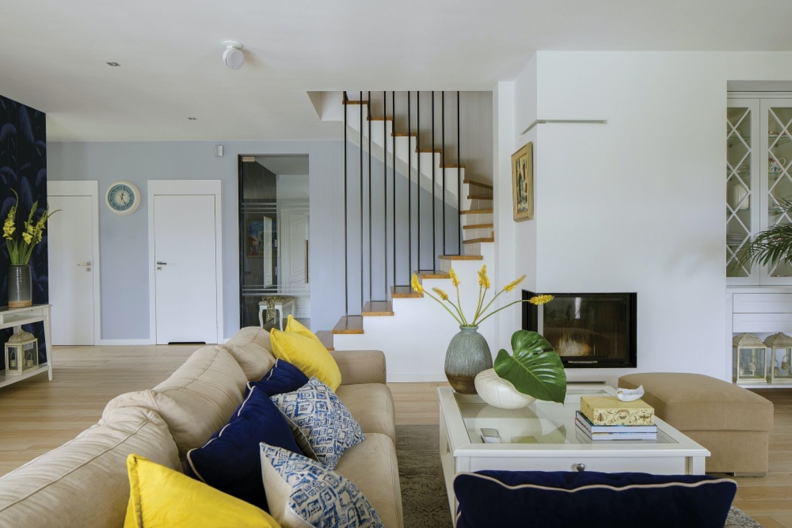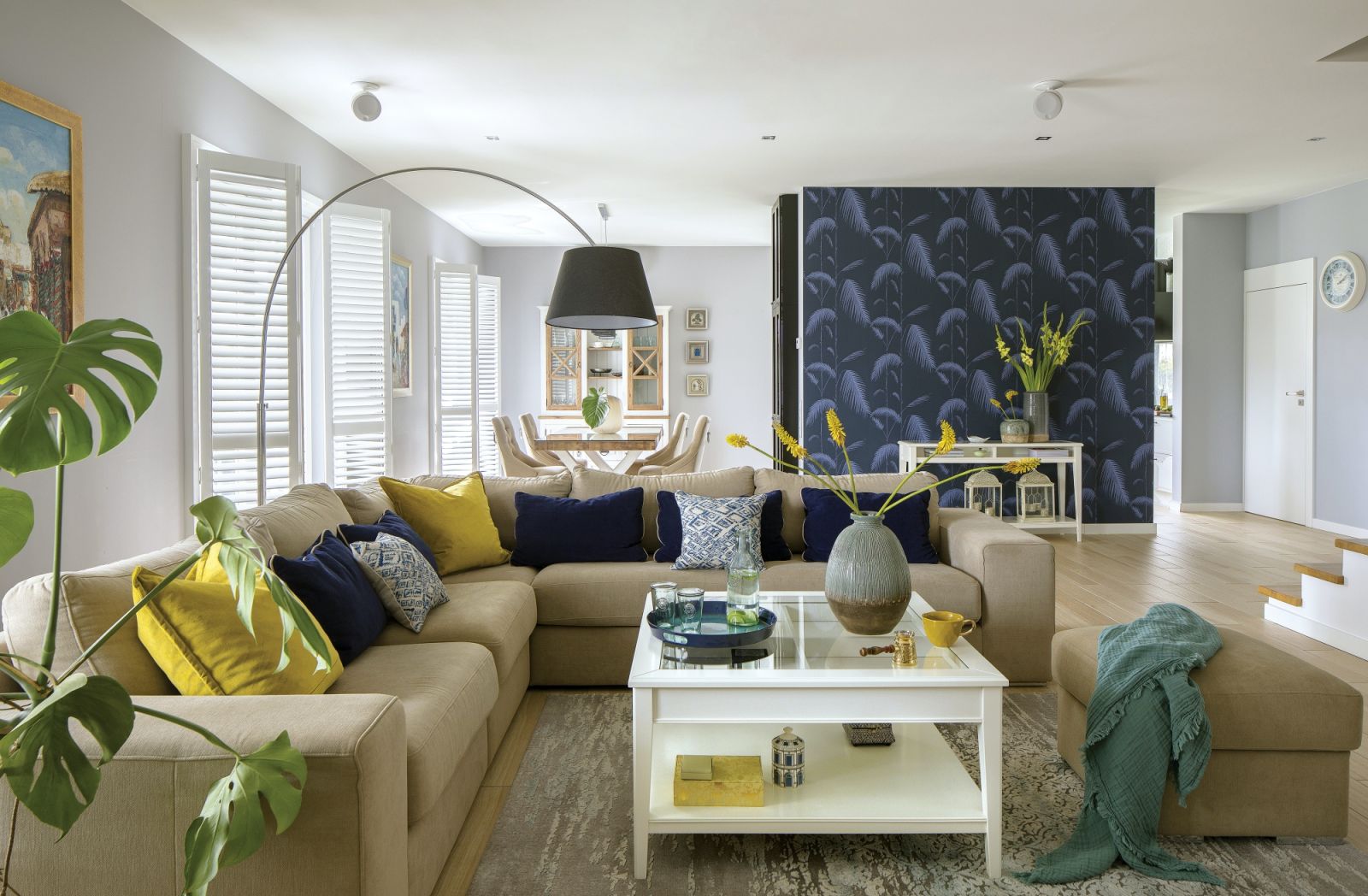 Pan Mehdi obawiał się, że granatowa tapeta w palmowe liście, którą zaproponowałam w holu, a powtórzyłam w salonie, jest za ciemna. Na szczęście dał się przekonać mnie i żonie, której bardzo przypadła do gustu.