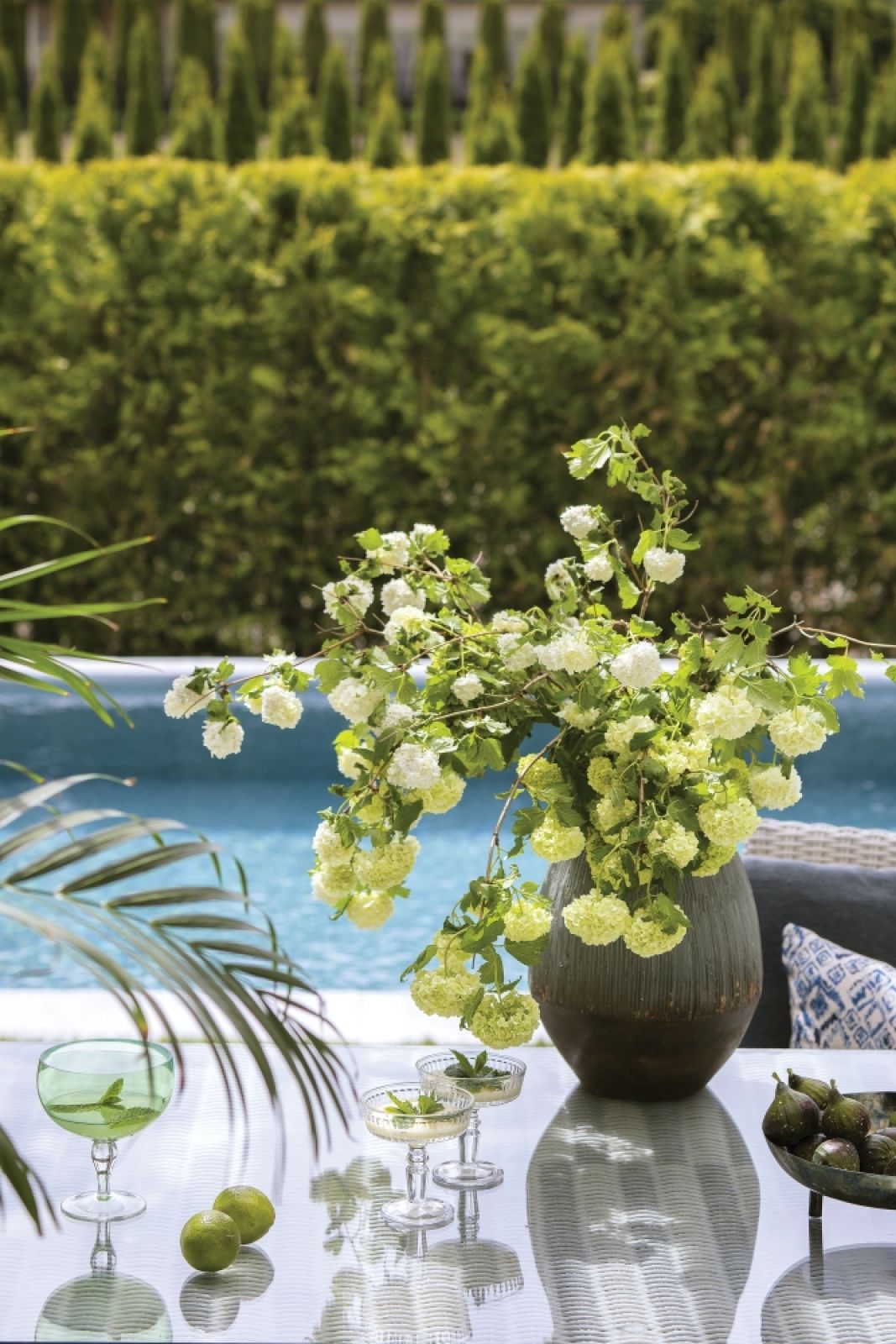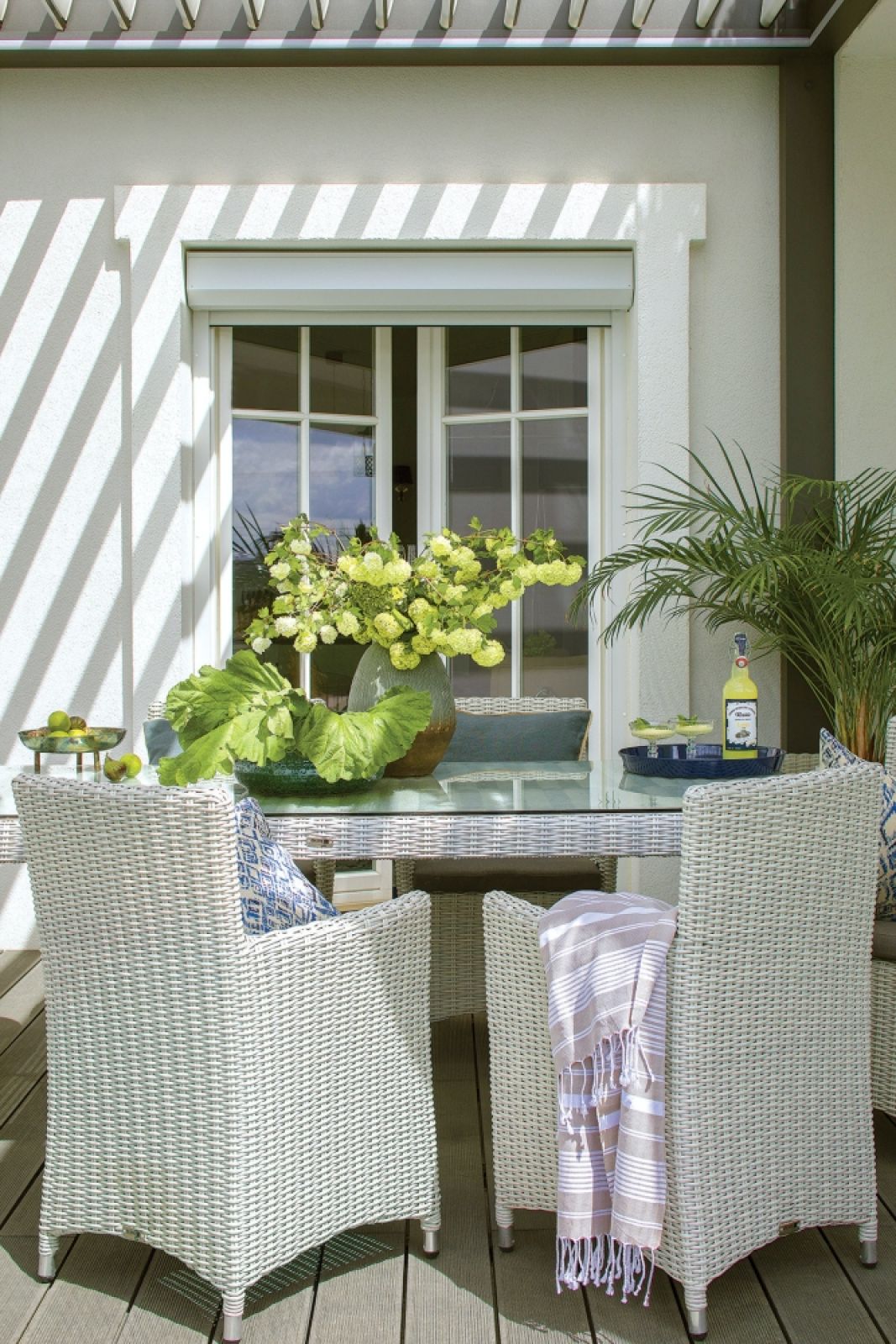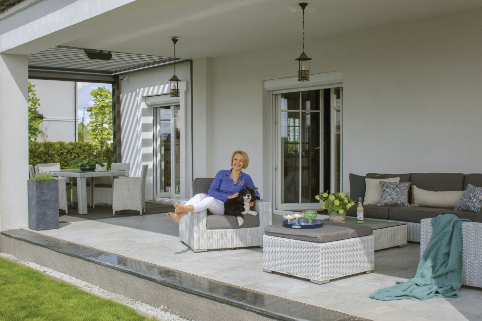 Latem Joanna każdy dzień zaczyna podobnie – od swojego rytuału. W małym tygielku przyrządza aromatyczną kawę po turecku i siada z nią na tarasie. Jeśli starcza jej czasu, medytuje. – Witam dzień i naturę – mówi. – To moje pół godziny bez telefonu i internetu. Taras to miejsce, które lubi najbardziej w swoim domu. Dla niego zrezygnowali z mężem z ogrodu zimowego, który zaplanował tu projektant. I nie żałują. Przydaje się nie tylko na poranny rytuał, ale i do przyjmowania gości, a tych przewija się przez ich dom sporo. – Czujemy się tu, jakbyśmy biesiadowali gdzieś w rejonie Morza Śródziemnego – opowiada właścicielka. – Tym bardziej że od tego roku mamy jeszcze basen.