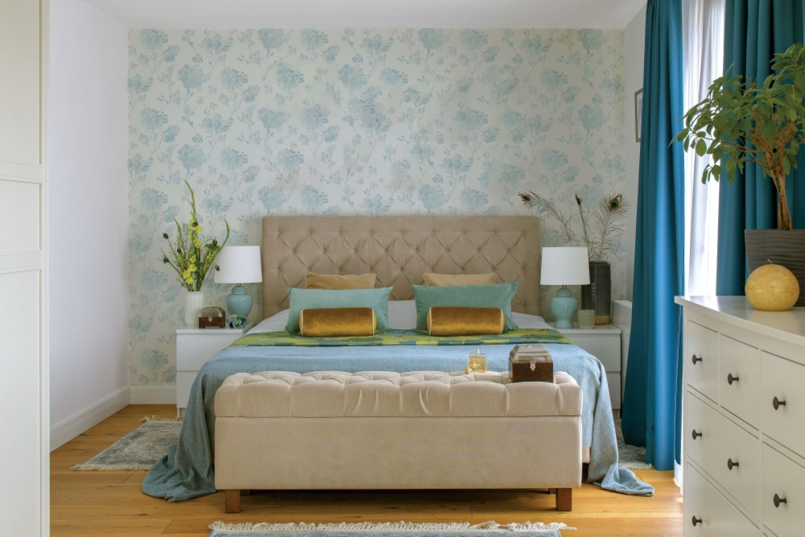 Udało się spełnić i inne marzenie właścicieli – o dużej czarnej lodówce. Ten mocny akcent mógł zdominować jasne i lekkie wnętrze, ale projektantka dodała kilka czarnych akcentów w całej dziennej części, która jest otwartą przestrzenią. Na granicy kuchni i salonu pojawiła się czarna witryna, w tym samym kolorze są uchwyty szafek, blaty z granitu, lampy, okap oraz barierka schodów prowadzących na piętro. – Za to sypialnię chcieliśmy mieć pastelową – mówi Joanna. – Spokojną, która będzie naszą oazą, bo jesteśmy aktywni zawodowo i sporo podróżujemy. Stąd stonowane błękity, delikatna tapeta w kwiaty i łóżko z beżowym pikowanym zagłówkiem.