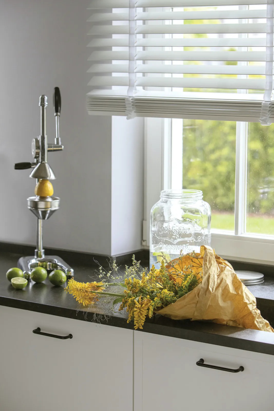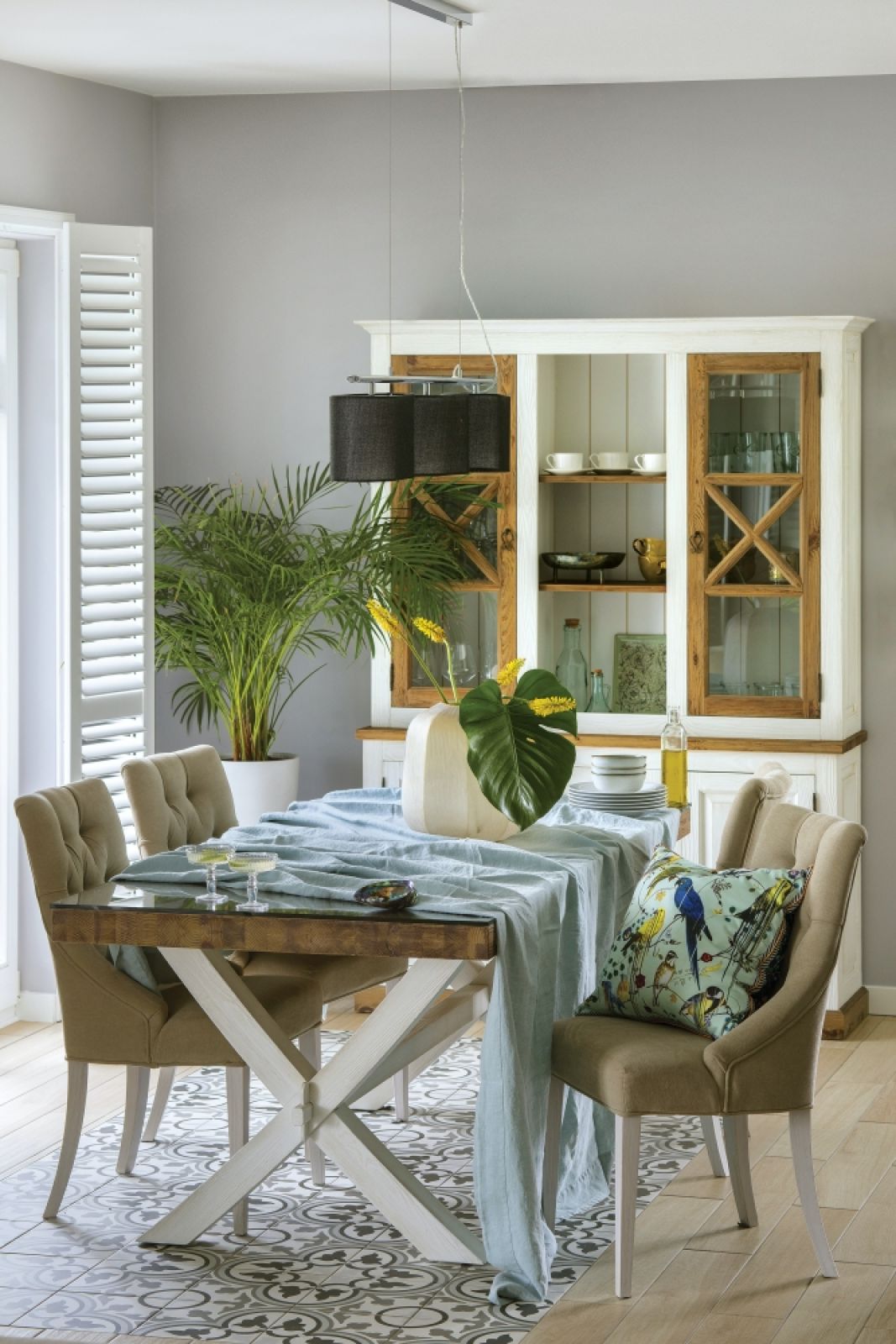 – Właścicielom zależało, by wnętrze było jednocześnie nowoczesne, przytulne i klasyczne i by pojawiły się w nim akcenty znad Morza Śródziemnego – opowiada projektantka Agnieszka Szymańska-Konik z Instudio, która pomogła spełnić marzenia o idealnym domu. – Do kilku rzeczy musiałam ich przekonywać, ale na szczęście efekt im się podoba. Przede wszystkim do szarych ścian – chcieli, by były białe. A przecież na szarym tle tak efektownie wyglądają białe shuttersy.