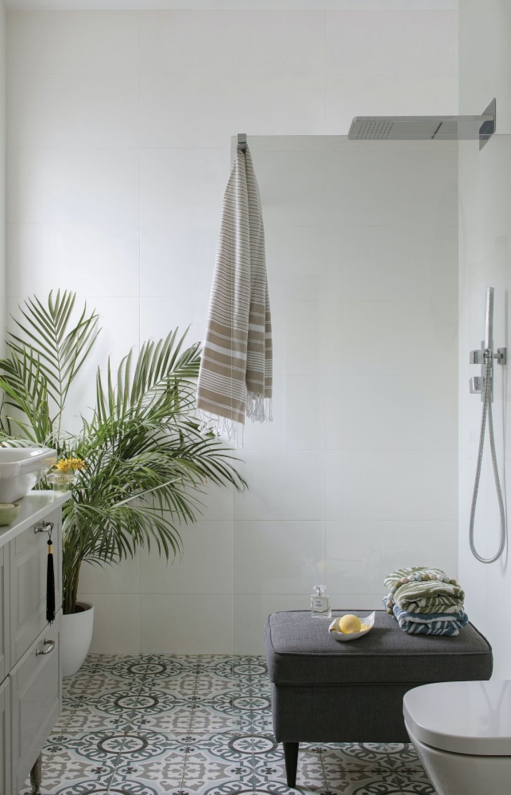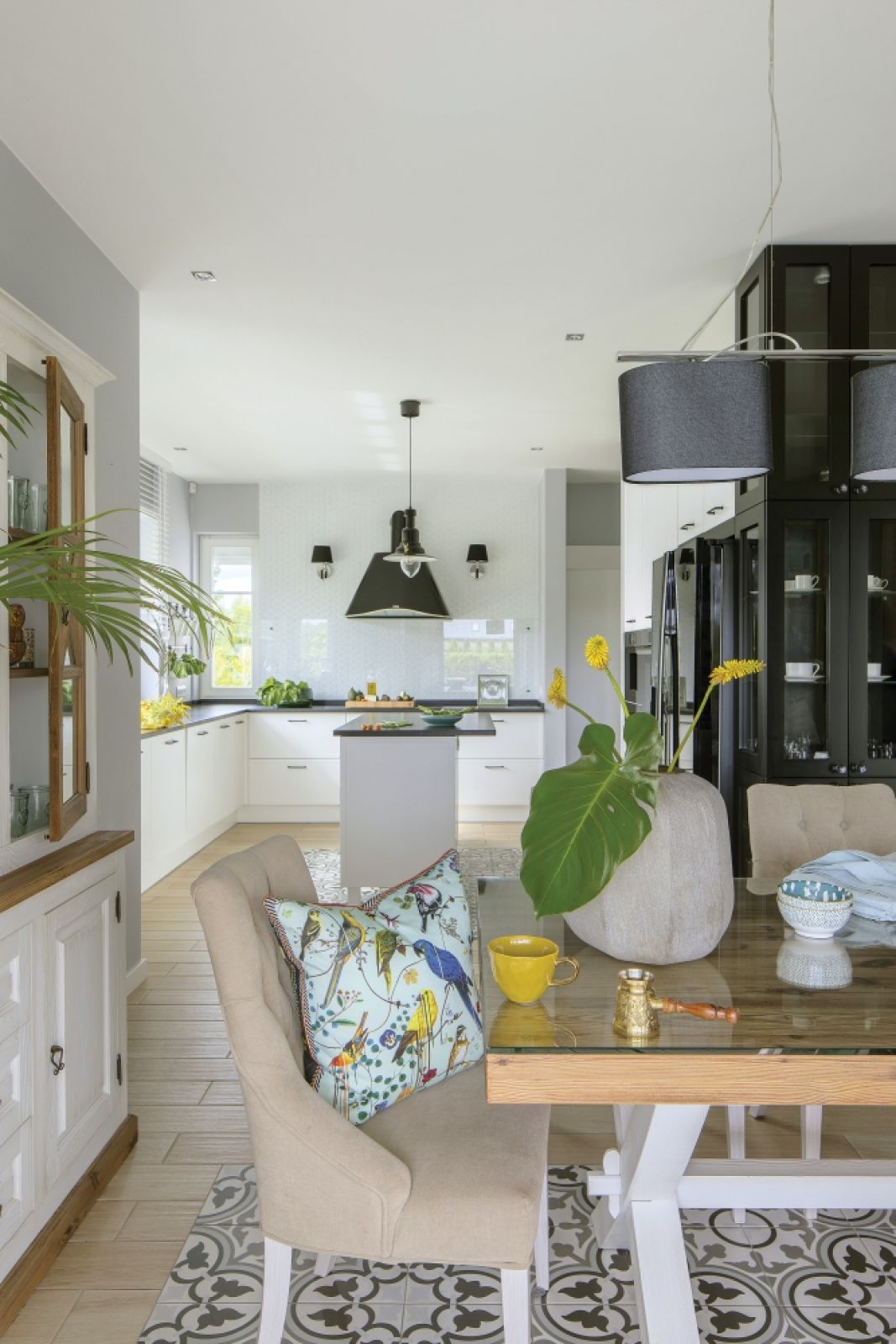 Pojawiły się też nawiązania śródziemnomorskie, ale bardzo subtelne. Jak na przykład kafelki w marokańskim stylu ułożone niczym dywan na podłodze pod jadalnianym stołem. Wzorzyste płytki są również w głównej łazience, na podstopniach schodów i na kuchennej ścianie.