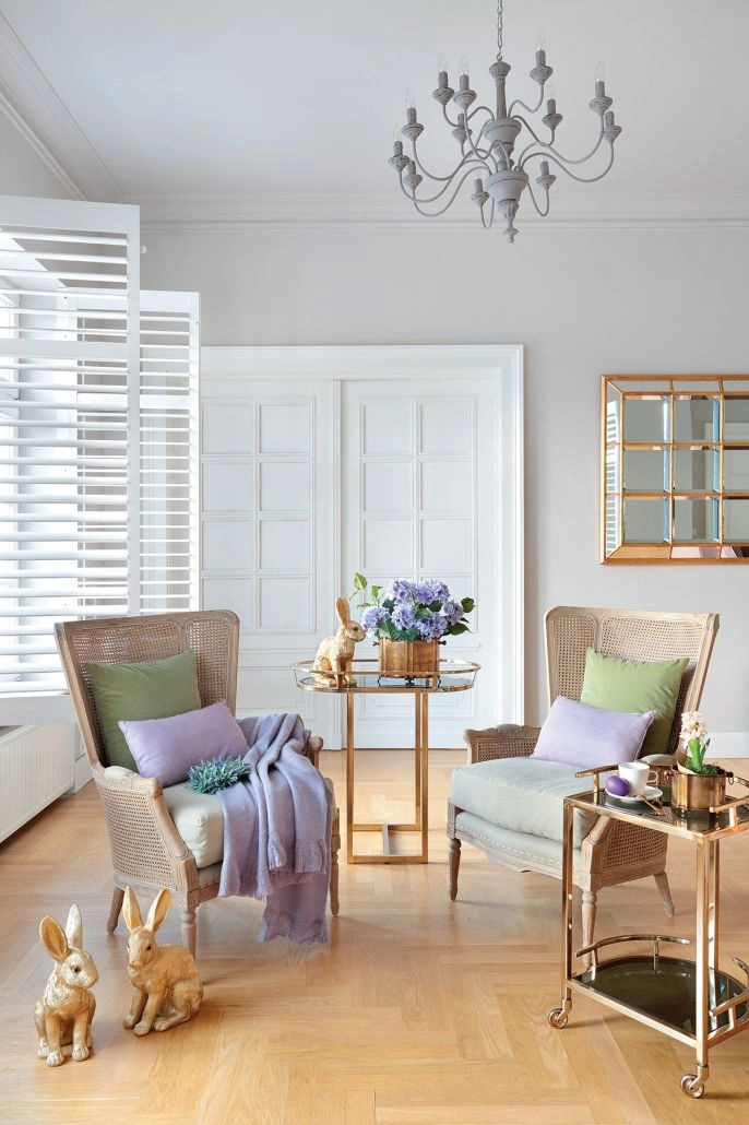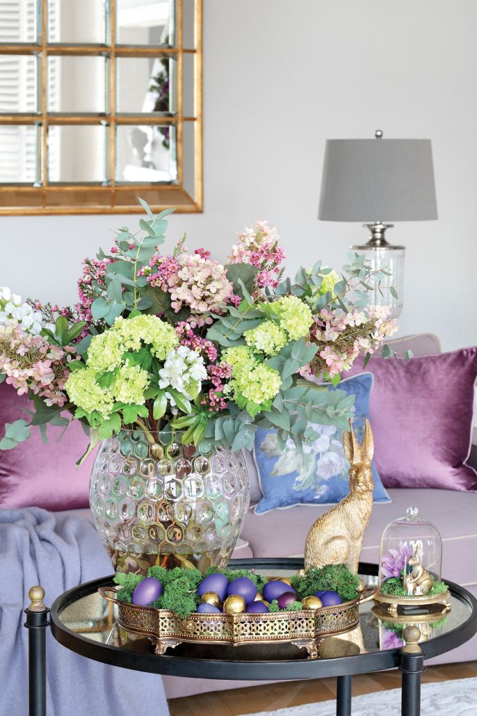 Polski dwór urządzony z francuskim rozmachem. Udekorowano go na Wielkanoc w fioletowo-zielonych kolorach