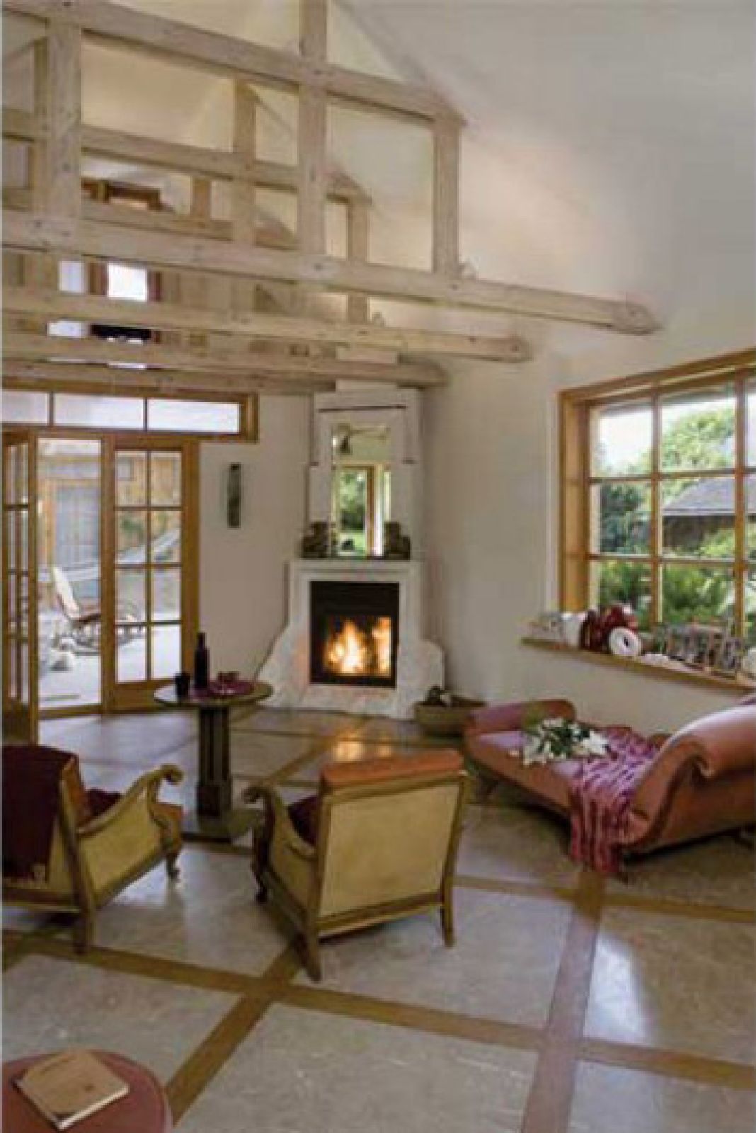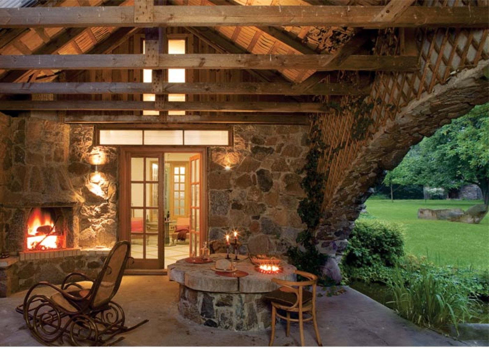 W projekcie własnego domu pan Czesław śmiało sięgnął po polskie wzory i tradycyjne materiały. Teraz posiadłość, niczym dawna stanica, otacza podwórze, z którego właściciel uczynił ogród wewnętrzny. Dwa skrzydła budynku łączy zadaszony taras pod kamienną arkadą. Podobny łuk w pochyłej ścianie wschodniej tworzy główne wejście do domu. Elewacje południowa i wschodnia są z kamienia, pozostałe oszalowano deskami.