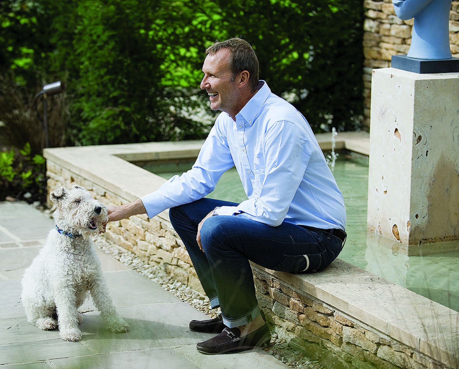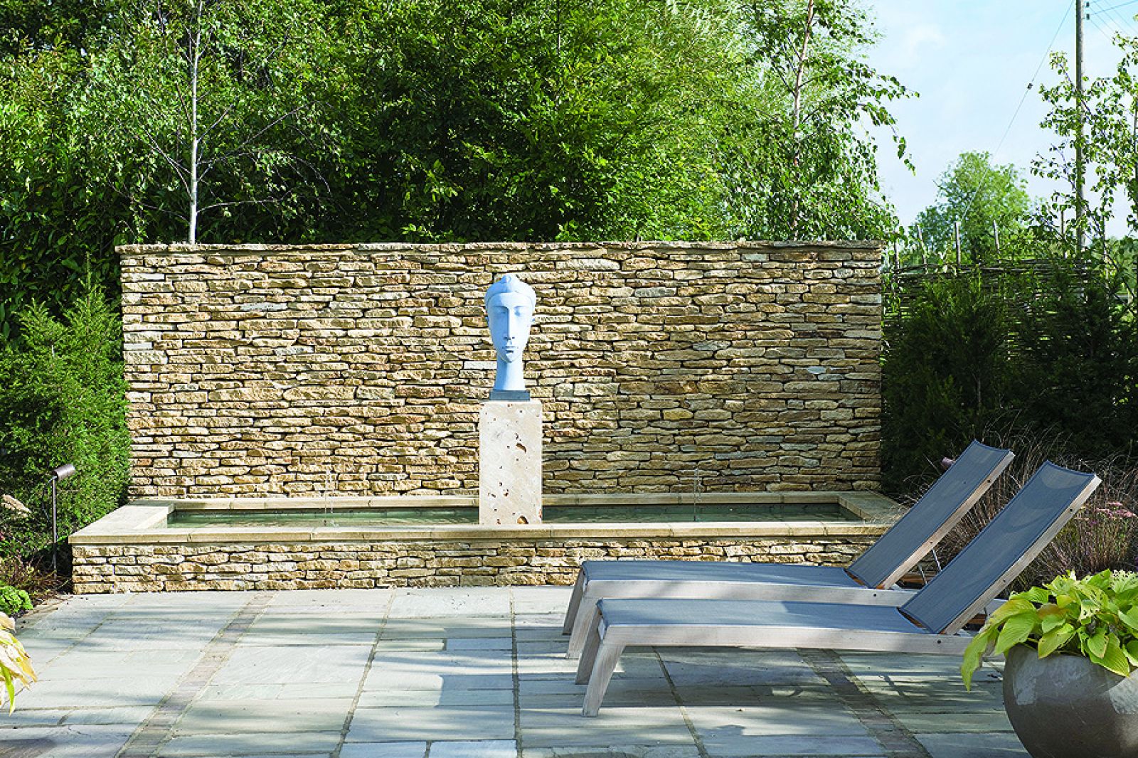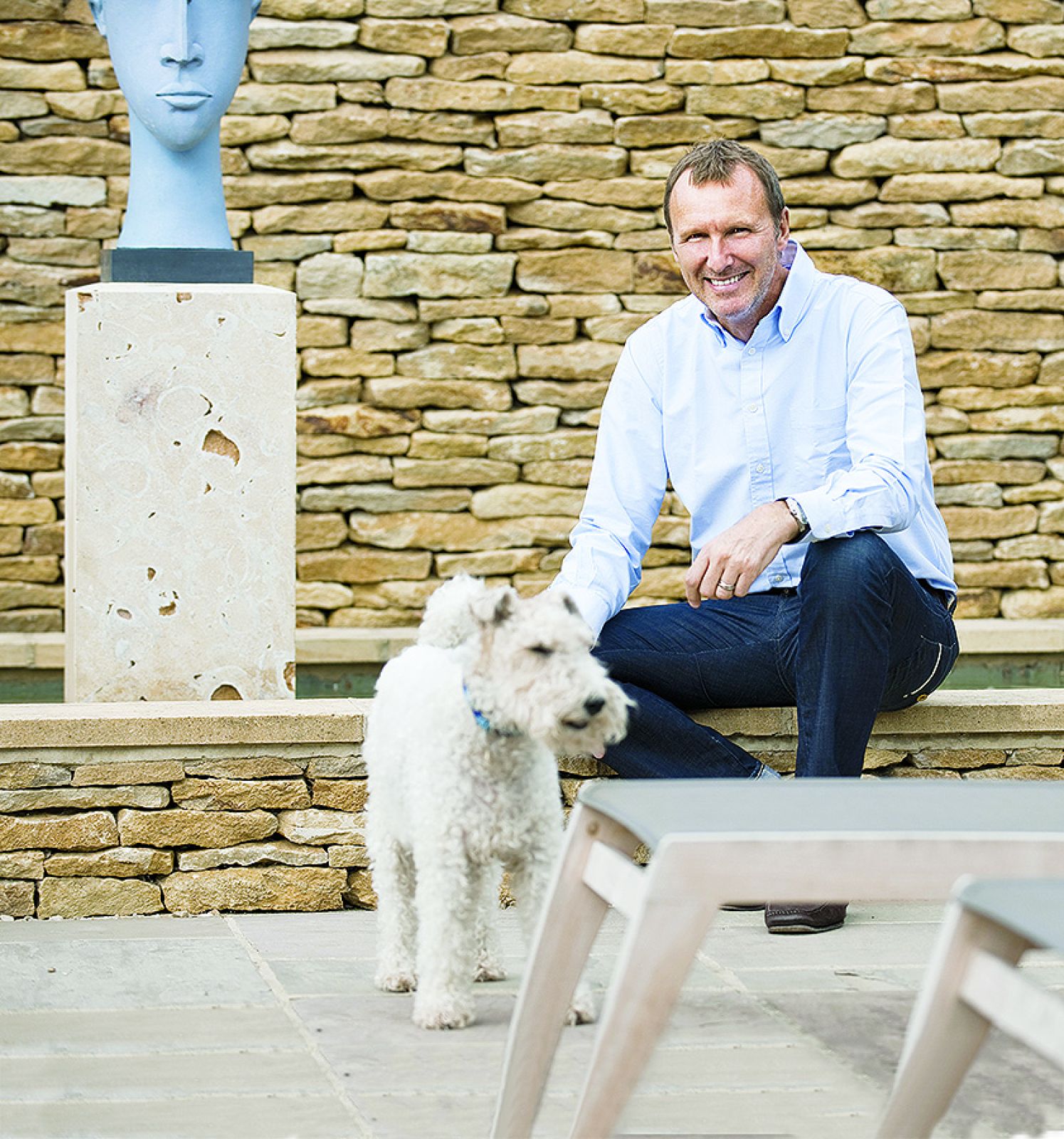 – Stać mnie było i na prostokątny basenik, który tam widziałem, i na kamienny murek, ale na oryginalną pracę Miró już nie – żartuje David i zaraz dodaje, że nie ma tego złego... Wyrzeźbiona przez irlandzką artystkę Patricię Volk głowa, którą ustawił na postumencie na tle miodowej kamiennej ściany, należy do ulubionych dzieł z jego kolekcji.