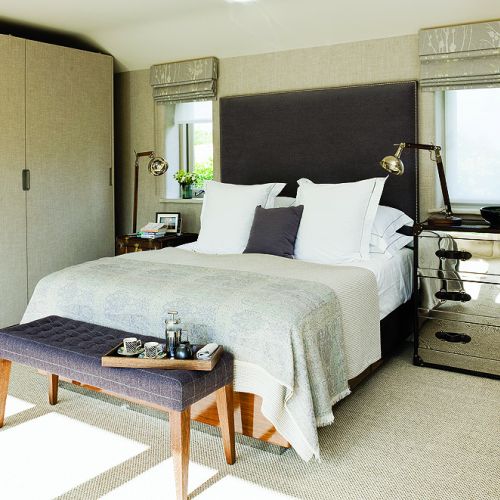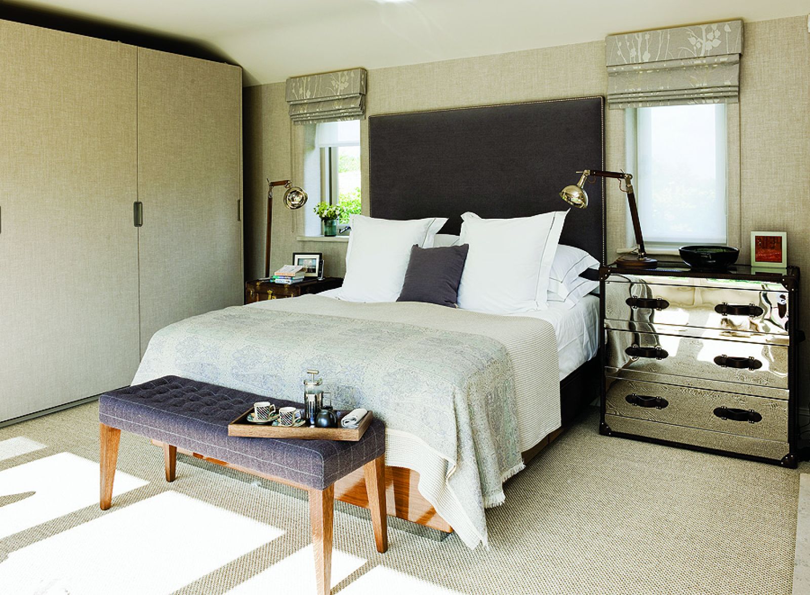 Okazało się, że wystarczy kilka kosmetycznych zmian, by posiadłość stała się przytulna, na czym tak mu zależało. Zaczął od przykrycia przemysłowego parkietu miękką wykładziną w tym samym odcieniu co tapety na ścianach. Potem zmienił oświetlenie, bo dawne halogeny nie dość, że dawały za ostre światło, to jeszcze podkreślały wysoki sufit. Projektant zastąpił je lampami podłogowymi – prosty sposób, by stworzyć kameralną atmosferę, bo wnętrze wydaje się niższe. Jedyną ingerencją w układ pomieszczeń było dobudowanie wnęki łazienkowej w sypialni. W razie potrzeby można ją zamknąć. Dawniej tę część domu zajmowała powozownia, stąd tak wysokie okna – od podłogi do sufitu – które wstawiono w miejsce bramy wjazdowej.