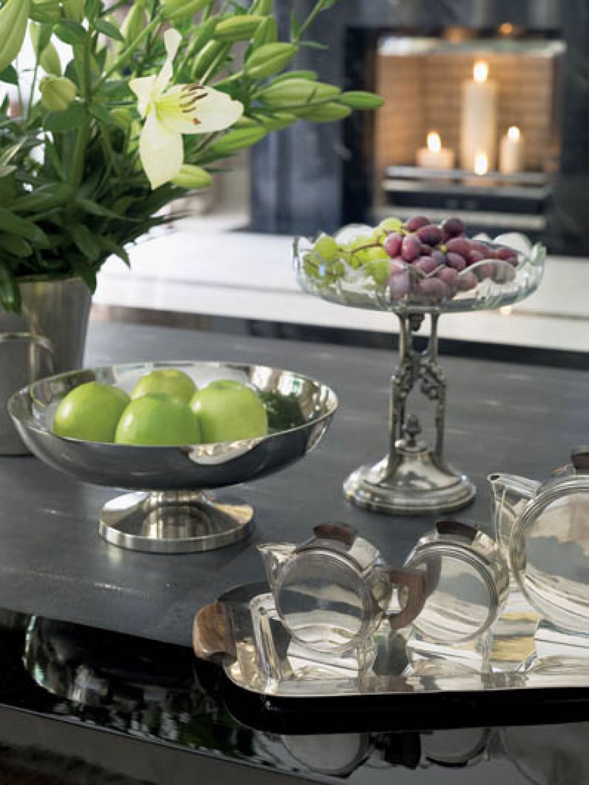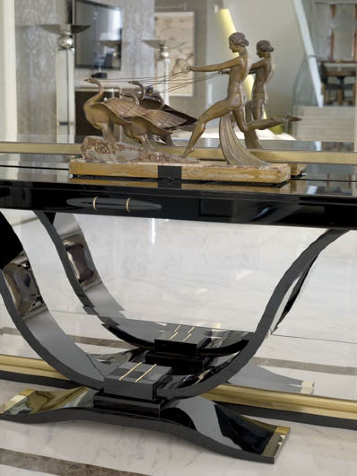 Kwadratowy stolik pokaźnych rozmiarów, z blatem z masy perłowej, który sobie upatrzyłam, ktoś sprzątnął mi sprzed nosa. Wtedy Antonina z Paryża sprowadziła ławę z blatem ze skóry rekina. Ma tam znajomego sprzedawcę rzeczy niebanalnych, Antoine’a Turrou. A potem zupełnie ją przerobiła: zmieniła fornir, polakierowała na czarno, przefarbowała skórę i dodała nóżki.