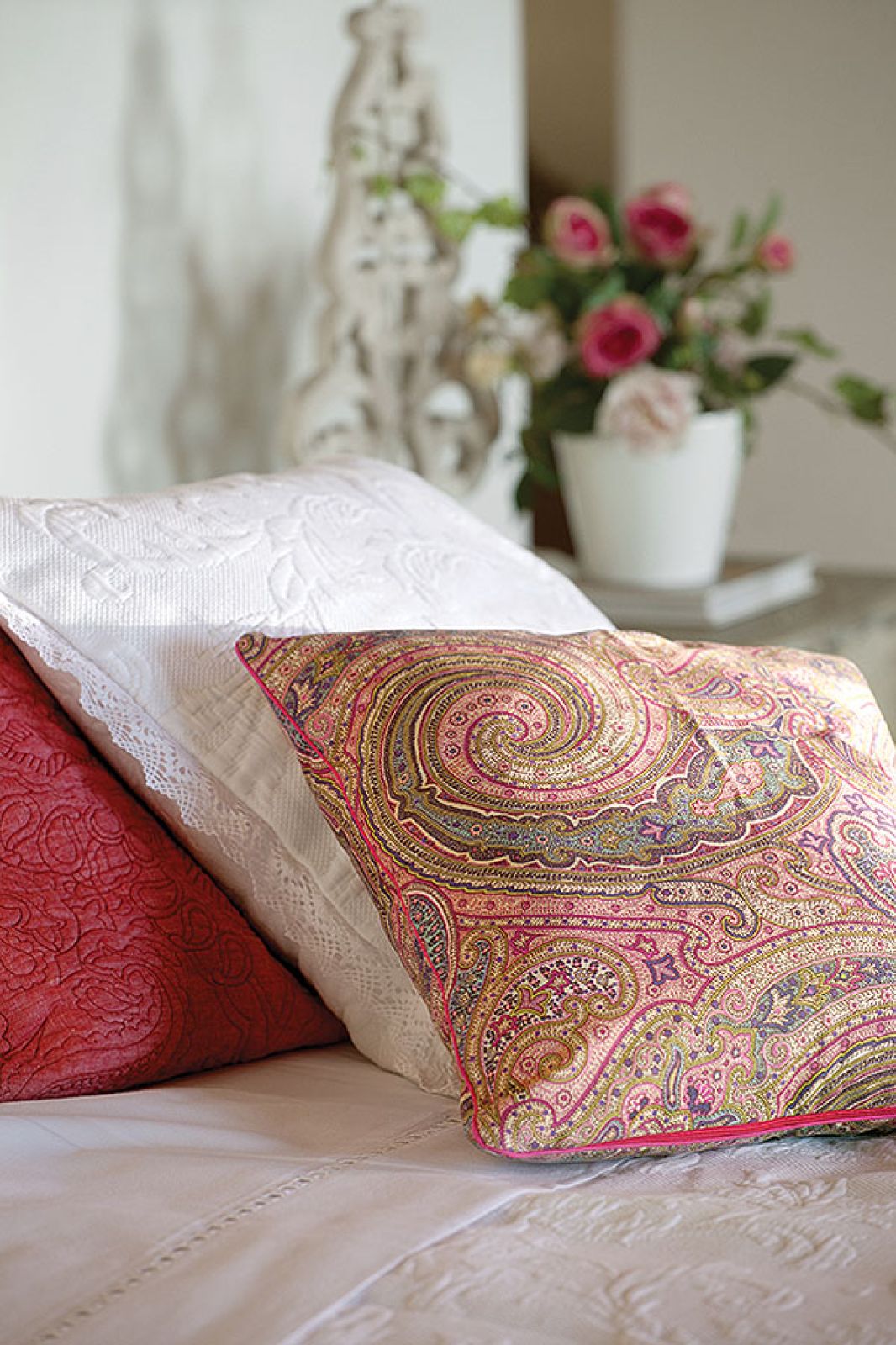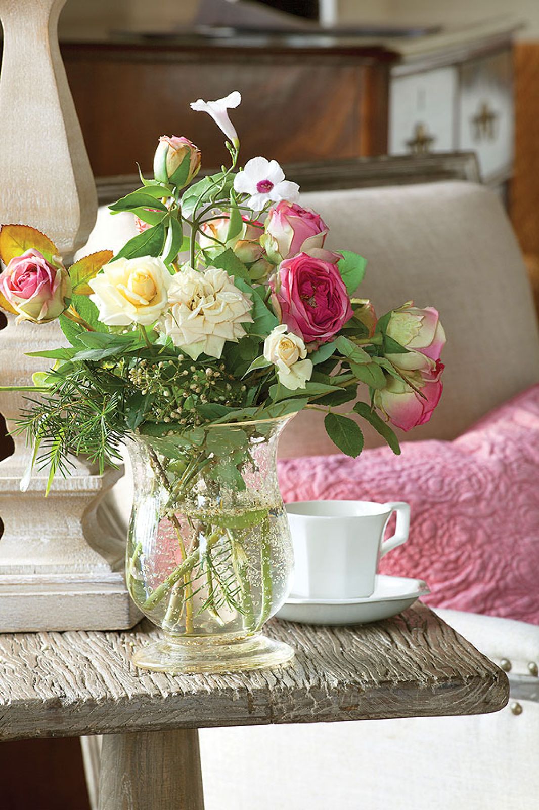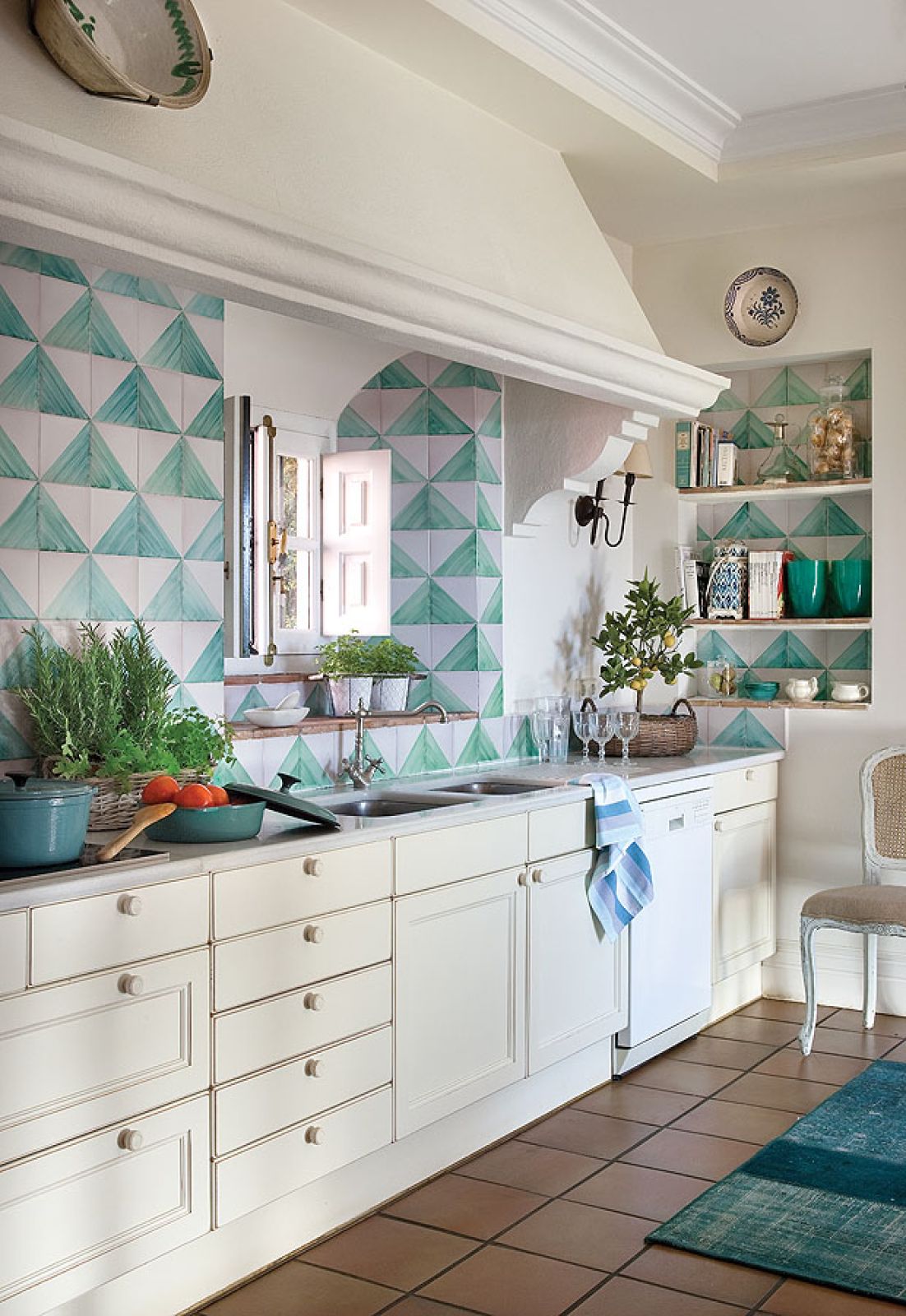 Choć wszystkie drzwi całymi dniami otwarte są na przestrzał – z każdego pokoju na parterze można wyjść do ogrodu, a z kuchni do warzywnika i sadu cytrusowego – udało się stworzyć kameralny klimat. To dzięki ulubionym kącikom gospodarzy: w salonie można przysiąść przed kominkiem (który wygląda jak palenisko sprzed wieku, a ma dopiero 13 lat, podobnie jak dom) albo przycupnąć z książką w okiennym wykuszu. Jasne pokoje, fotele obite surowym lnem, terakotowe płytki zrobione w lokalnej manufakturze, kosze i dywany wyplatane z rafii tworzą klimat wakacyjnej sjesty.