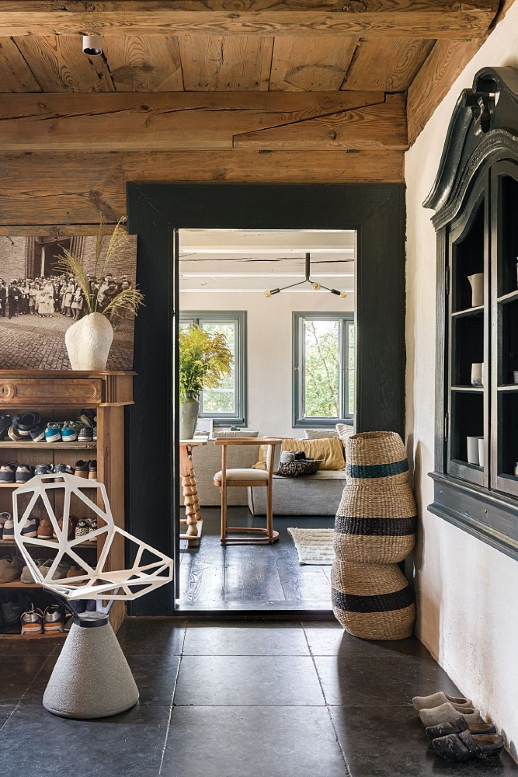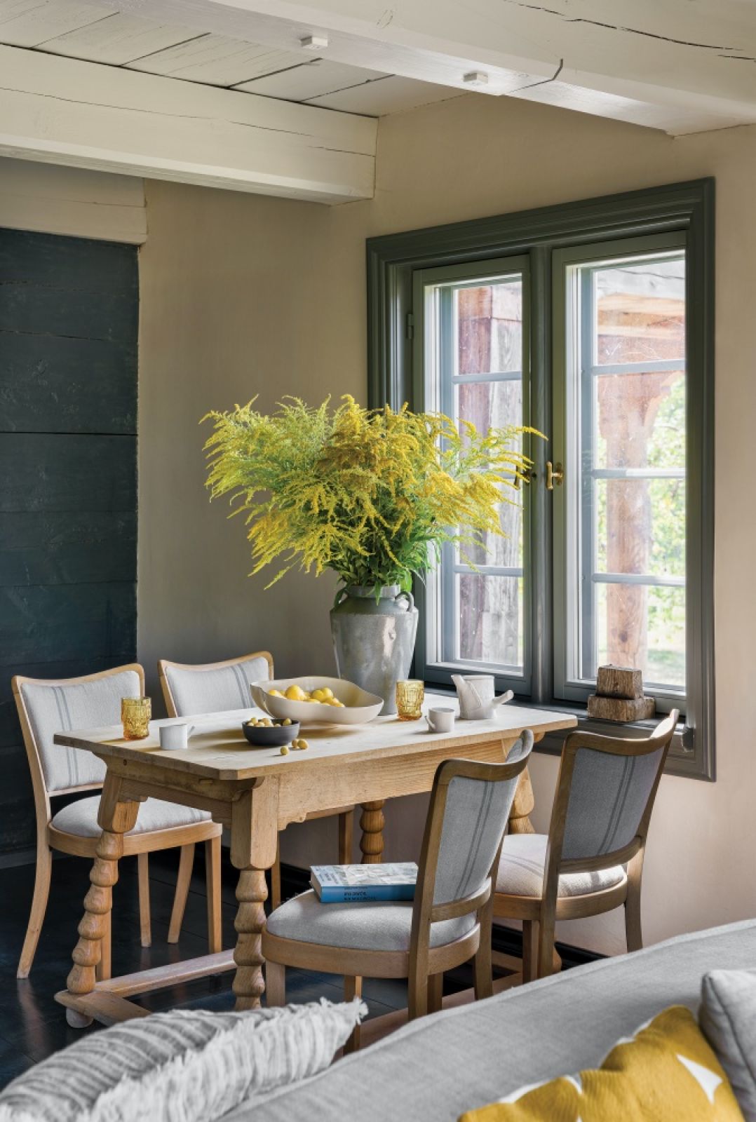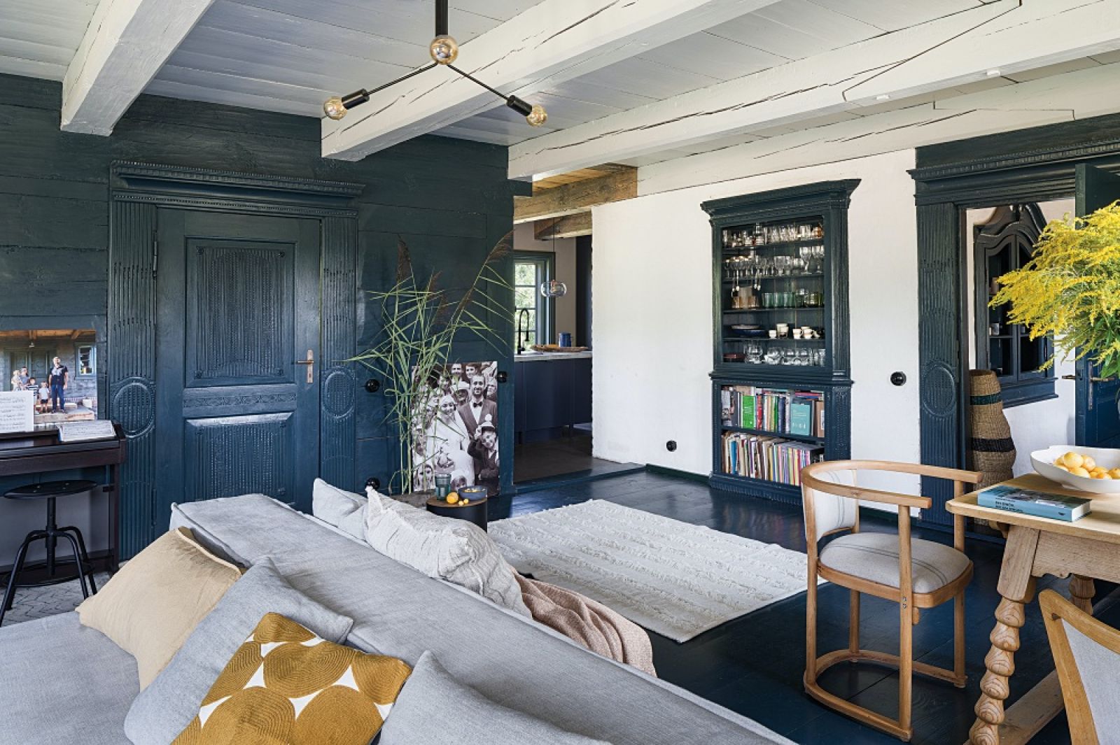 Kasi bardzo zależało, żeby uratować, co się da. Oryginalne są drzwi, opaski okienne, parapety i rzeźbione słupki w oknach, a także część dachówek, które trafiły nad podcienie (reszta pochodzi z odzysku z innego starego budynku). W salonie ocalał kredens wbudowany w ścianę – nie przetrwały tylko drzwiczki, więc jest dziś otwartą półką. Projektantka zachowała też tzw. świadki historyczne, czyli oryginalne elementy, takie jak ślady na ścianie po dawnych stromych schodach obok tych współcześnie wybudowanych albo miejsce, gdzie belki były łączone drewnianymi kołkami. Z kolei w małej jadalni na ścianie widoczna jest patyna – resztki dawnej farby w kolorze pruskiego błękitu, których celowo nie zamalowano. Po badaniach oryginalnych barw okazało się, że inne ściany były jaskrawe. Ale za zgodą konserwatora Kasia je przemalowała, na przykład w głównej izbie z intensywnej zieleni na ciemną, pomieszaną z granatem. Odtworzyła za to wiernie dwa odcienie szarości na oknach.