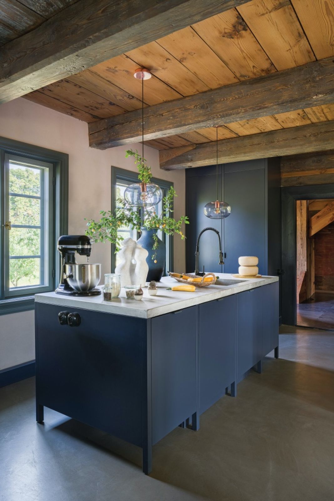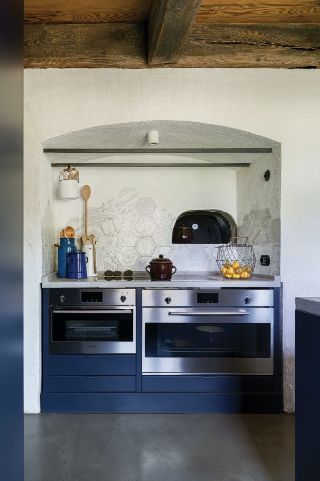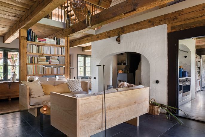 Pod łukiem z cegieł, gdzie kiedyś w kominie (dziś odrestaurowanym) była czarna kuchnia – pomieszczenie z piecem bez okien – stanęła minimalistyczna koza. W miejscu dawnego pieca Kasia zamontowała dwa piekarniki – zwykły i parowy, a powyżej współczesny piec chlebowy, w którym przyrządza ciasta i mięso. Poza nielicznymi antykami wszystkie meble są nowe i bardzo proste, a większość to projekty właścicielki – szara dwustronna sofa w salonie, kanapy jak skrzynki z jesionowych desek, a także spektakularna konstrukcja w sypialni – antresola, na której mieści się kącik biblioteczno-filmowy. Minimalistyczne, z betonowymi blatami są szafki w kuchni i łazience.
