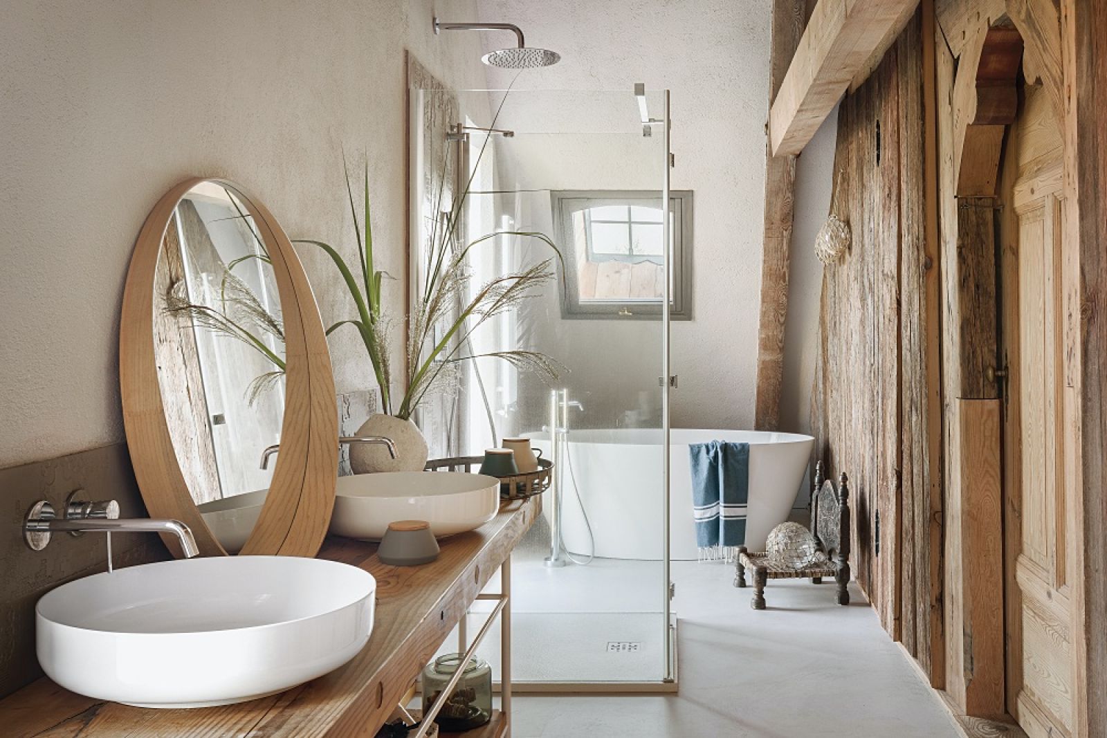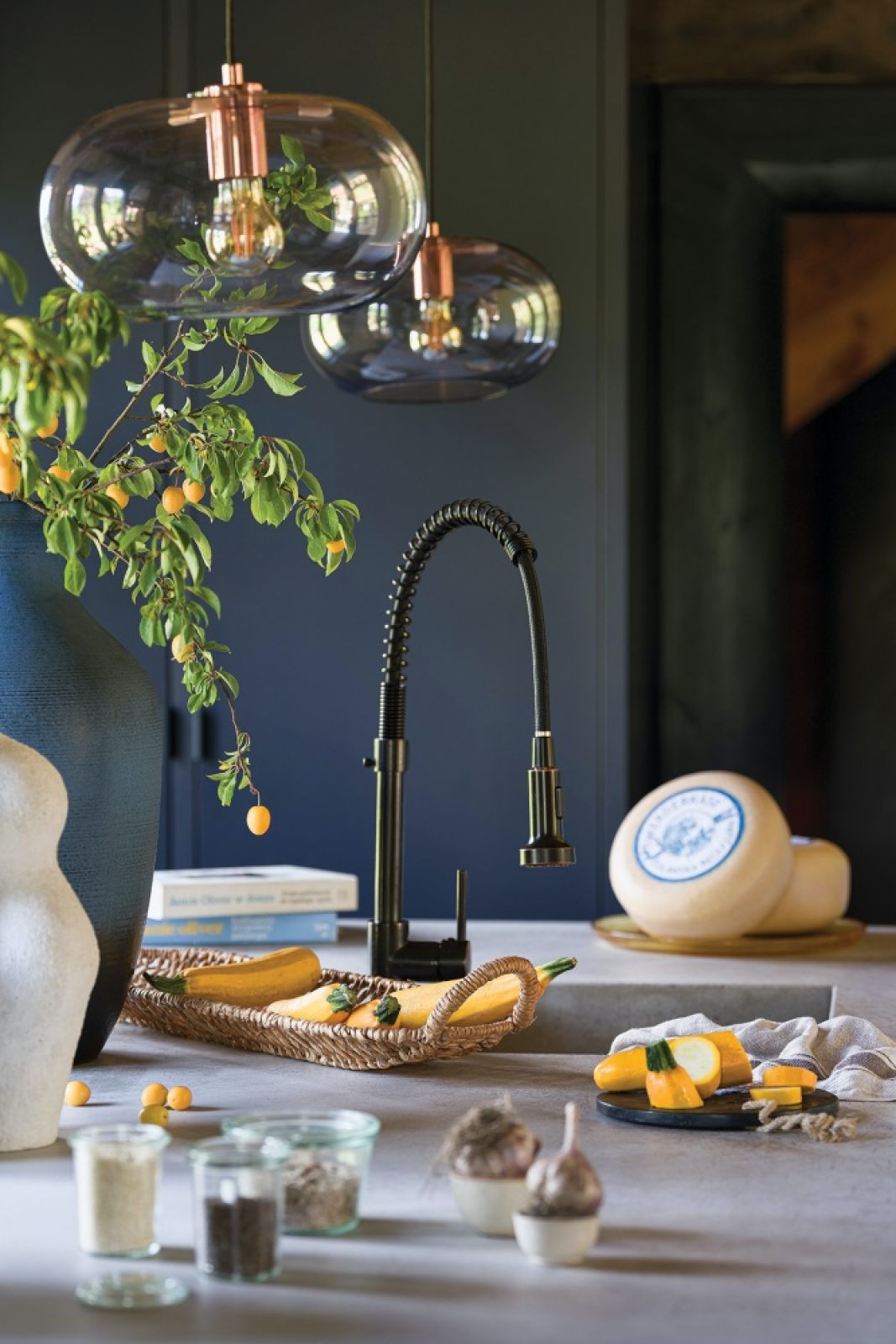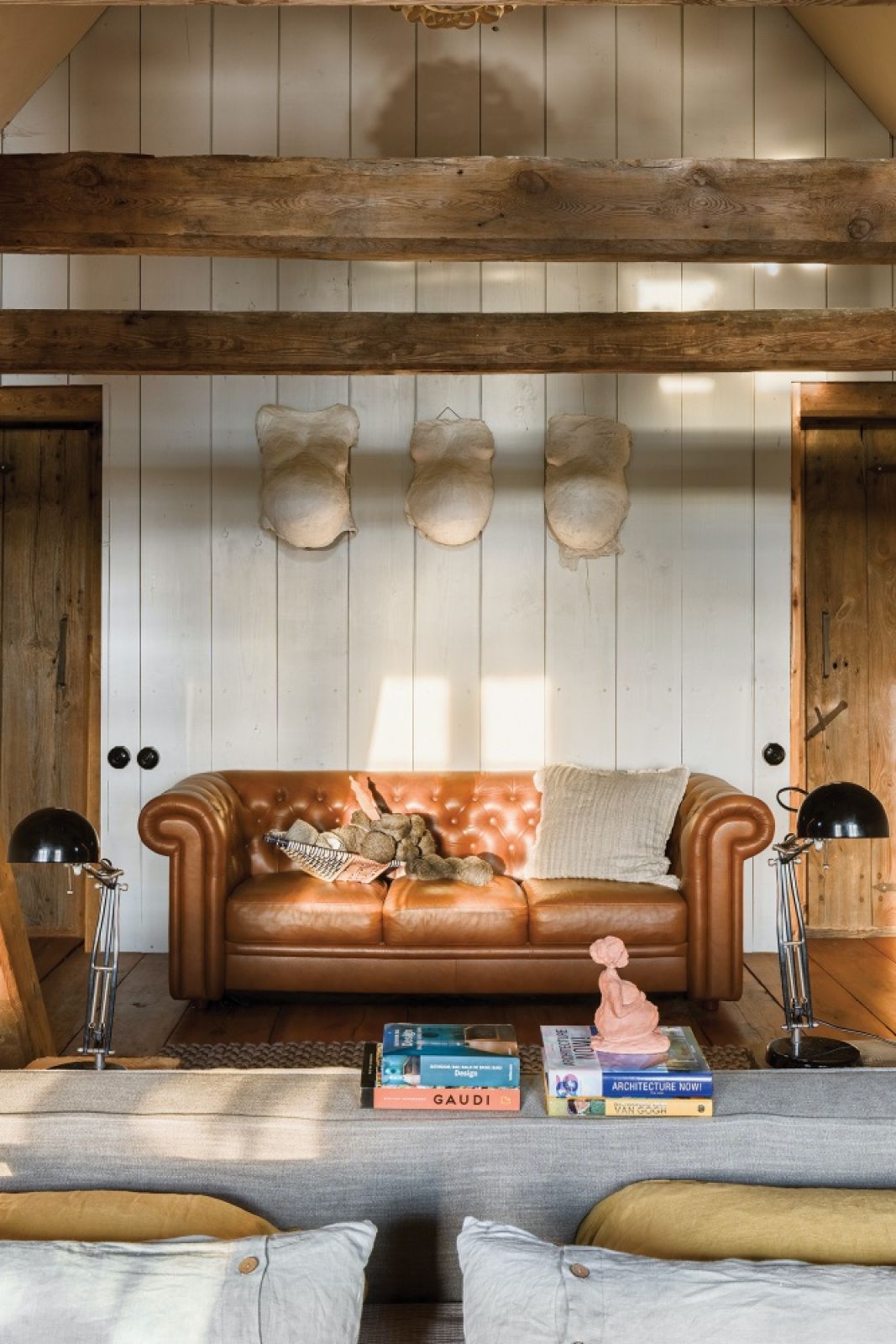 Pod łukiem z cegieł, gdzie kiedyś w kominie (dziś odrestaurowanym) była czarna kuchnia – pomieszczenie z piecem bez okien – stanęła minimalistyczna koza. W miejscu dawnego pieca Kasia zamontowała dwa piekarniki – zwykły i parowy, a powyżej współczesny piec chlebowy, w którym przyrządza ciasta i mięso. Poza nielicznymi antykami wszystkie meble są nowe i bardzo proste, a większość to projekty właścicielki – szara dwustronna sofa w salonie, kanapy jak skrzynki z jesionowych desek, a także spektakularna konstrukcja w sypialni – antresola, na której mieści się kącik biblioteczno-filmowy. Minimalistyczne, z betonowymi blatami są szafki w kuchni i łazience.